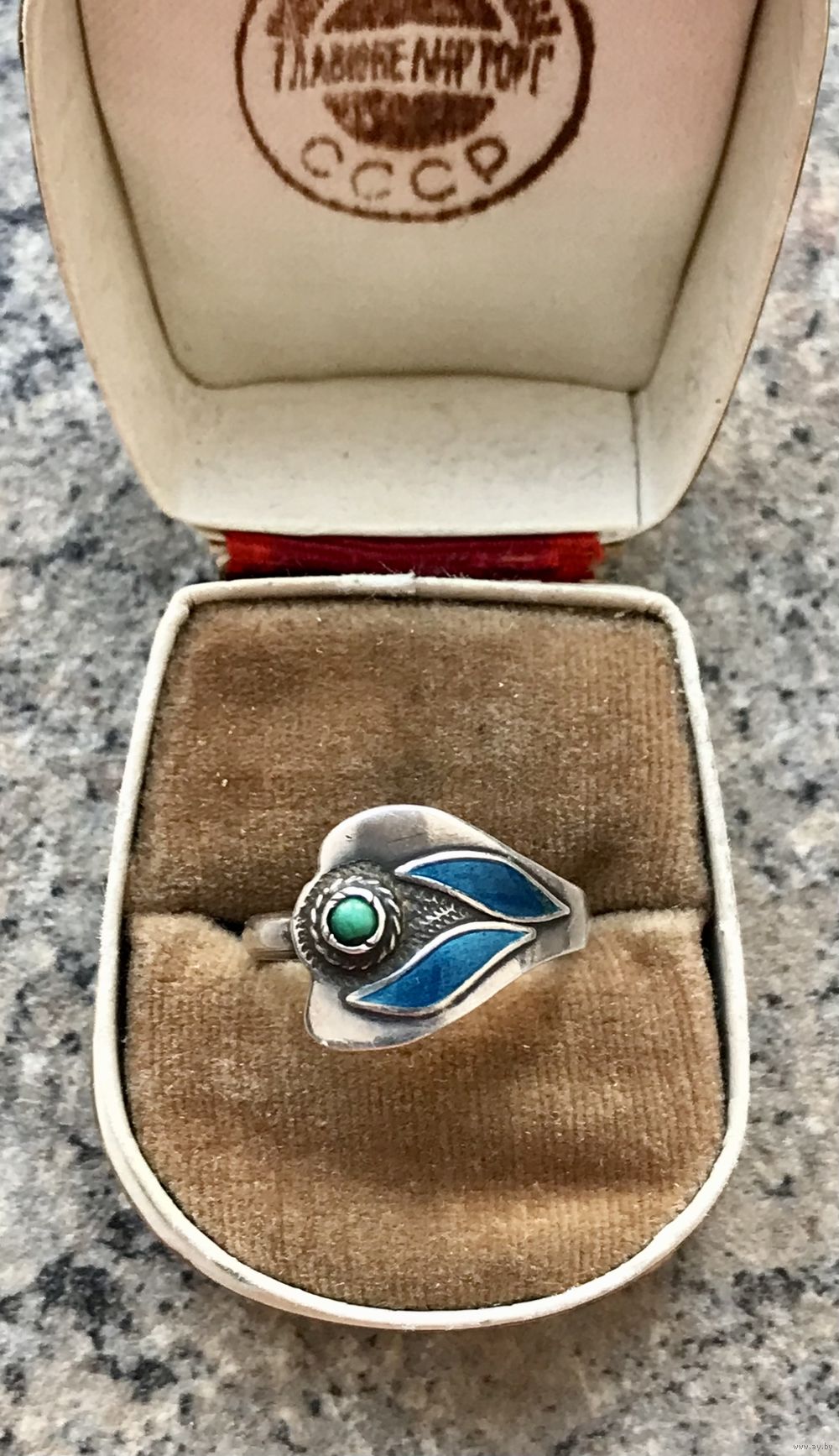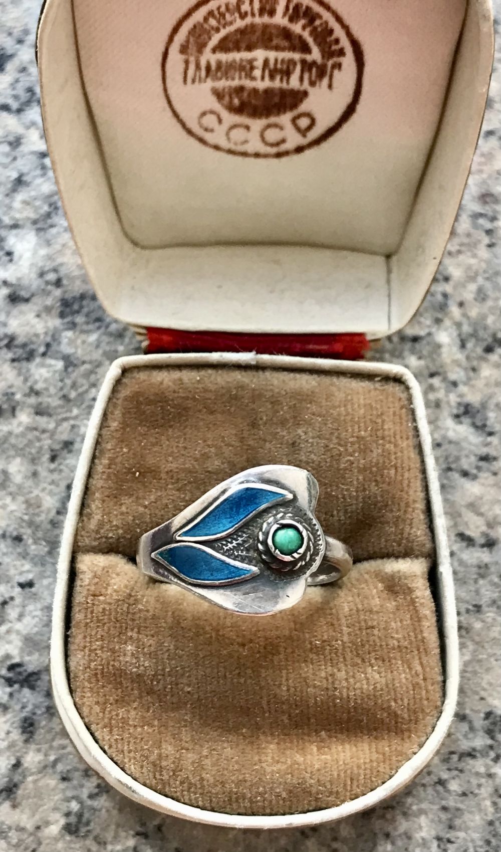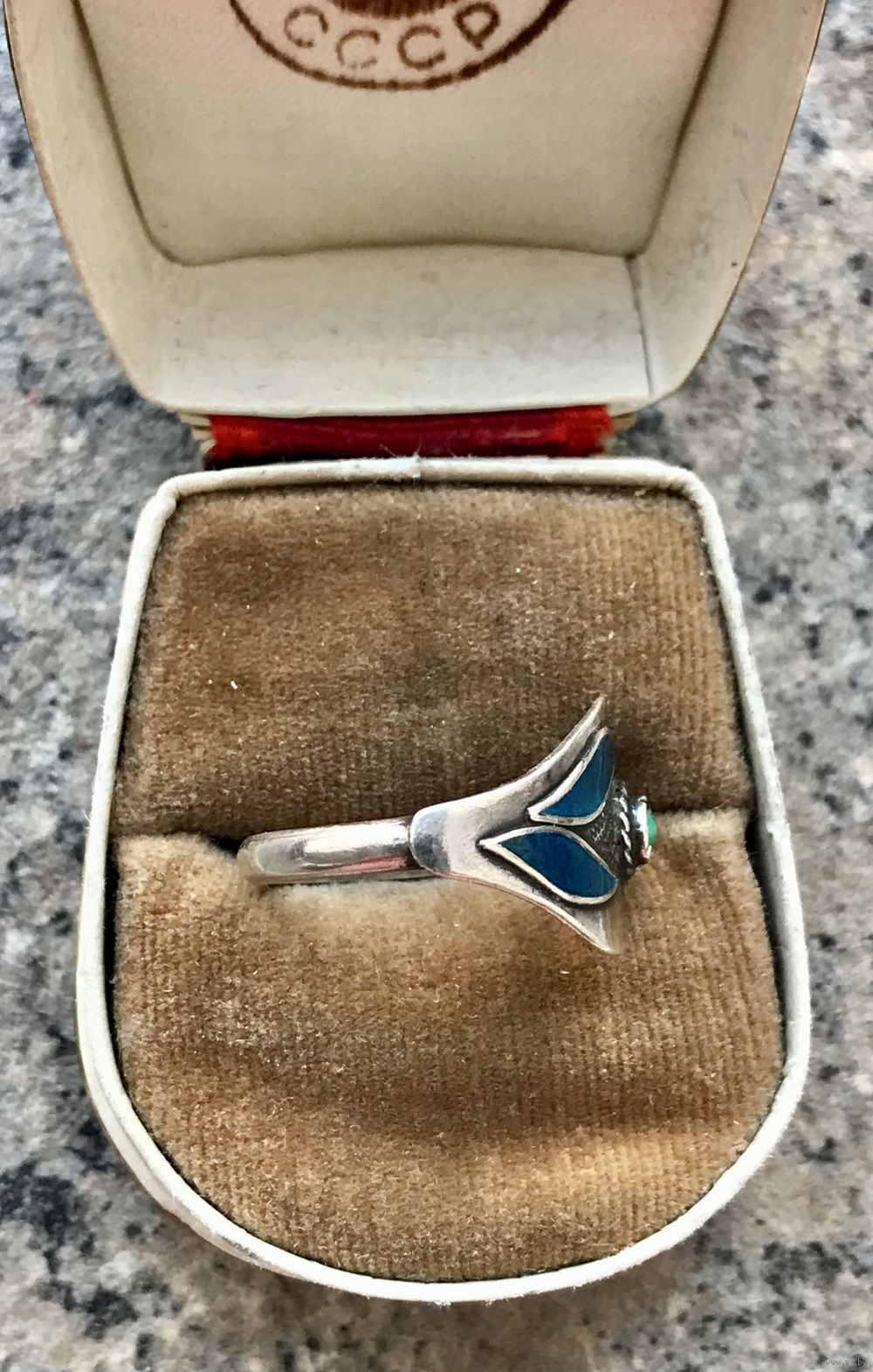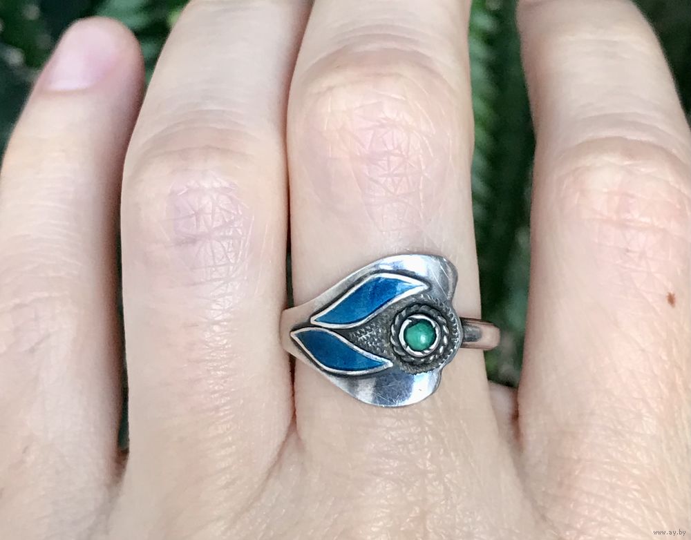 Кольцо из серебра 916пр., лицевая сторона украшена эмалью и вставкой из бирюзы. Изготовлено в 1984г. на Ереванском ювелирном заводе. Высота лицевой части 1,5см., размер 18-18,5. Редкая модель. Состояние хорошее.