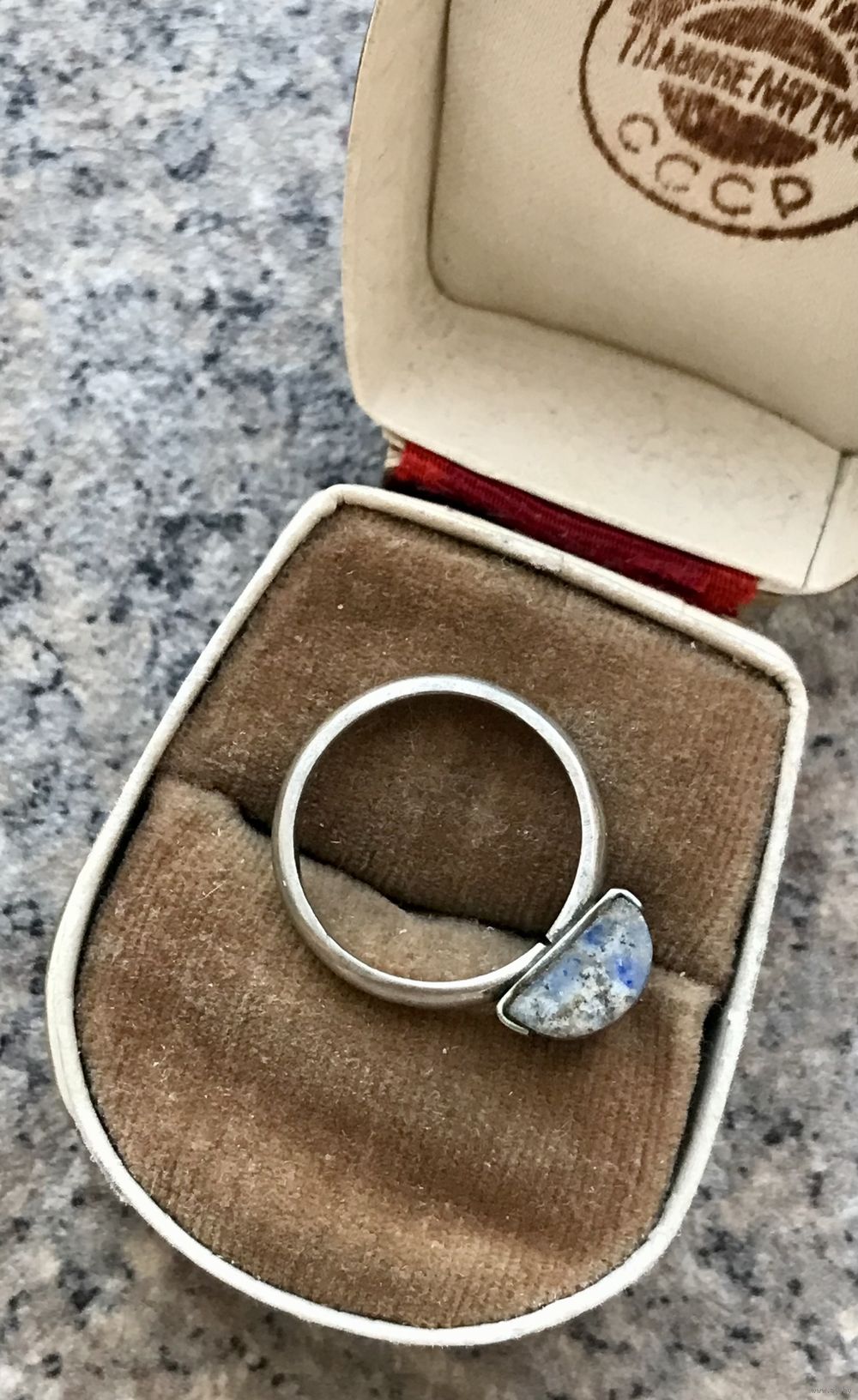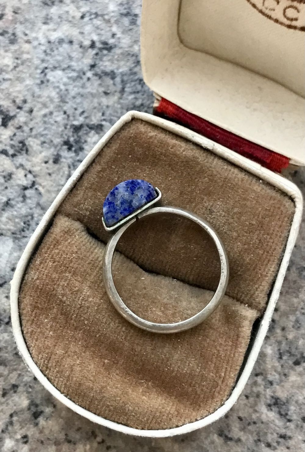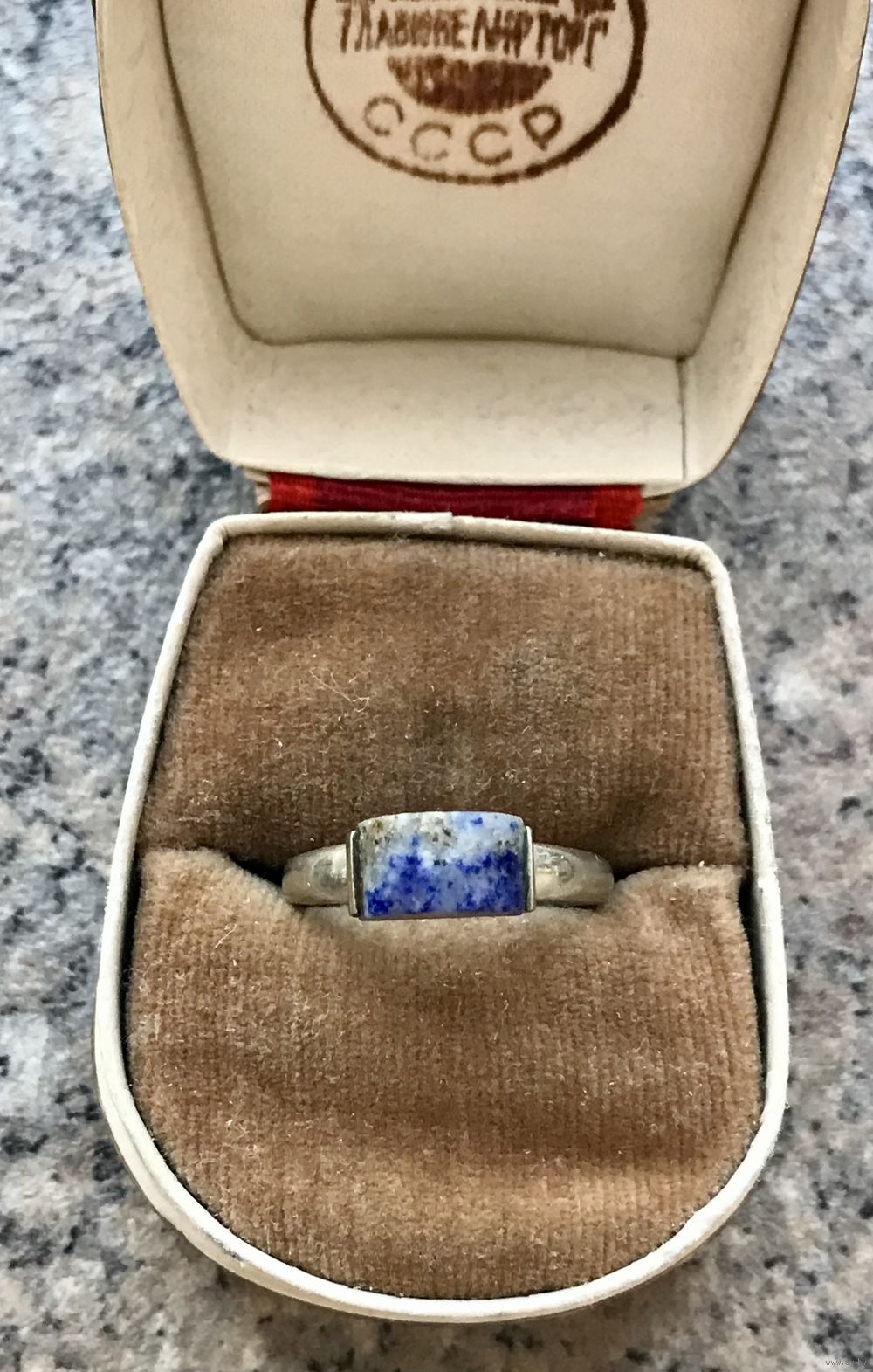 Небольшое кольцо с основой из мельхиора и вставкой из лазурита. Размер кольца 17, размер вставки 0,9х0,5см. Состояние хорошее.