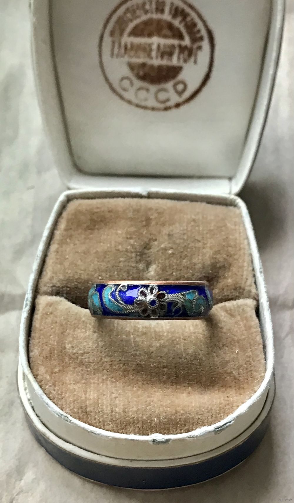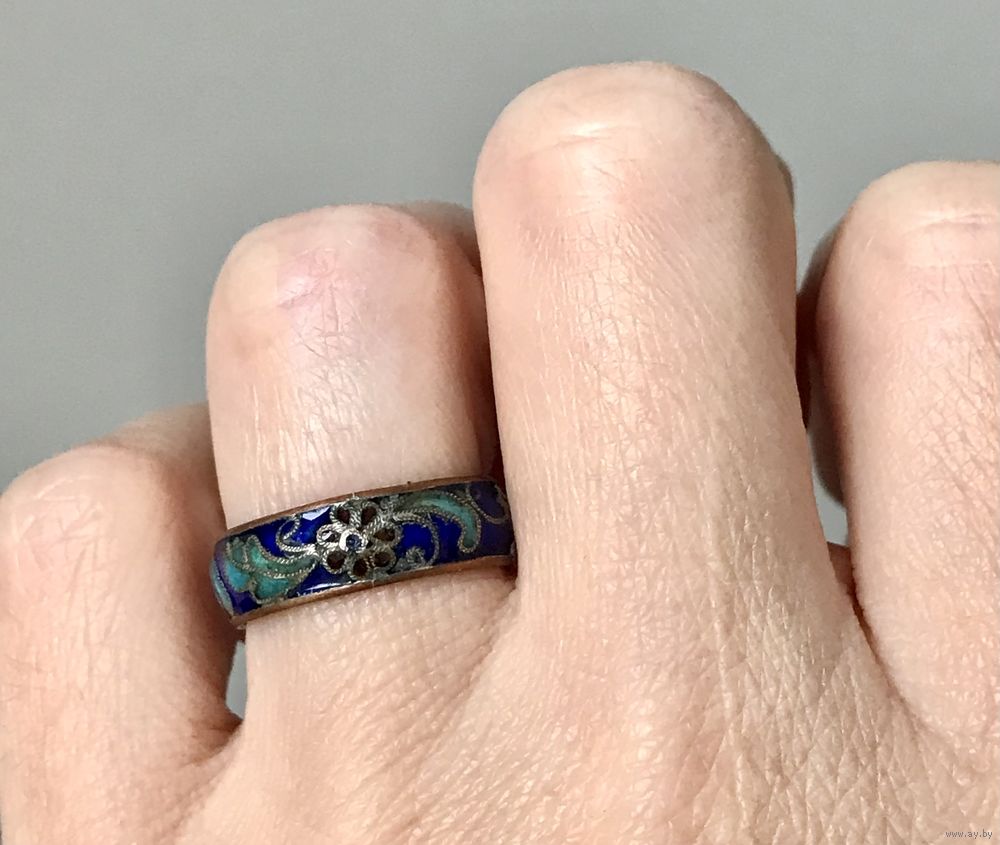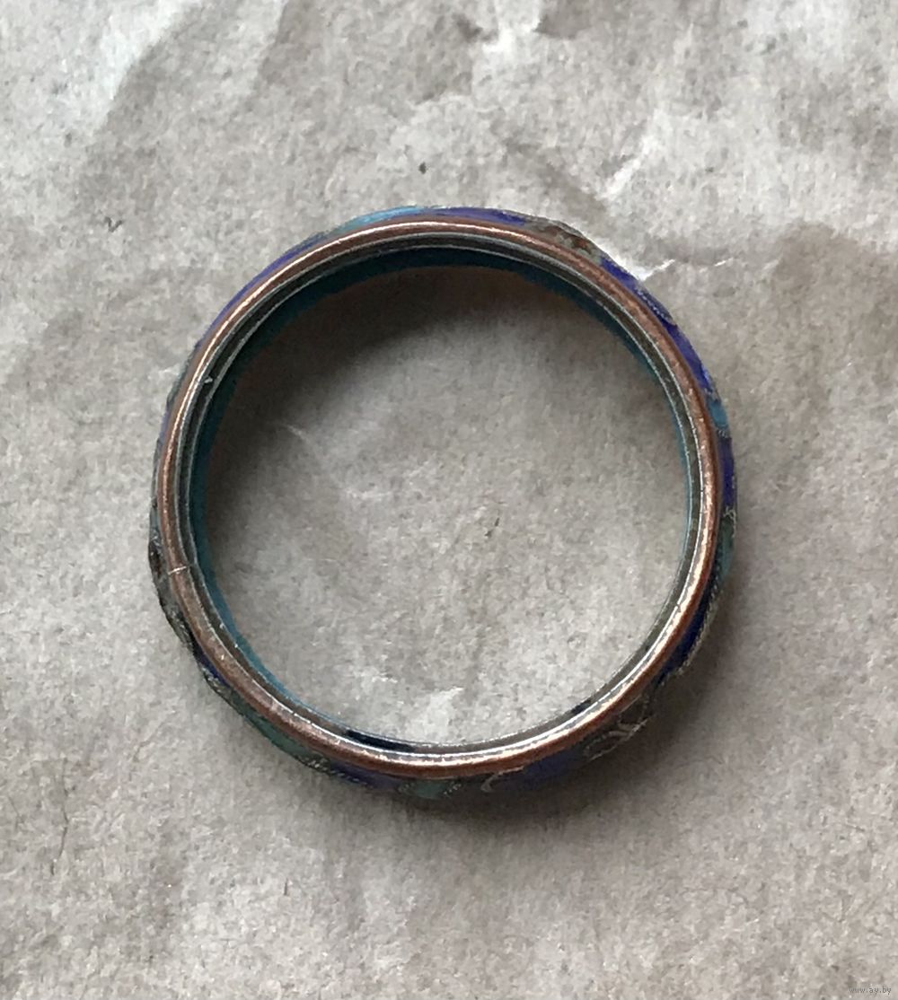 Винтажное кольцо в технике клуазоне. Основа из меди, на лицевой стороне эмаль. Высота кольца 0,5см., размер 15. Состояние хорошее.