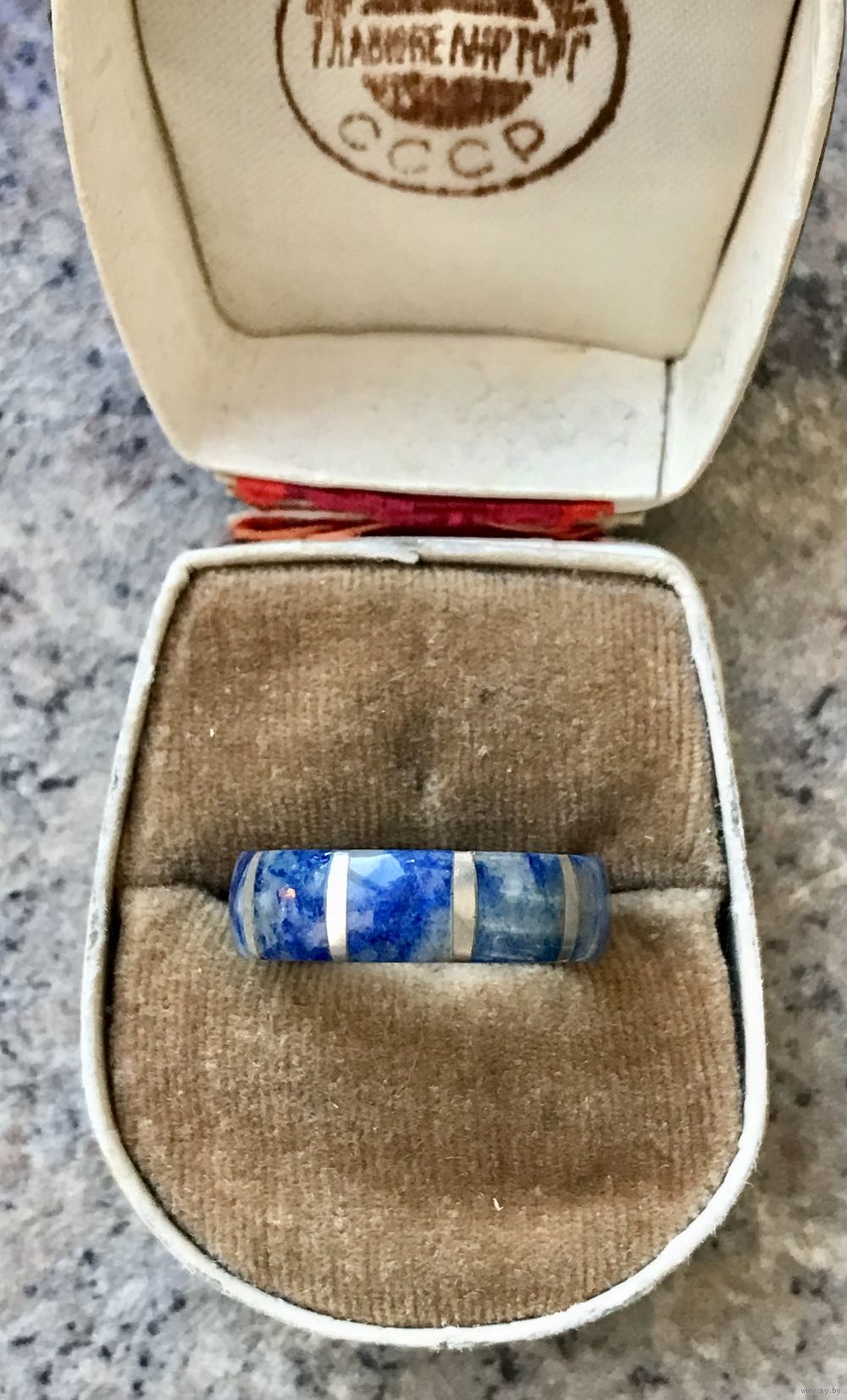 Винтажное кольцо с основой из мельхиора и вставками из лазурита. Высота кольца 0,5см., размер 17-17,5. Состояние хорошее.