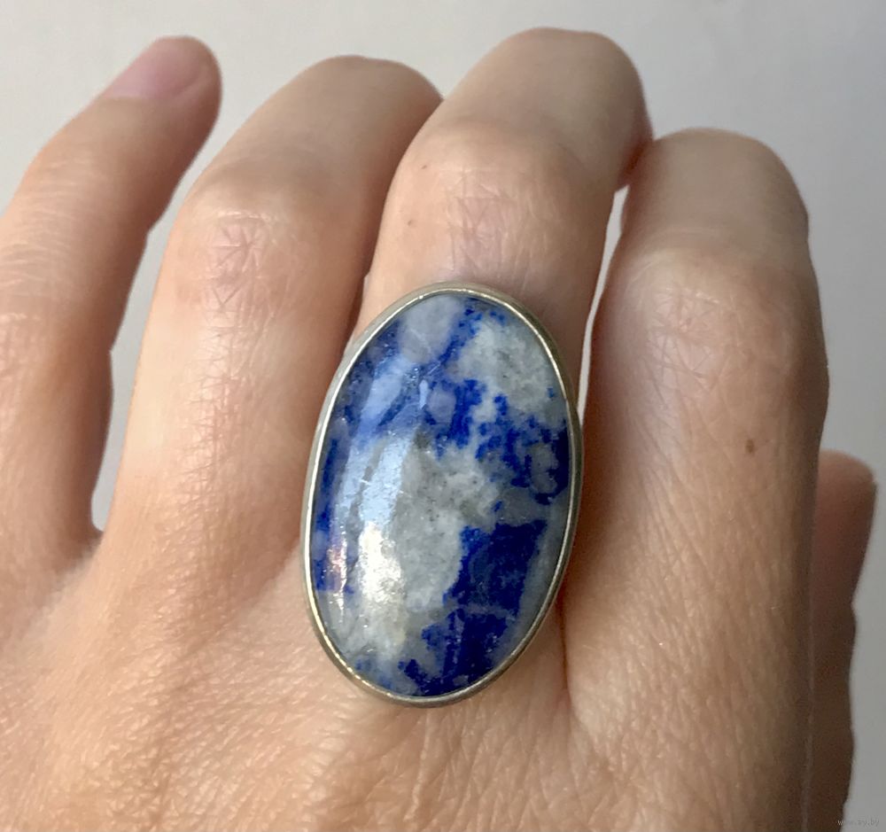 Крупное кольцо с основой из нейзильбера и вставкой из лазурита. Высота каста 3,1см., размер вставки 2,8х1,8см. Размер кольца 18 (можно увеличить/уменьшить на 1 размер). Состояние хорошее.