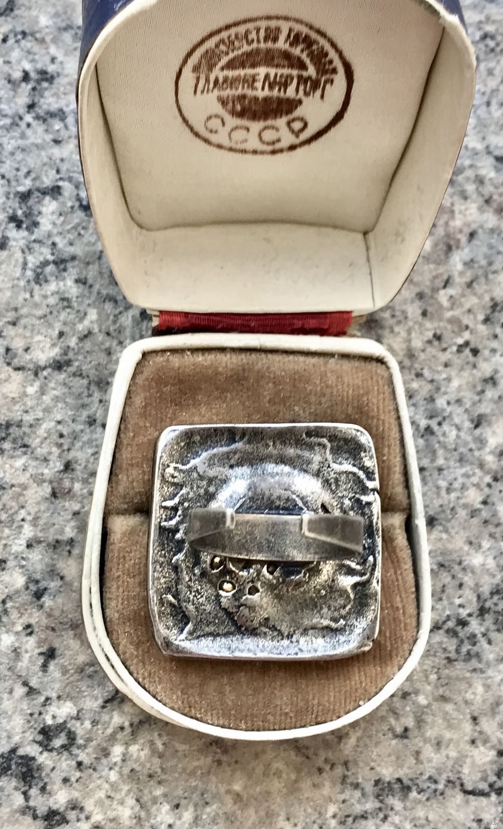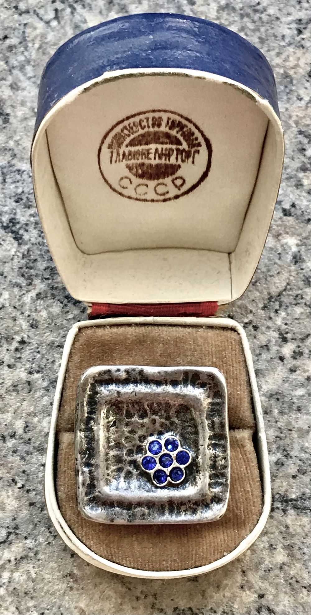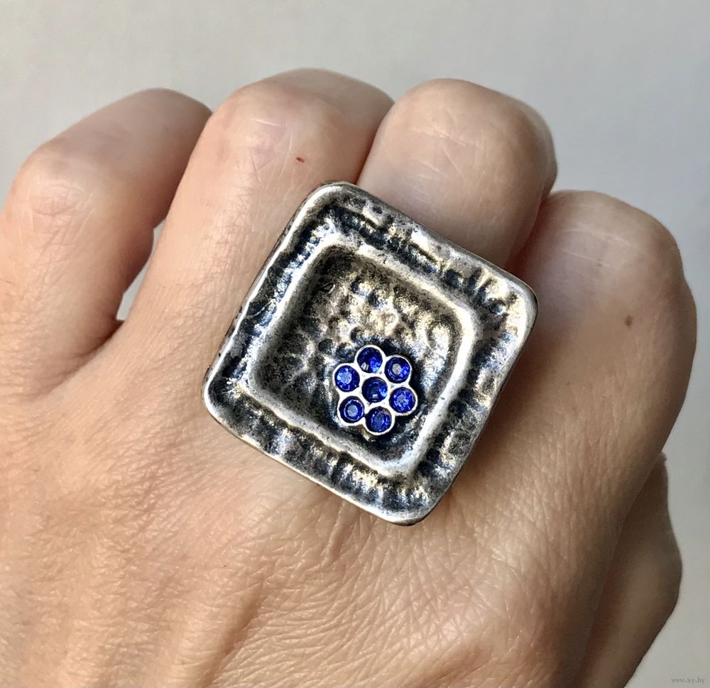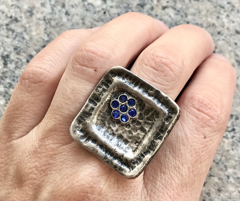 Крупное кольцо из металла серебристого тона (похож на пьютер). Вставки кристаллы насыщенного синего цвета. Высота каста 2,8см., ширина 2,8см.Безразмерное. Состояние хорошее.