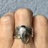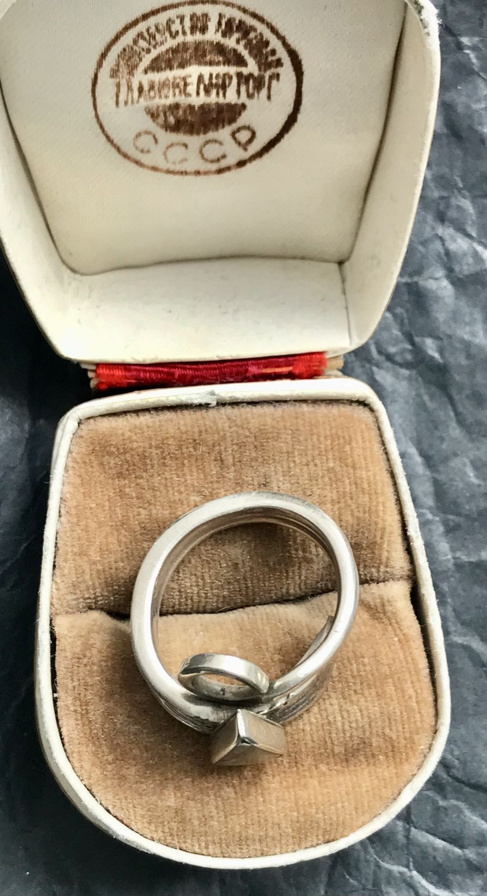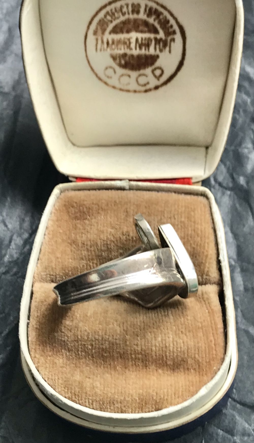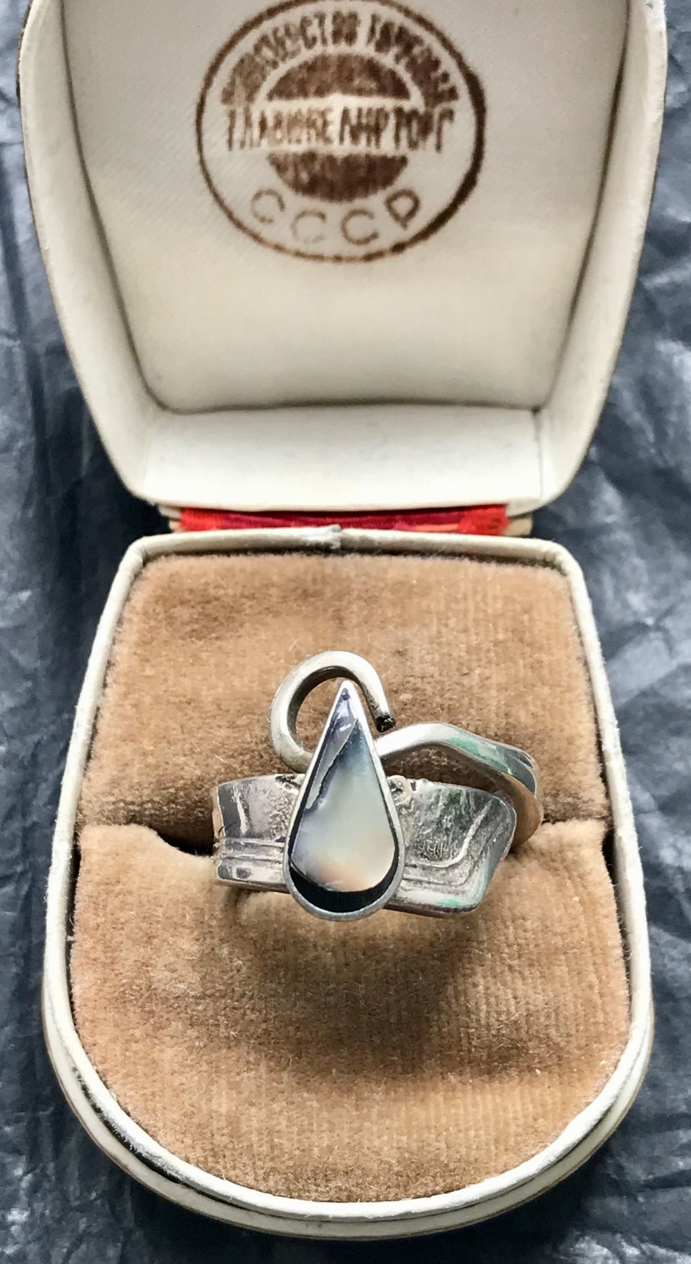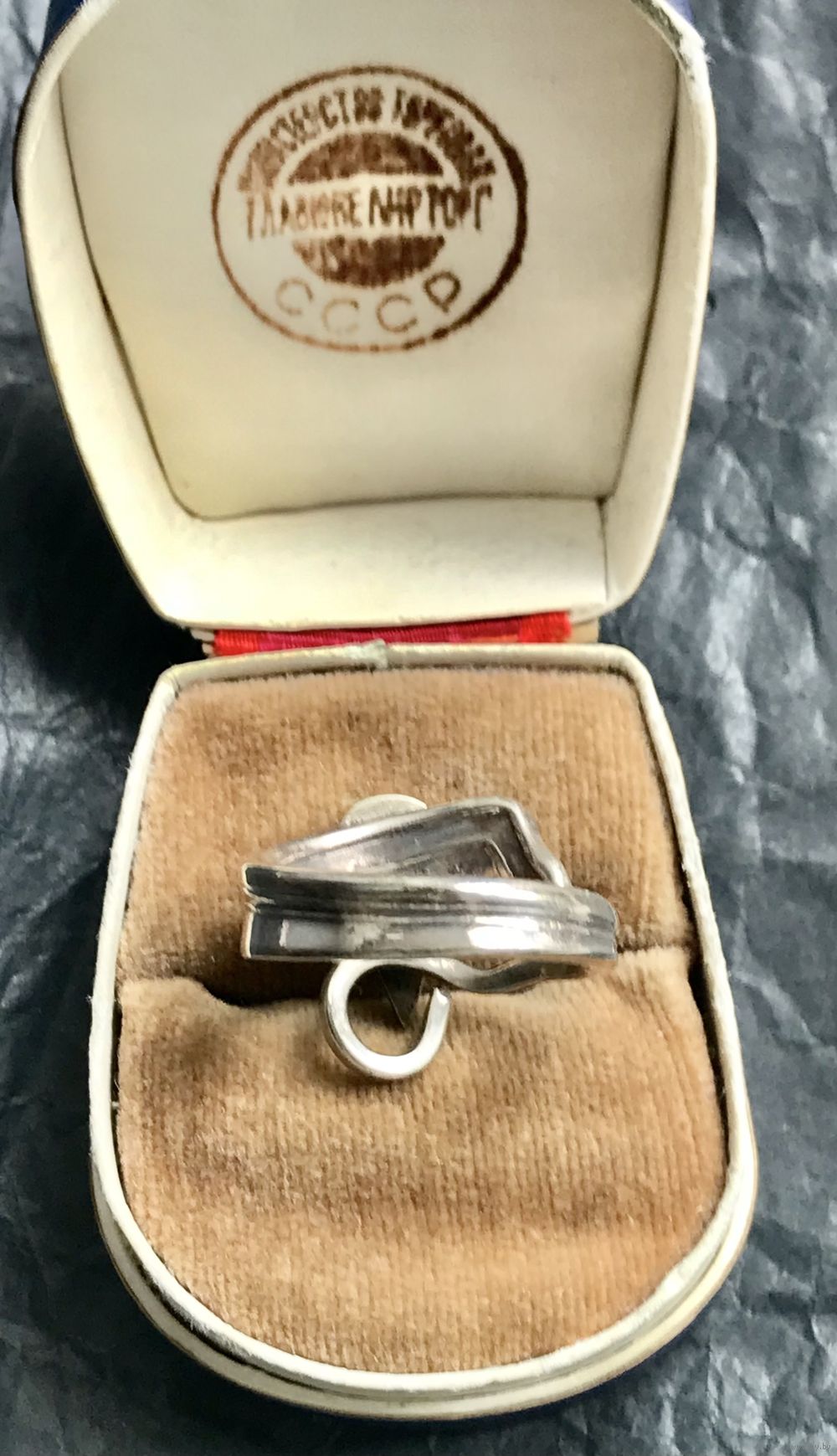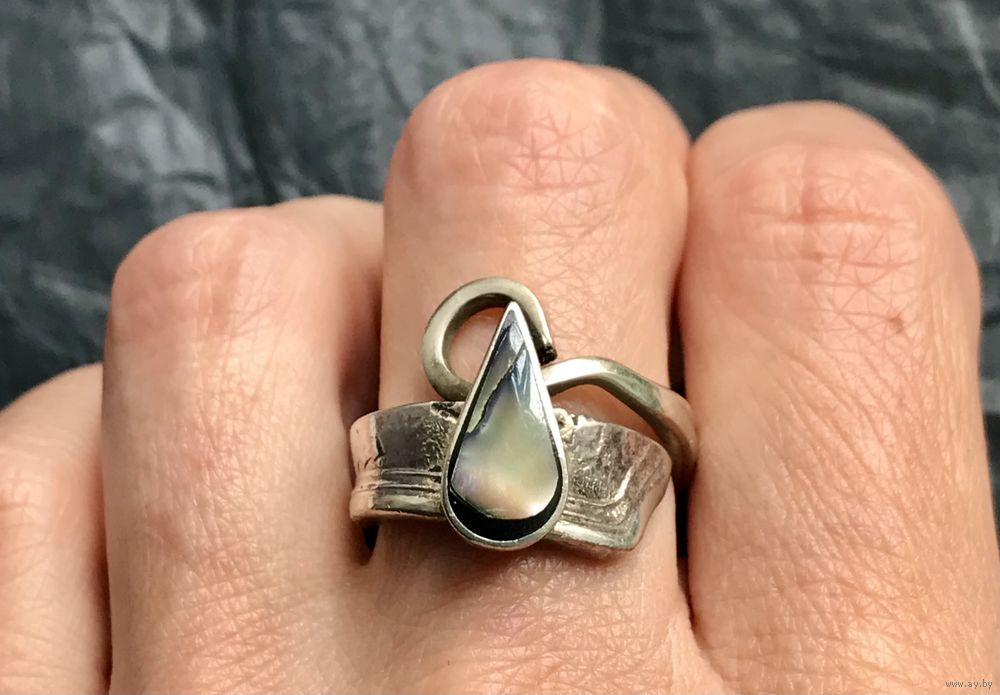 Крупное кольцо из металла с серебрением, на лицевой стороне вставка из гелиотиса. Высота кольца по центру 1,8см., размер регулируется. Состояние хорошее.
