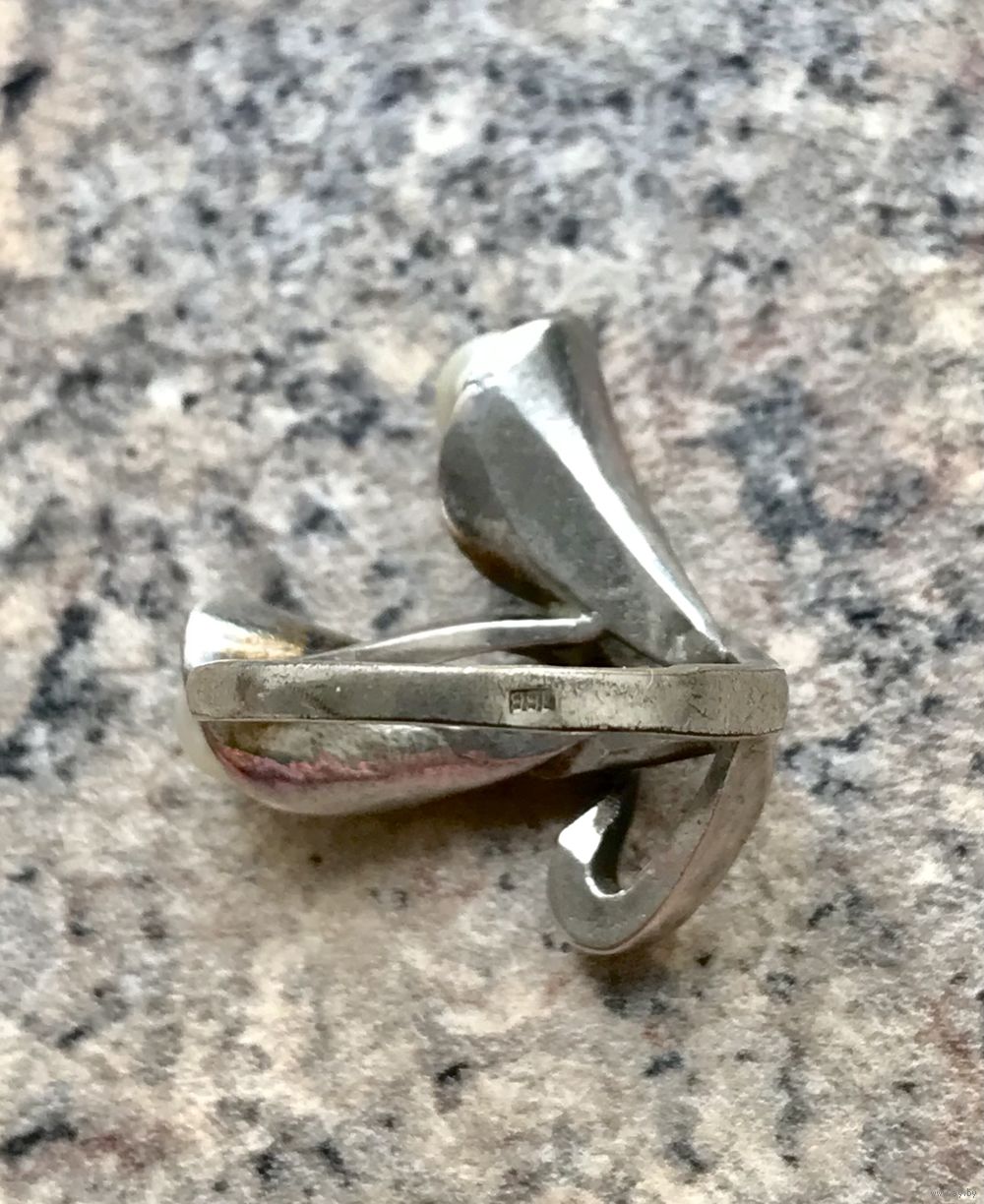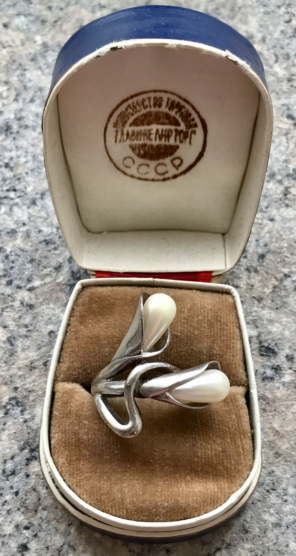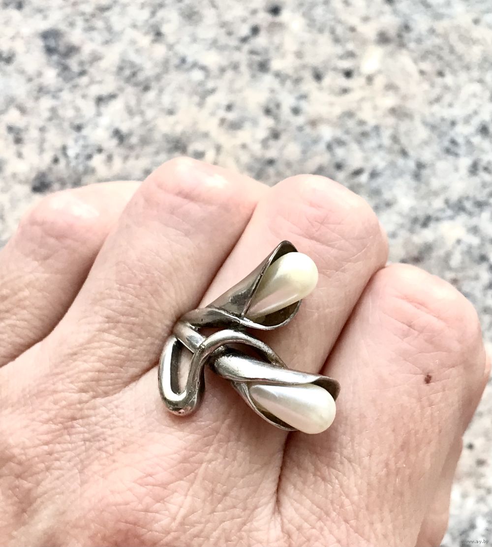 Крупное кольцо из металла с серебрением (стоит клеймо), вставки имитируют жемчуг. Размер 19, на шинке имеются незначительные потёртости. Общее состояние хорошее.