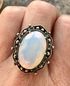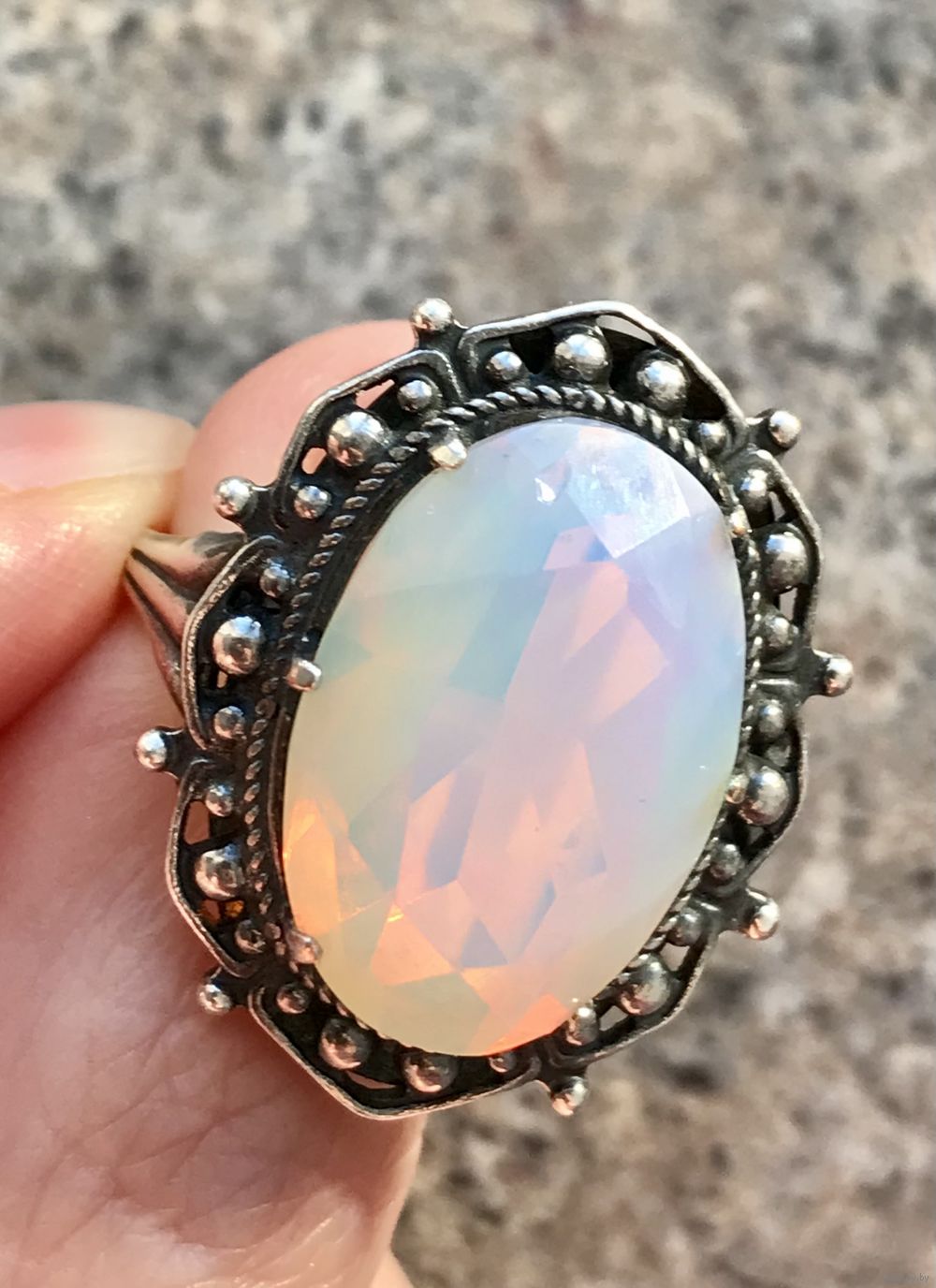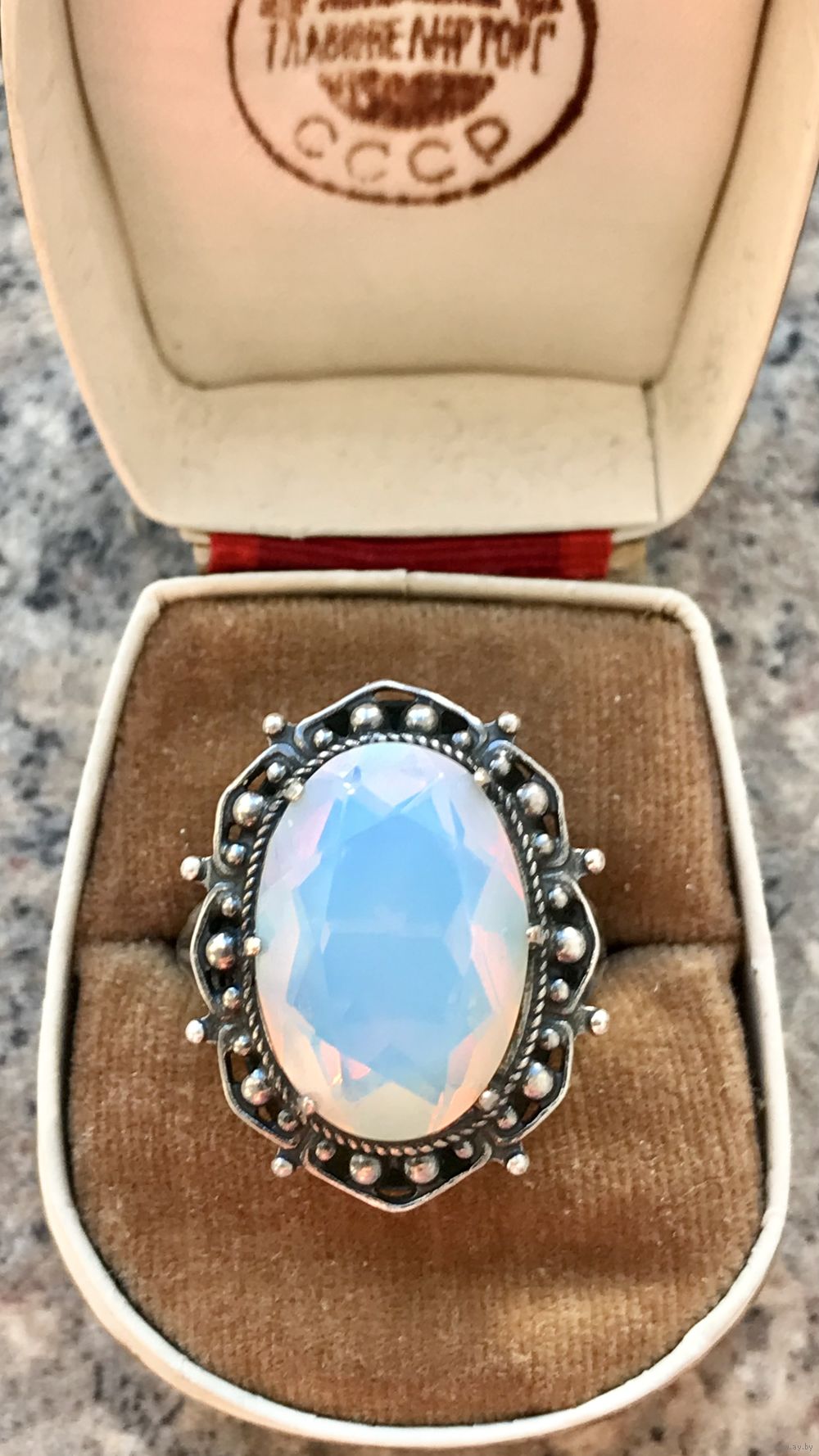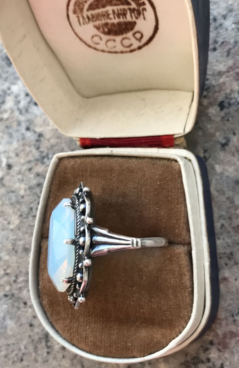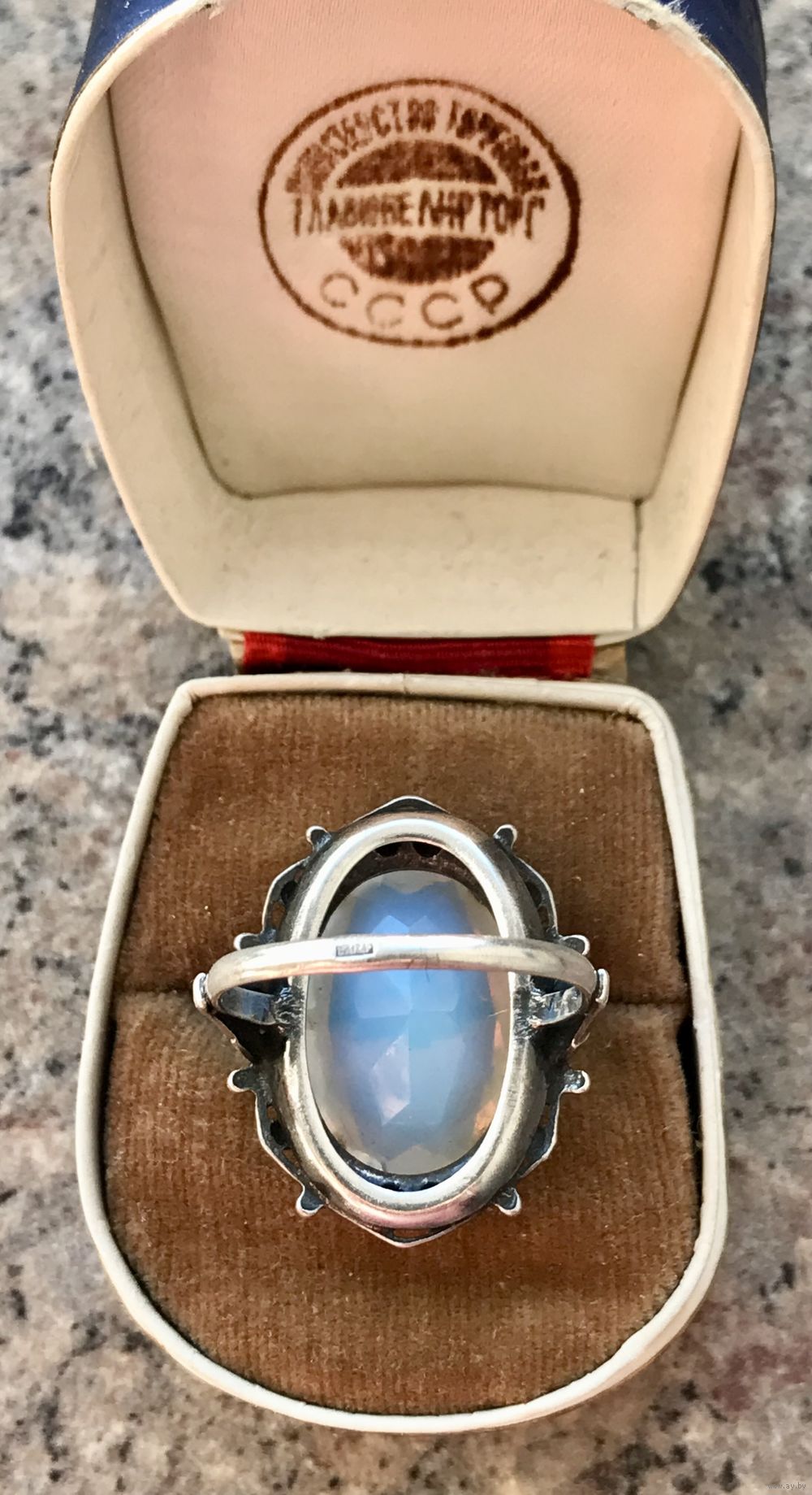 Крупное кольцо из мельхиора (клеймо) с глубоким серебрением.Вставка из ювелирного стекла под лунный камень.Высота каста 2,5см, вставка 1,8см.х1,2см.(на вставке есть небольшой скол, в глаза не бросается, учтено в цене), размер кольца 19-20.