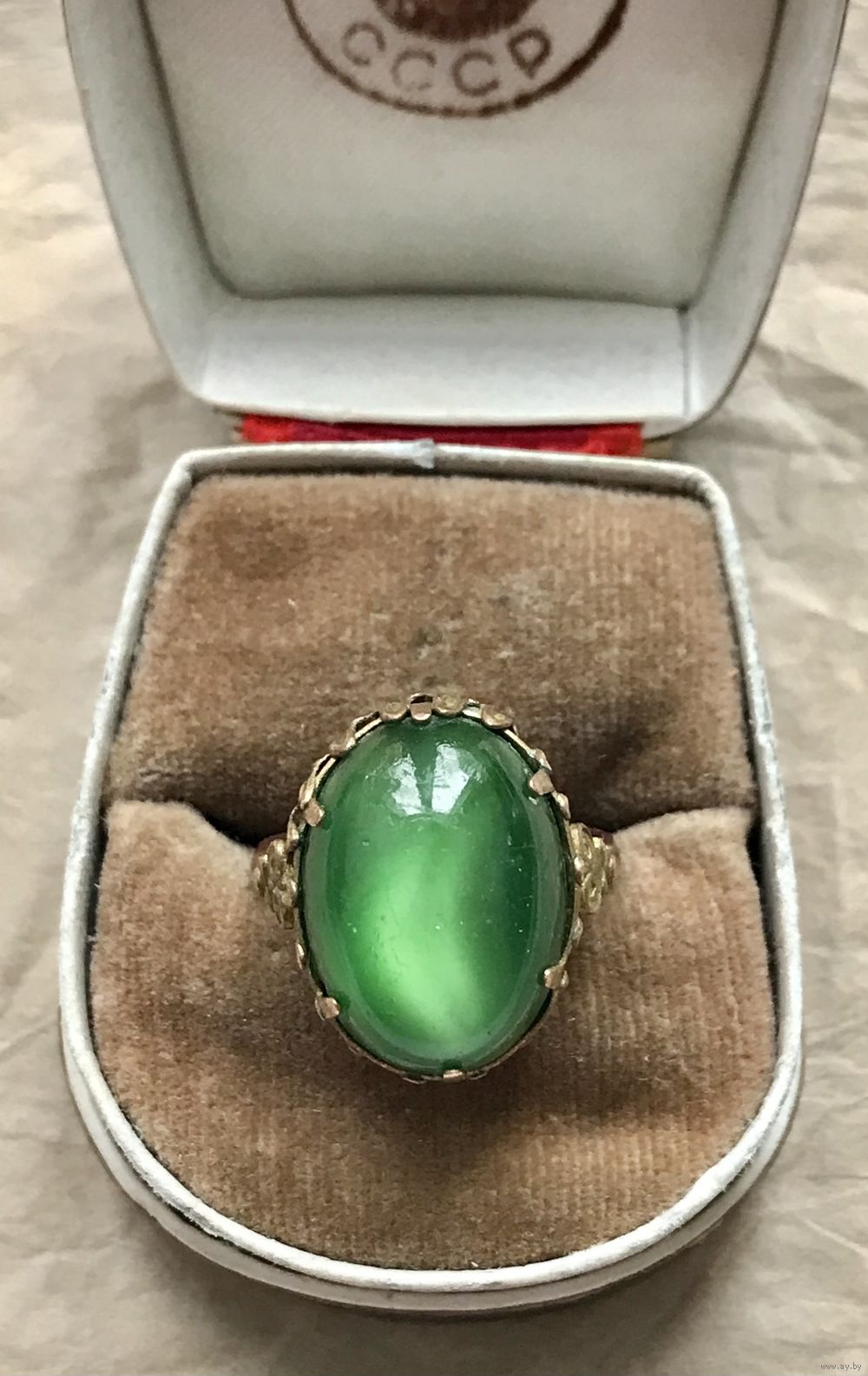 Винтажное бижутерное кольцо со вставкой из стекла с иризацией. Высота каста 1,8см., размер кольца 17. На металле имеются потертости, на вставке небольшие царапки. На шинке стоит отметка 9КМ.