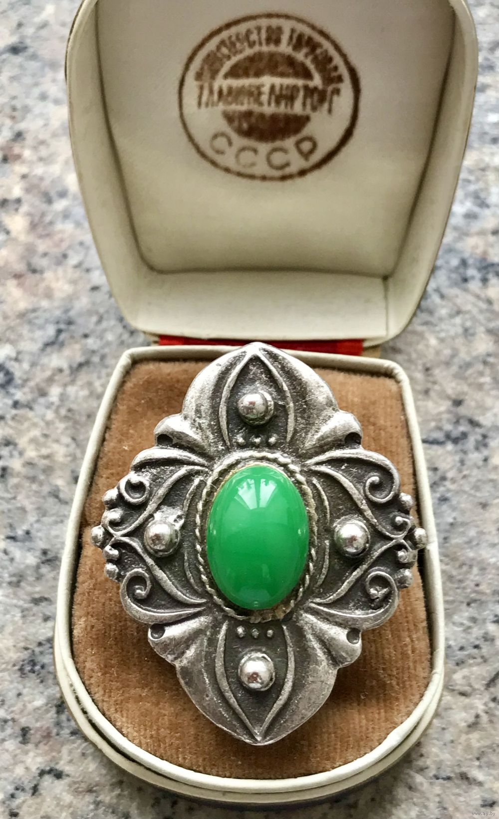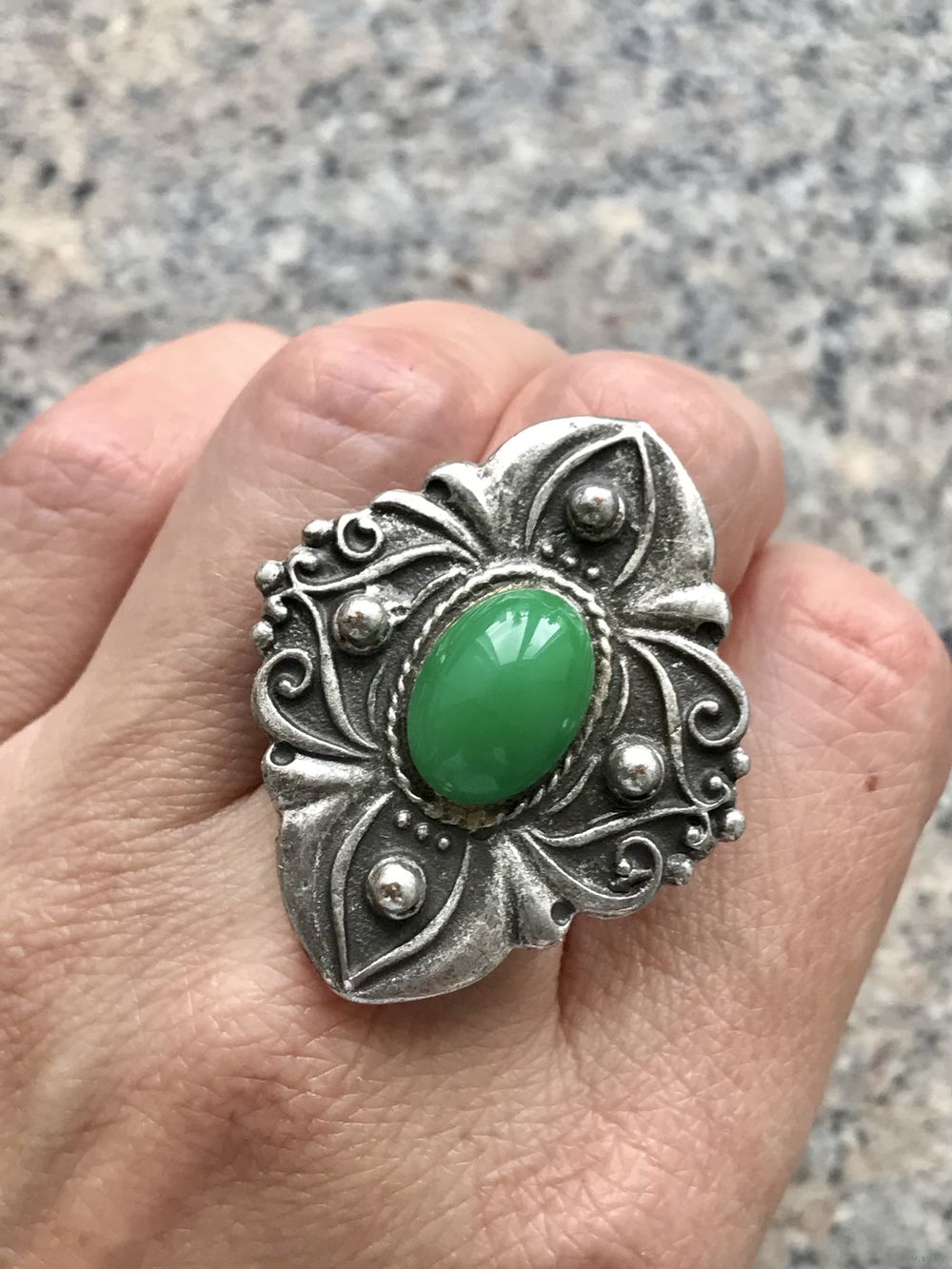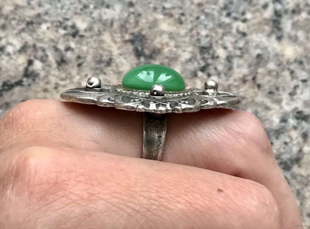 Крупное кольцо в этническом стиле из металла серебристого тона (похож на пьютер). Вставка из цветного стекла. Высота кольца 4см., ширина 3,5см. Вставка 1,3х0,9см. Безразмерное. Состояние хорошее.