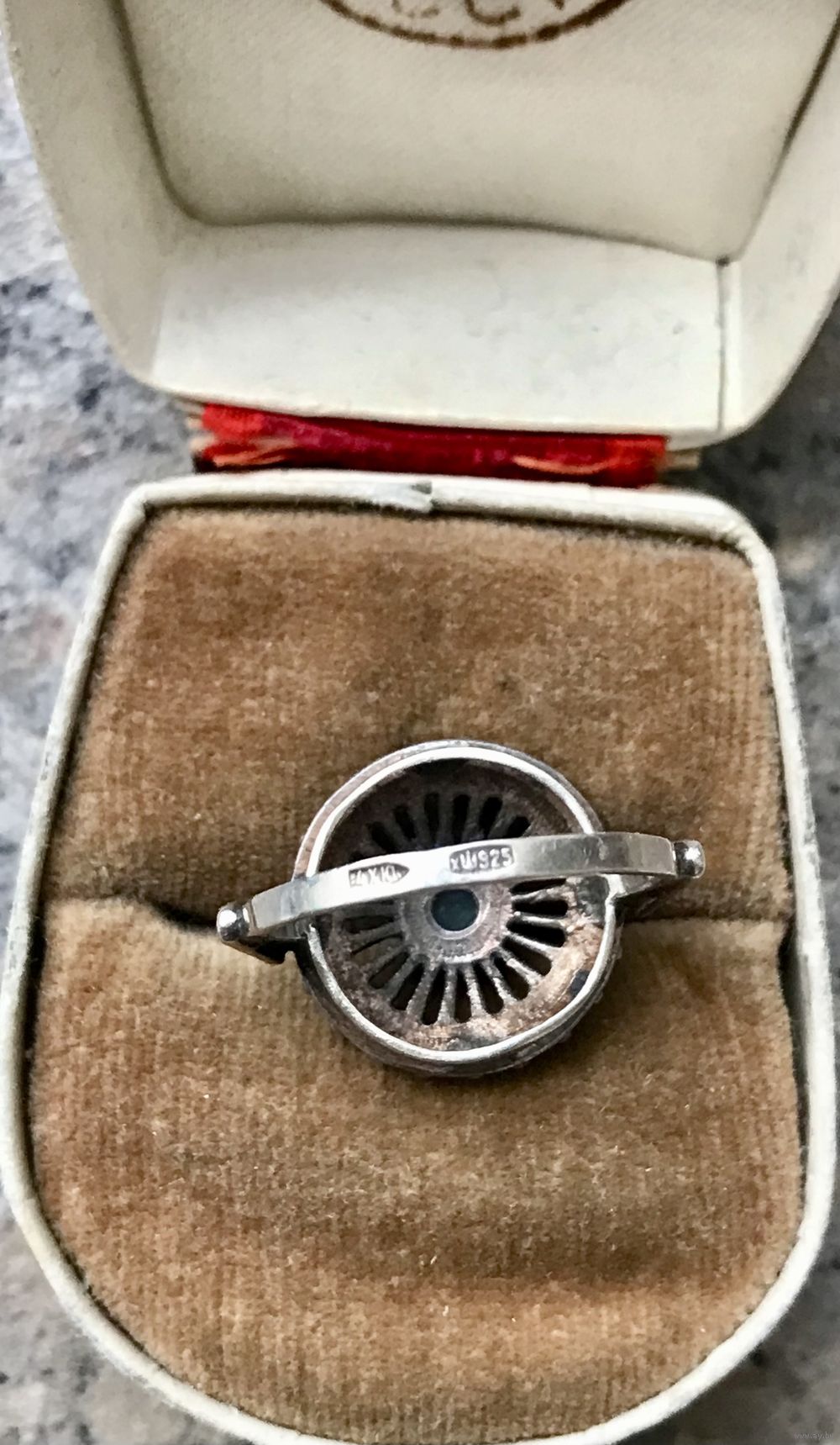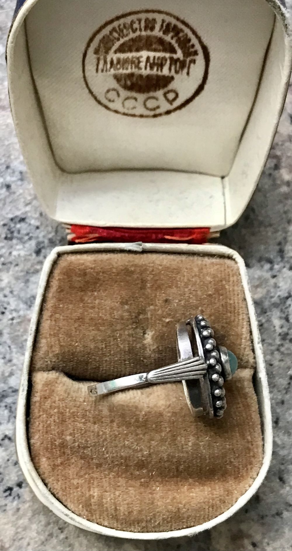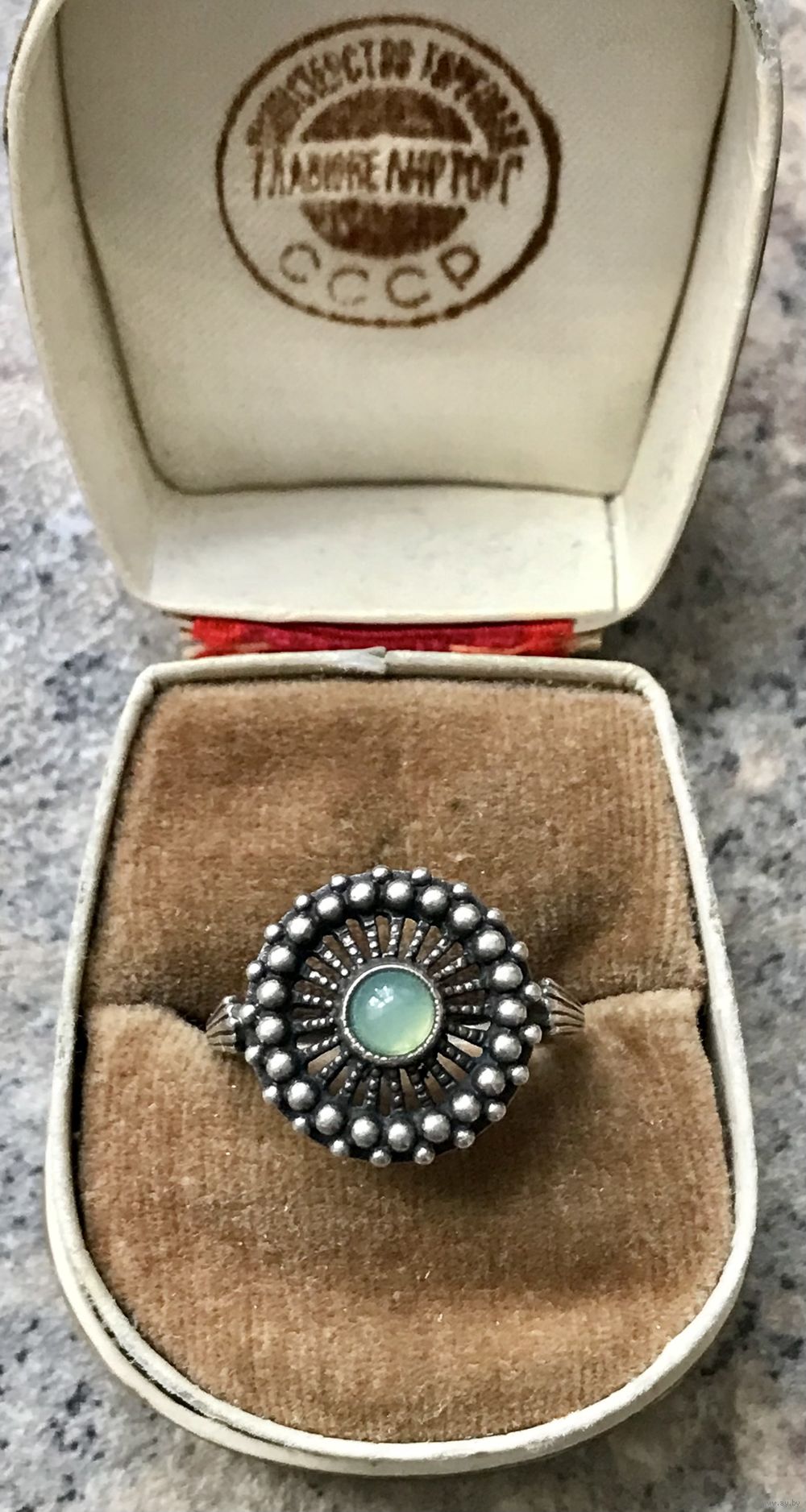 Винтажное кольцо из серебра 925пр. с чернением. Вставка-хризопраз. Сделано в 1994г. в Харькове. Диаметр каста 1,5см., диаметр вставки 0,4см., вес 4,54гр. Размер 16. Состояние хорошее.