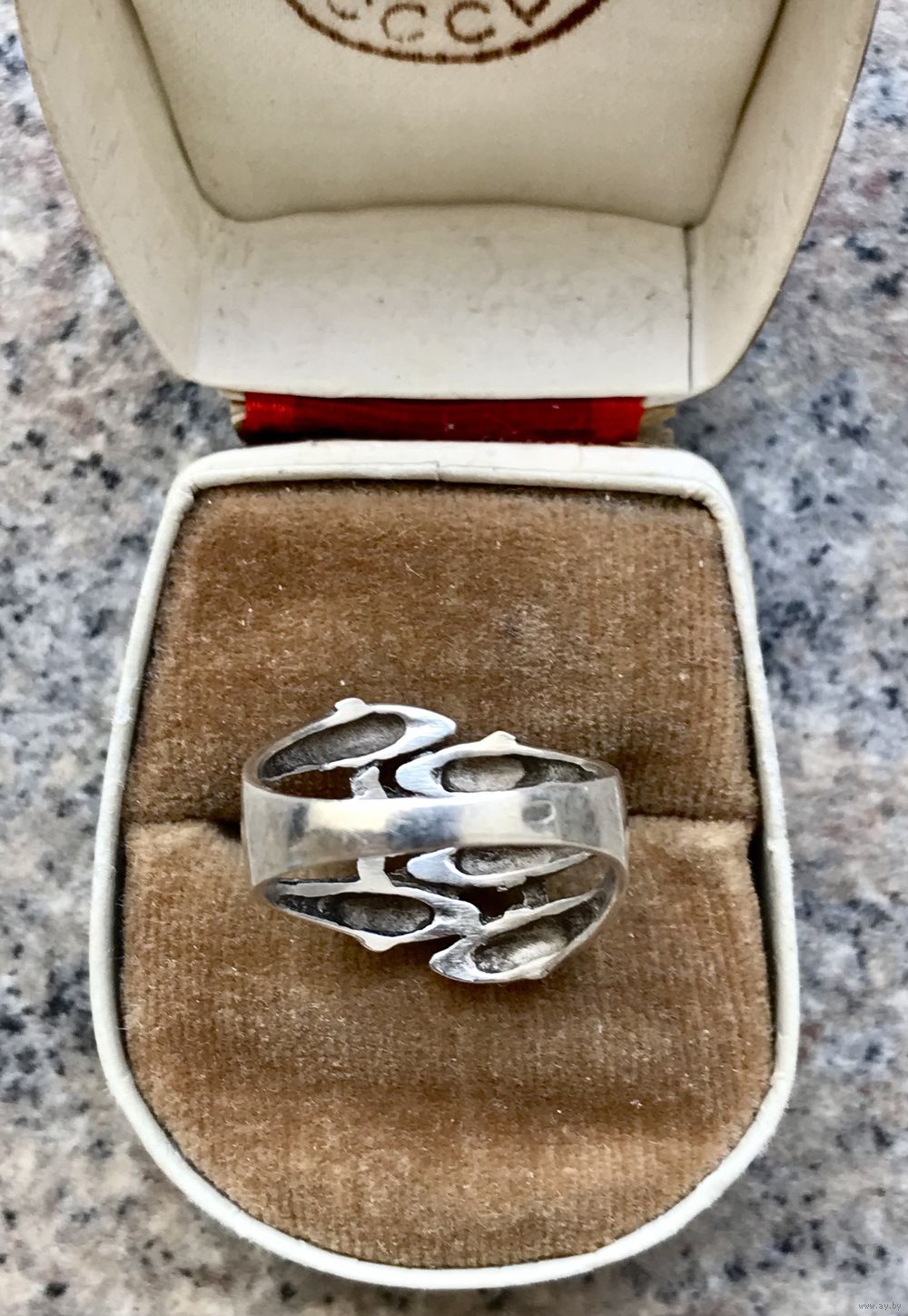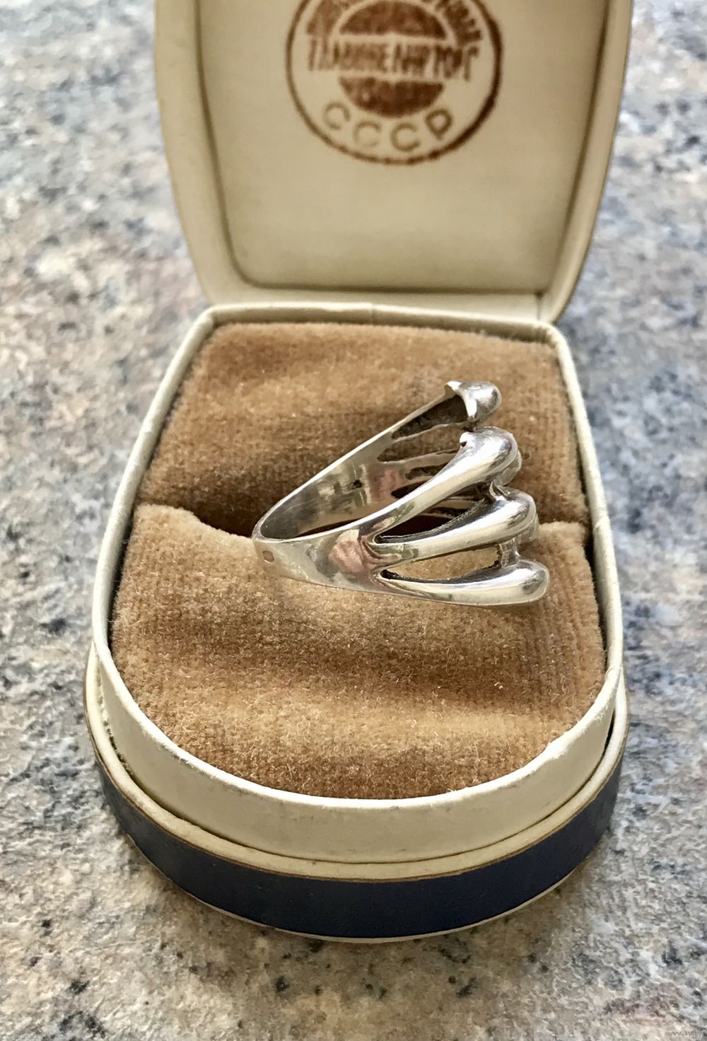 Кольцо из серебра 925пр.(внутри на шинке стоит отметка 925, также стоит российское пробирное клеймо). Высота каста 1,5см., размер кольца 18. Вес 5гр. Состояние хорошее.