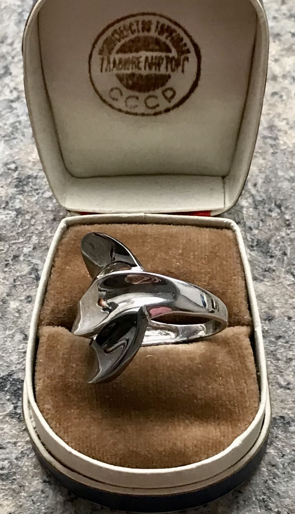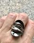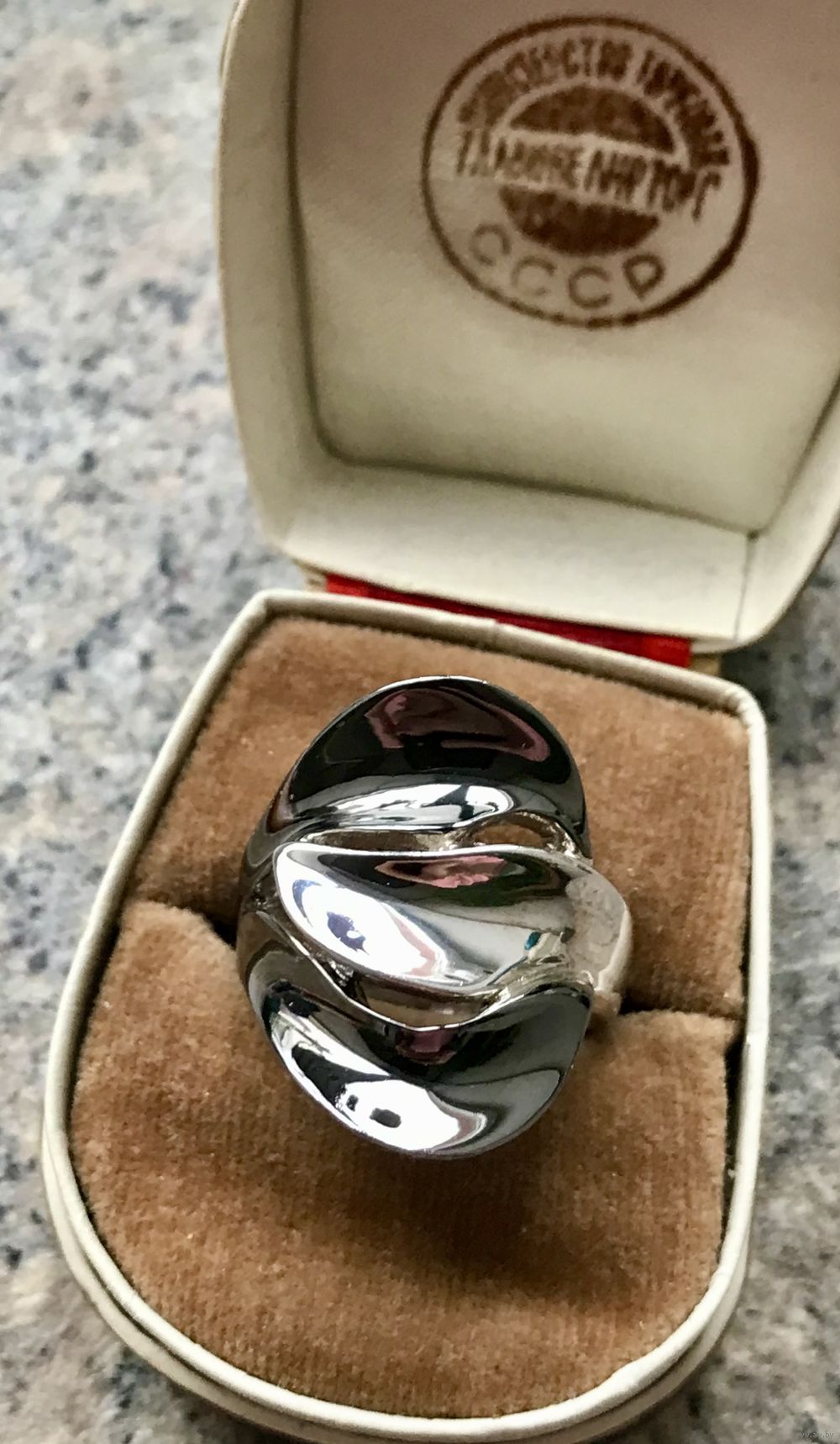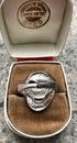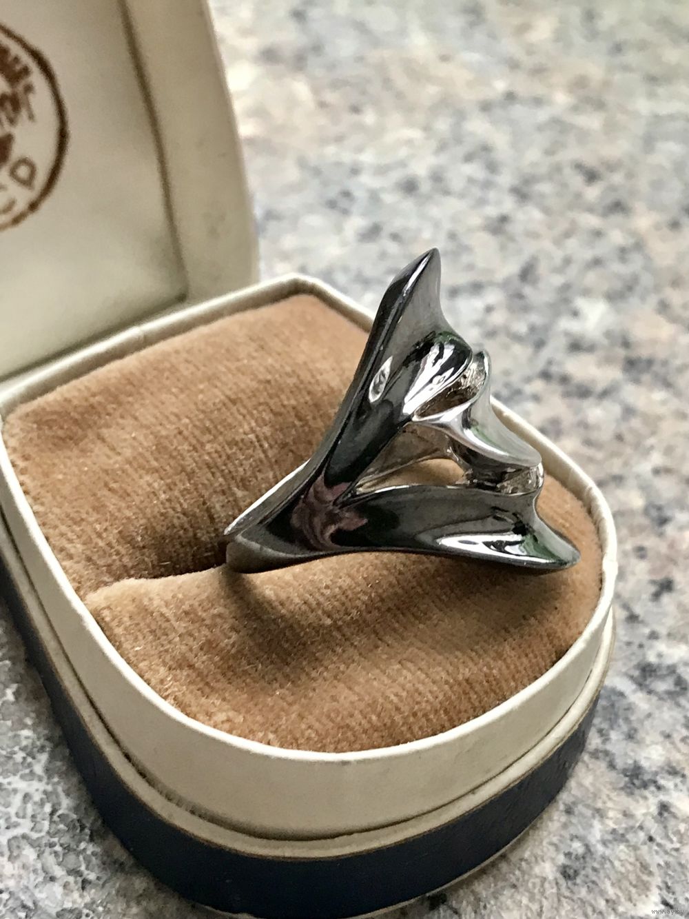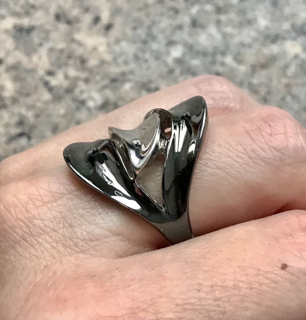 Крупное, эффектное кольцо из серебра (стоит отметка 925 и пробирное клеймо с зубром), одна часть покрыта чёрным родием. Высота лицевой части 2,5см., размер 18-18,5. Вес 7,4гр. Состояние хорошее.
