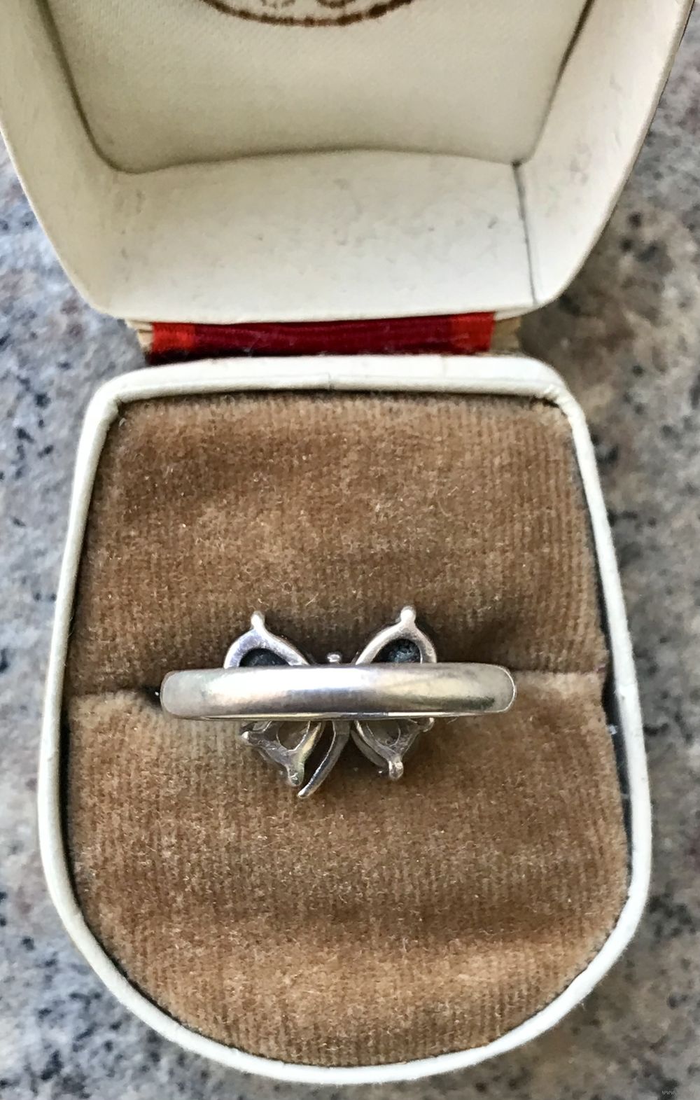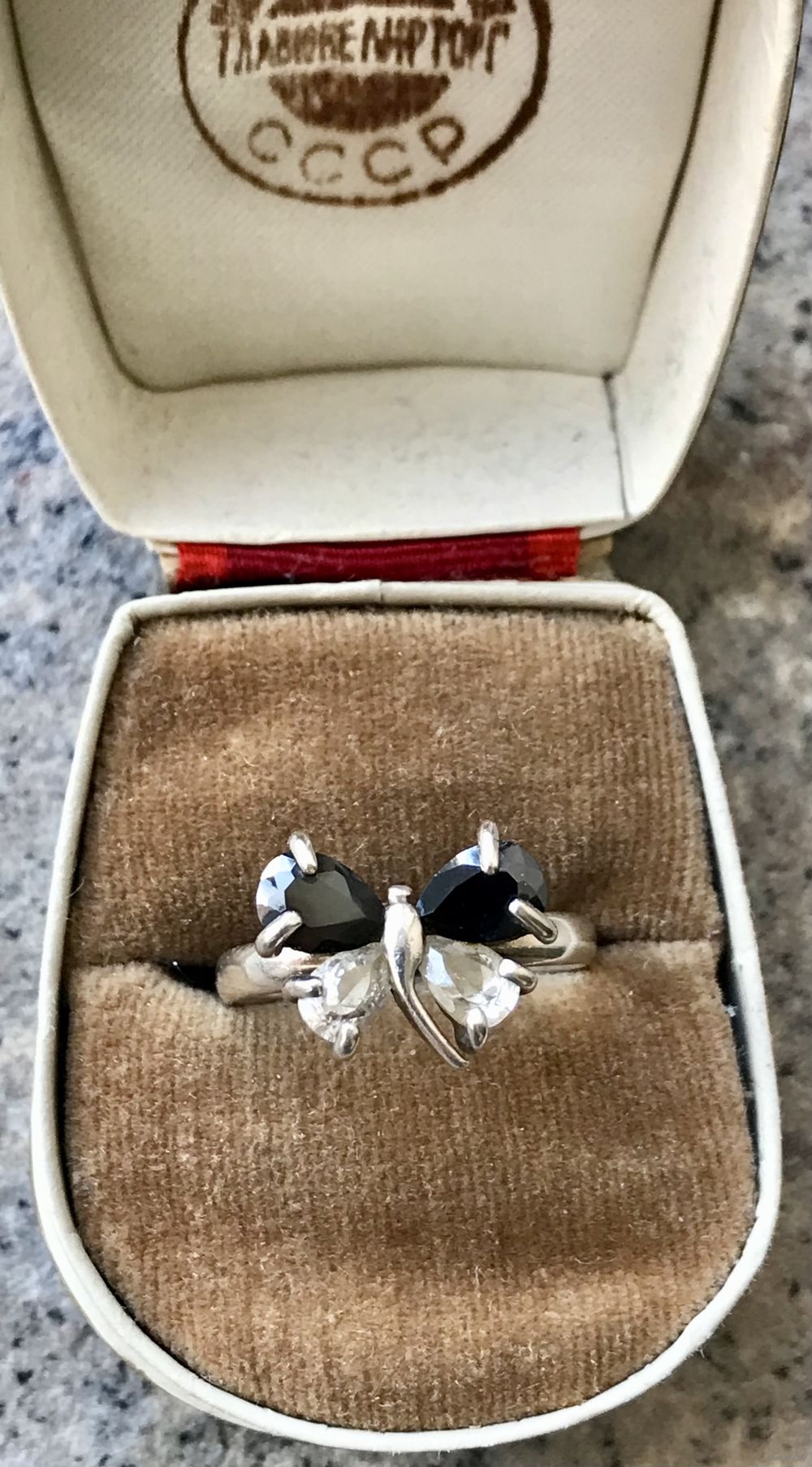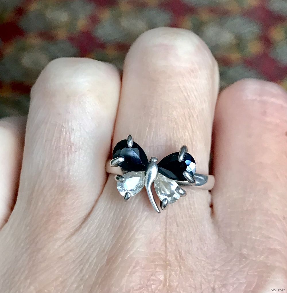 Кольцо в виде бабочки из серебра (на шинке внутри стоит отметка 925). Из чего вставки ( камень, стекло??) я не знаю. Размер 18. Состояние хорошее.
