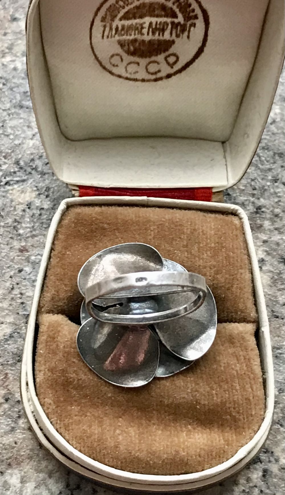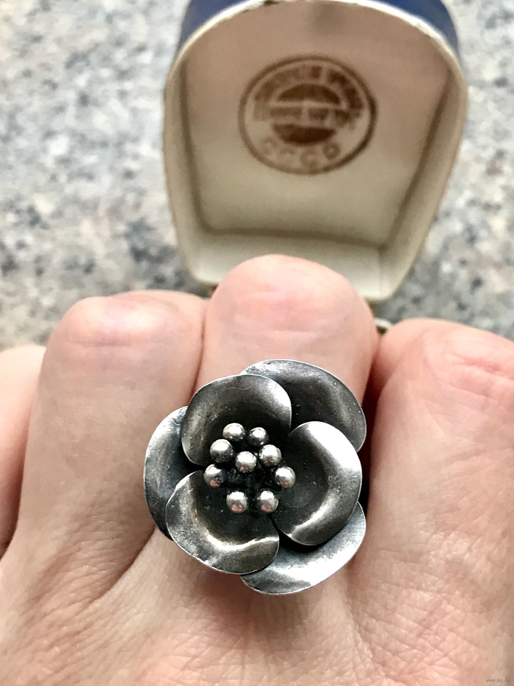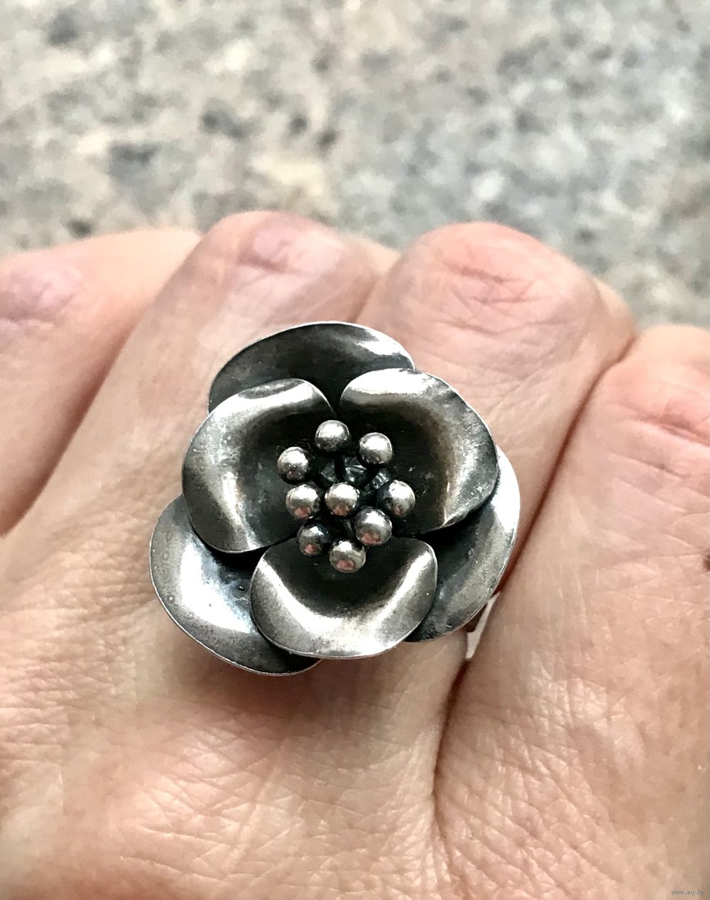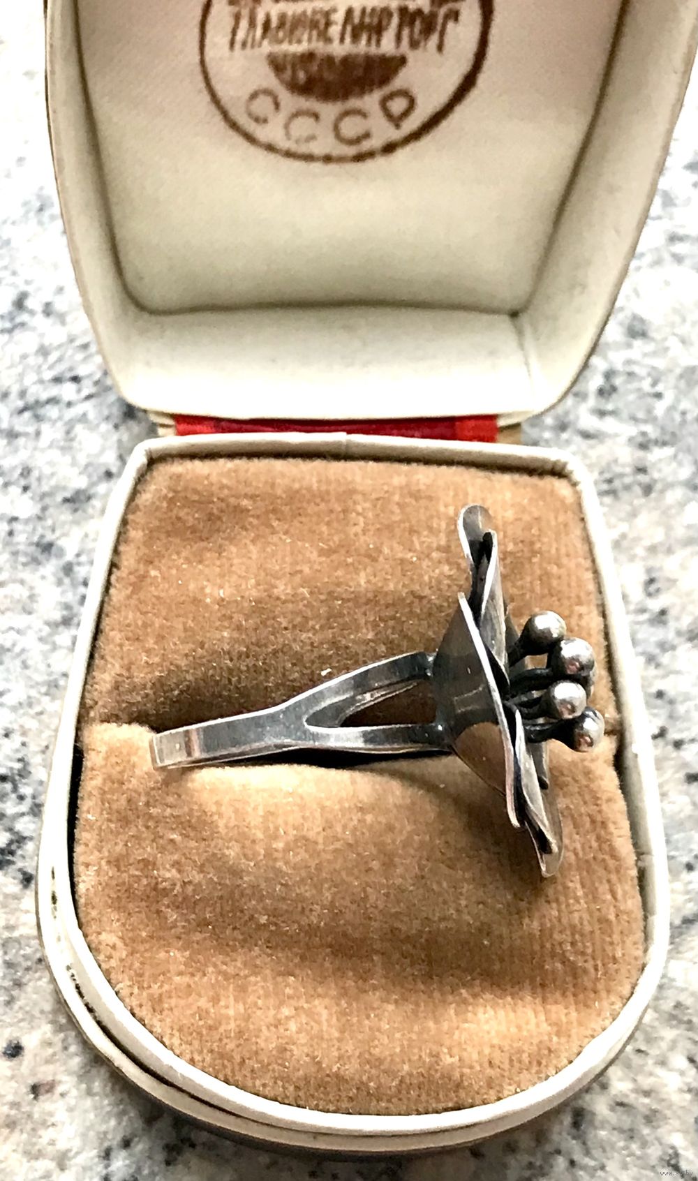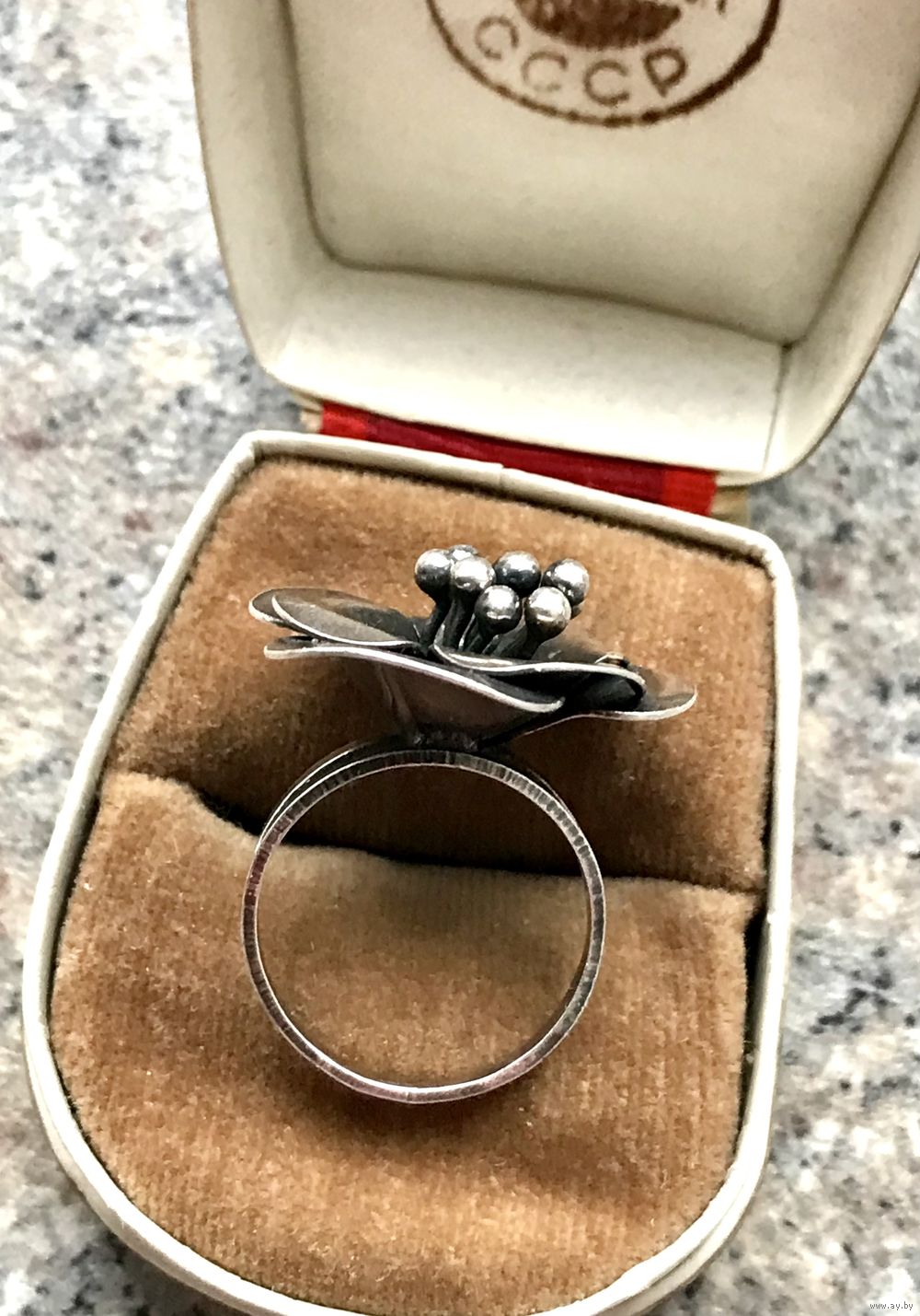 Крупное кольцо из серебра (из отметок стоит только плохочитаемый именник, пробы нет, тк. кольцо скорее всего уменьшали в размере, находила такое же на сайте Красной Пресни, кольцо Гелия, снято с производства).Высота каста 2,3см., размер 16,5-17. Состояние хорошее.