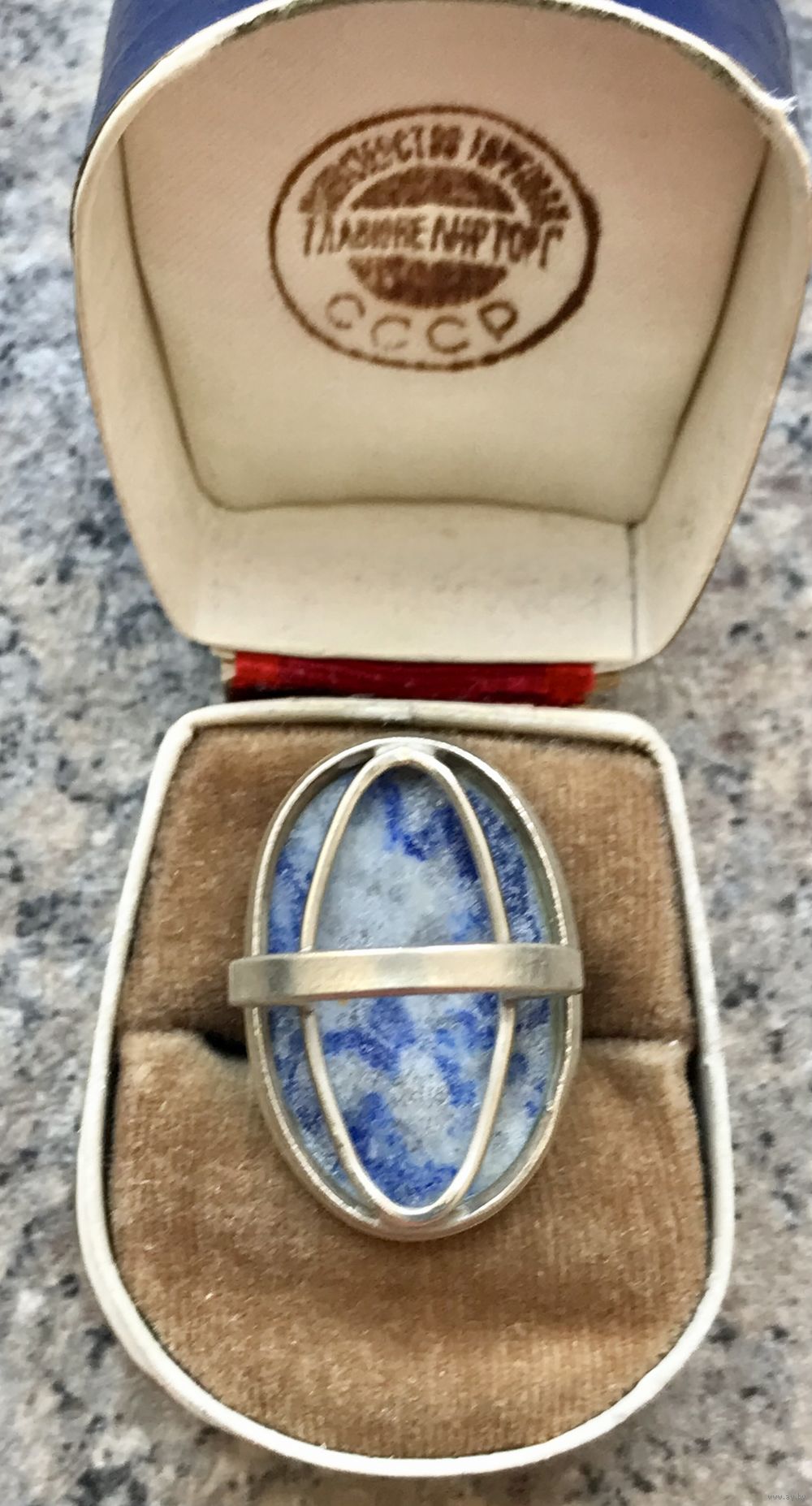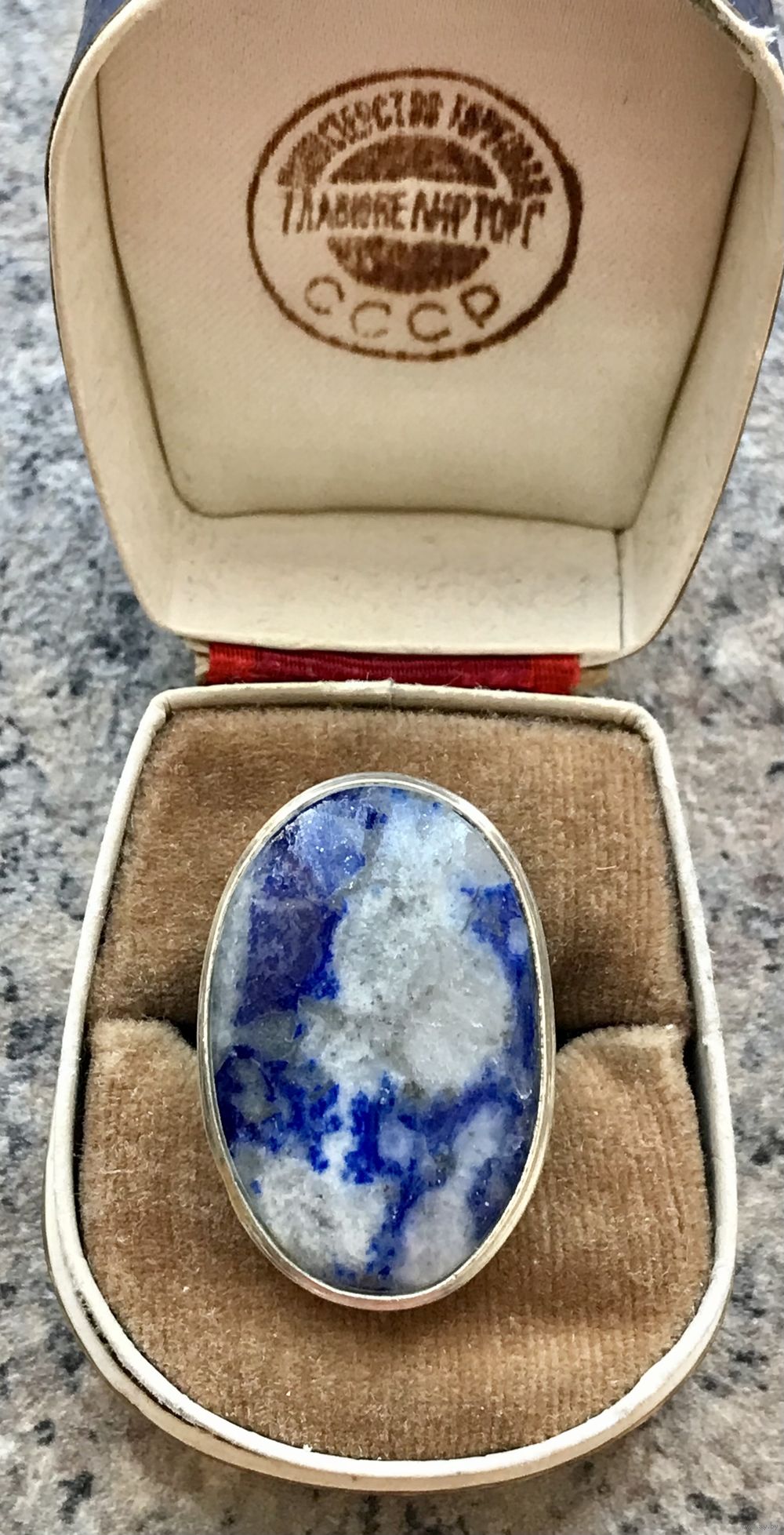 Крупное кольцо с основой из нейзильбера и вставкой из лазурита. Высота каста 3,1см., размер вставки 2,8х1,8см. Размер кольца 18 (можно увеличить/уменьшить на 1 размер). Состояние хорошее.