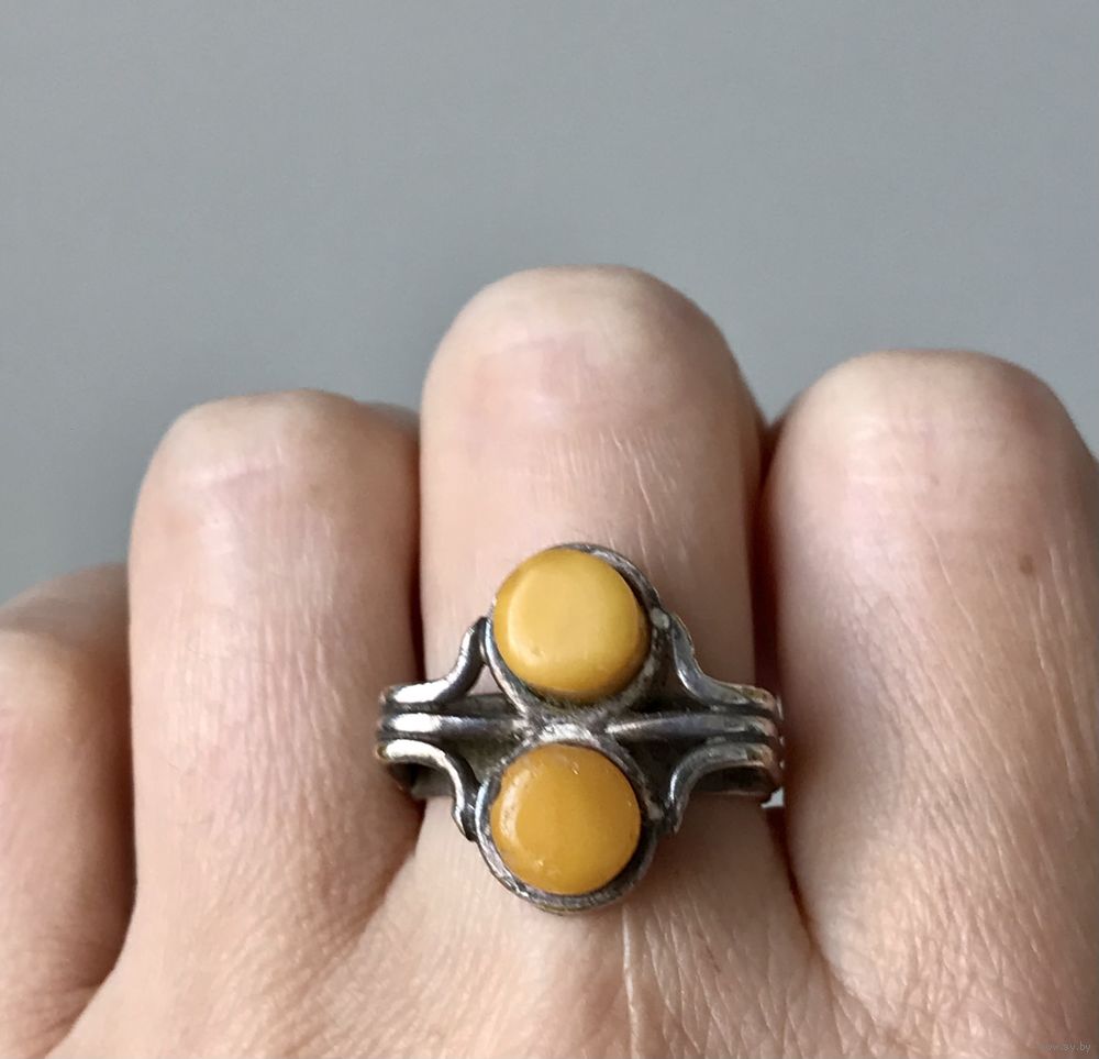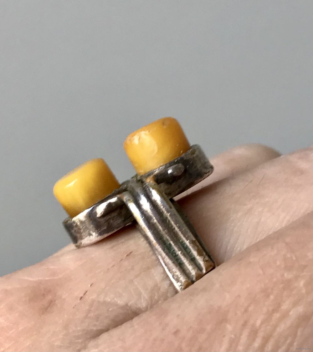 Винтажное брутальное кольцо с основой из латуни с серебрением (на металле местами имеется сход покрытия) и вставками из янтаря. Высота каста 2см., размер кольца 18.