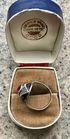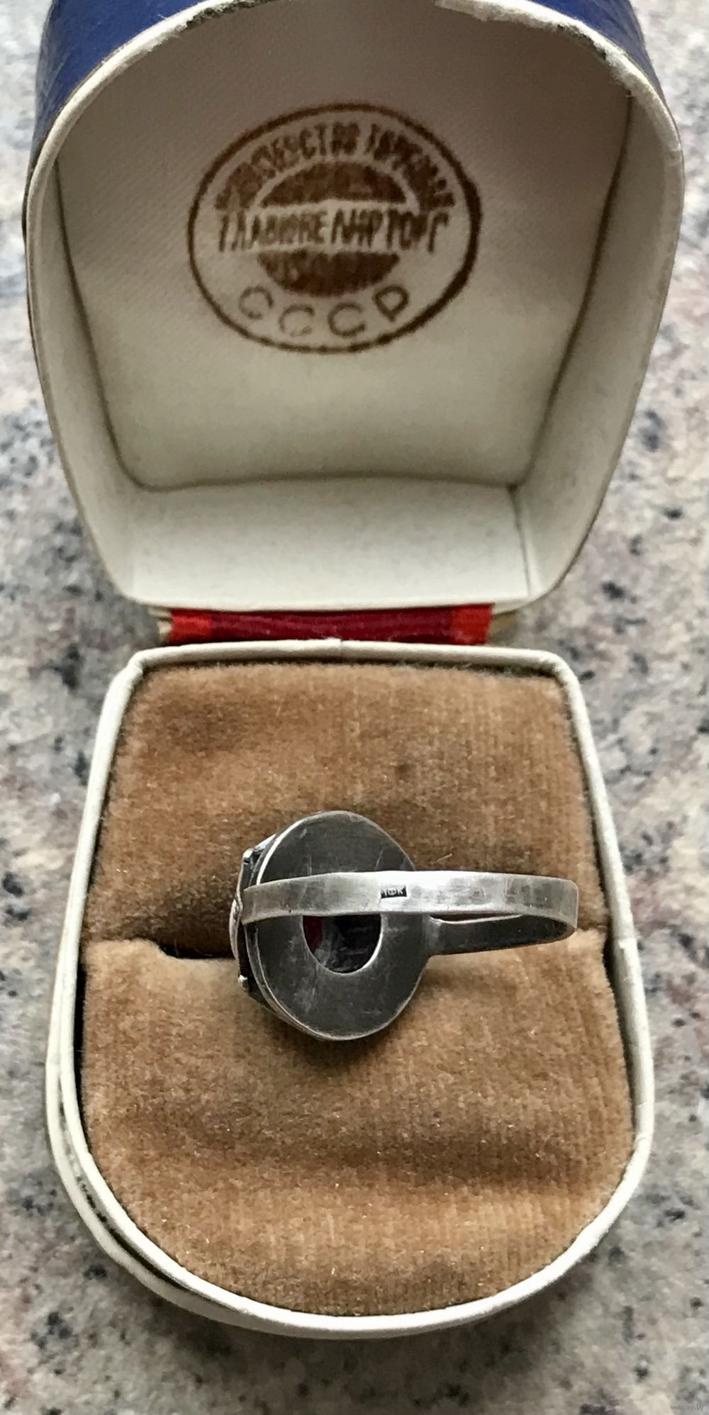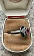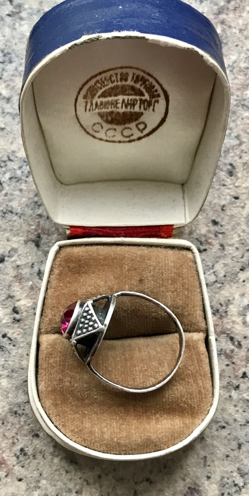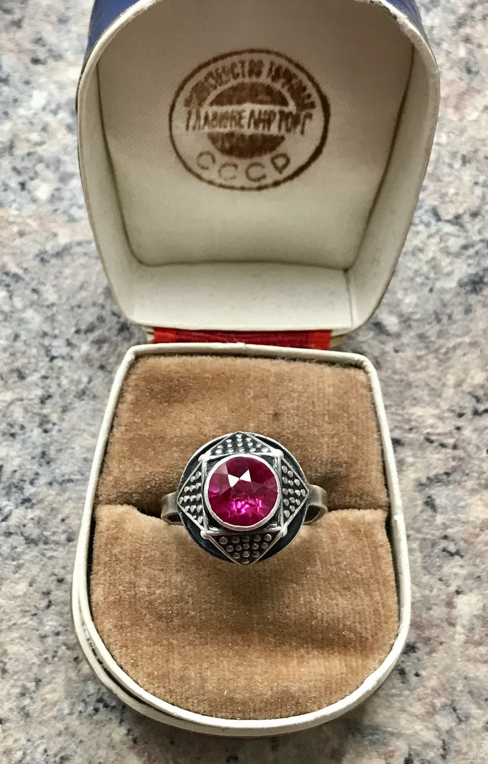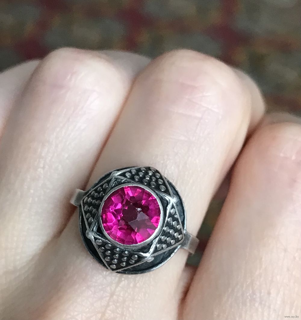 Кольцо редкой модели из серебра 875пр.(клеймо не сохранилось, т.к. был изменён размер). Изготовлено в 1971г. на ювелирной фабрике в с.Красное (сохранился именник 1ФК). Вставка синт.корунд (на одной грани есть незначительный скол). Высота каста 1,5см., диаметр вставки 0,8см. Размер кольца 19. Все нюансы учтены в цене.