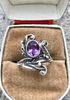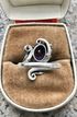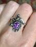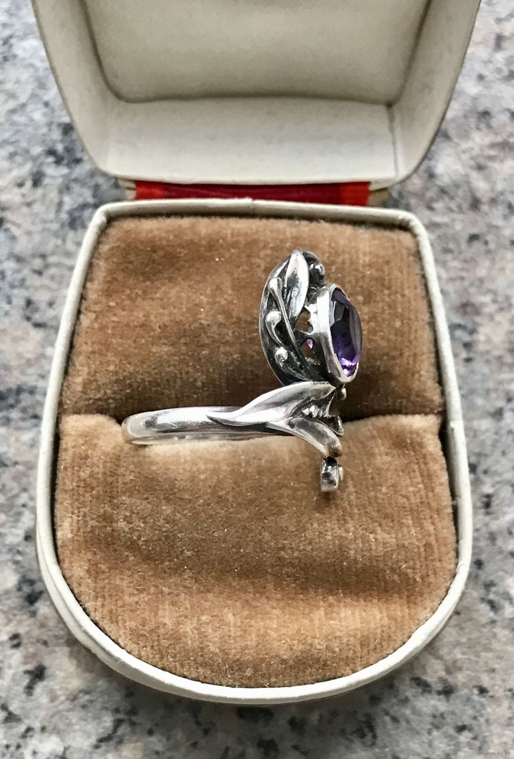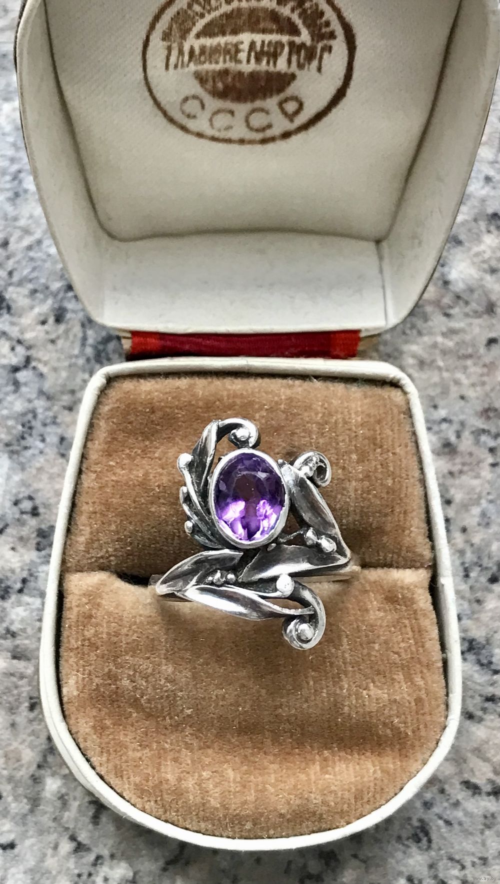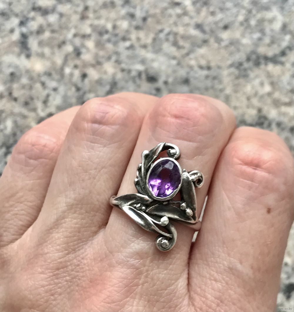 Крупное кольцо из серебра (отметок нет, проверено у ювелира) и вставки похожей на аметист. Высота каста 2,2см., размер вставки 0,8х0,6см.(на одной грани есть незначительный скол, в носке не заметен). Размер кольца 18.