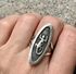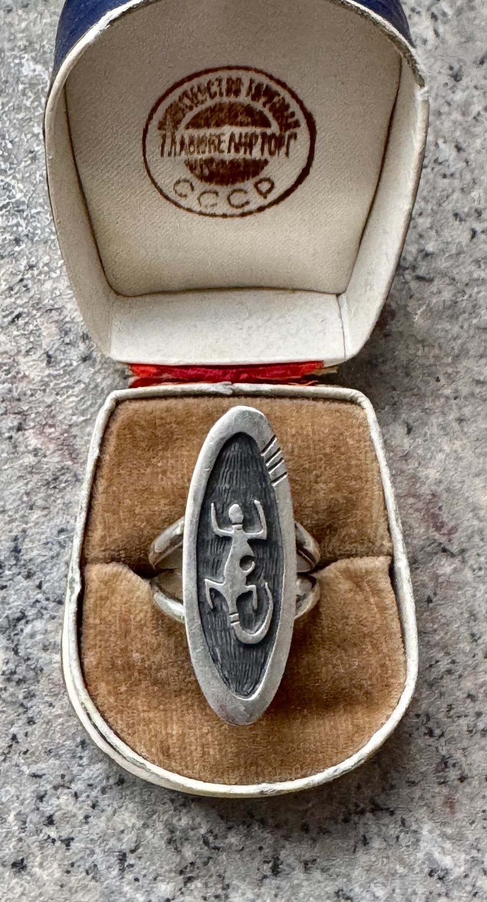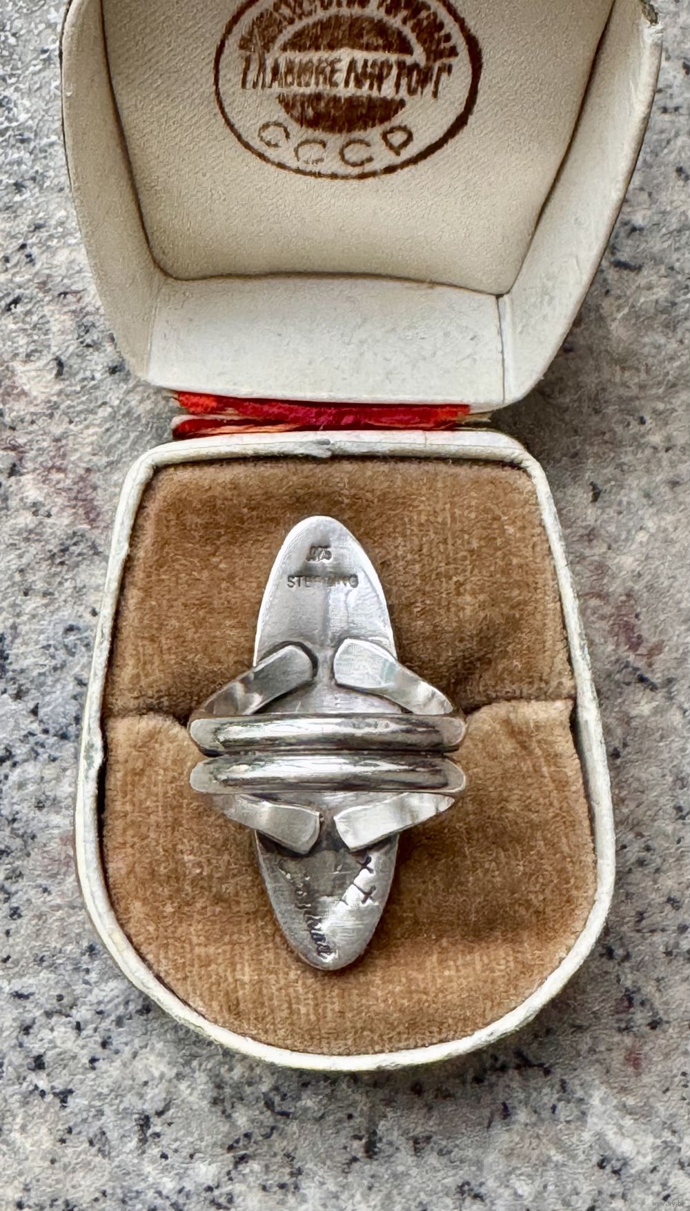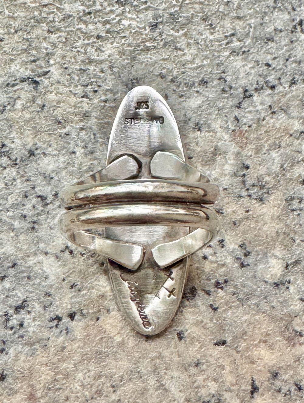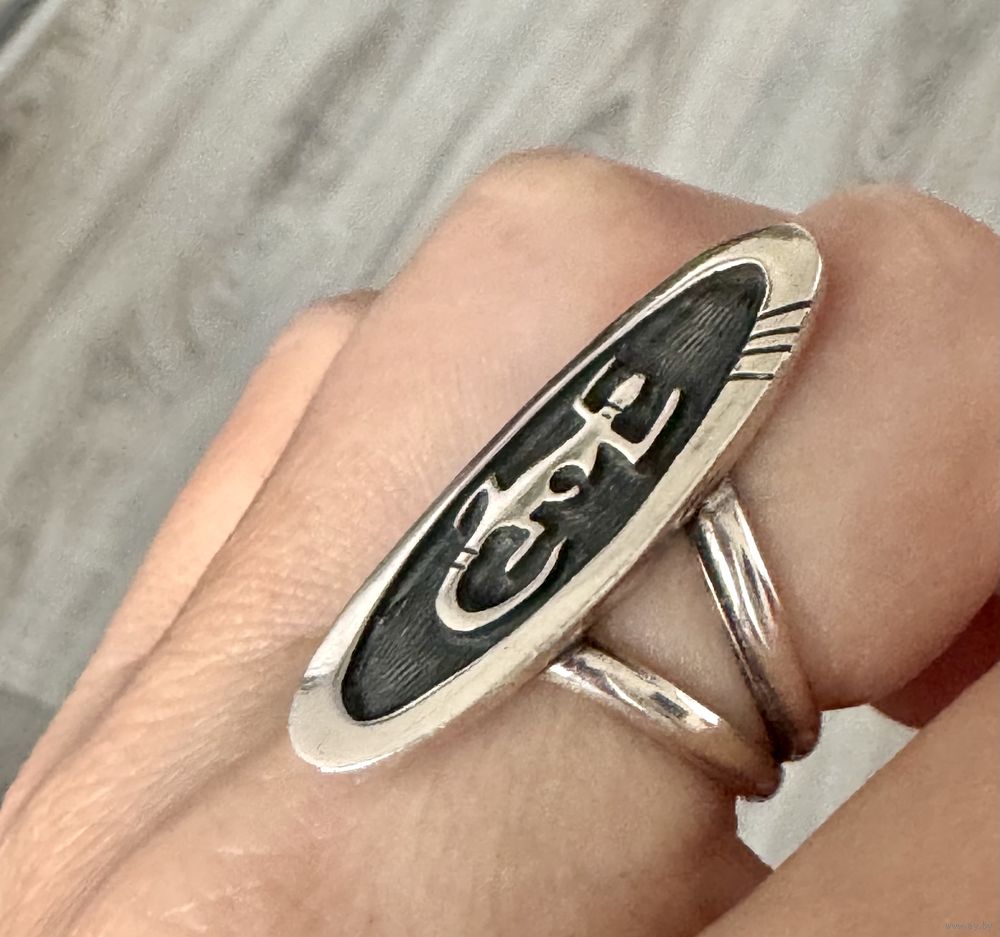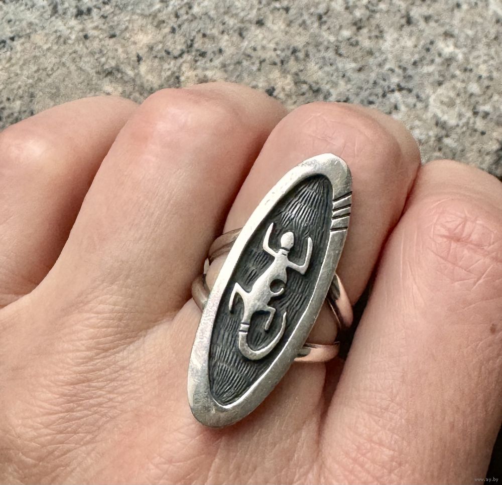 Крупное винтажное кольцо из серебра, сделано в Северной Америке мастером племени Hopi. На обратной стороне стоят отметки 925 sterling и клеймо мастера. Высота каста 3,4см., размер кольца 17, вес 6,9гр. Состояние хорошее.