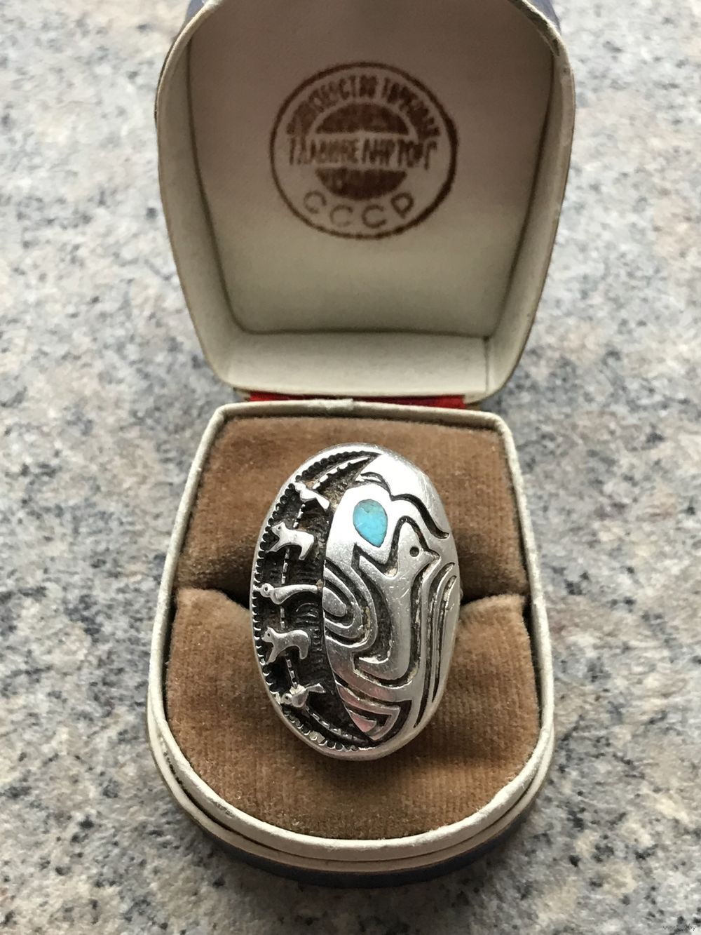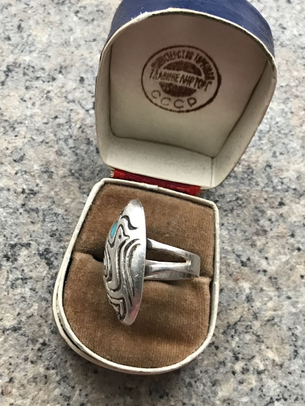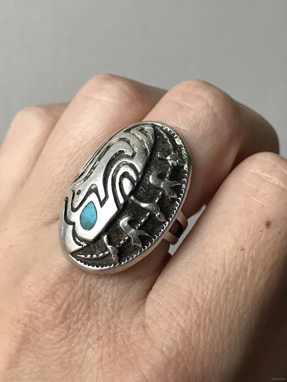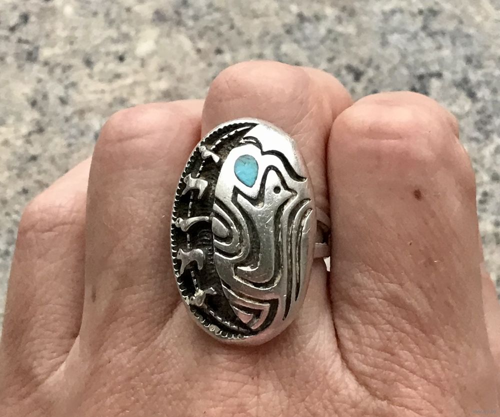 Винтажное крупное кольцо из серебра со вставкой из бирюзы. Северная Америка Navajo. Размер каста 3х2см., вес 12гр., безразмерное. Отметок нет. Металл проверен в юв.мастерской. Состояние хорошее.