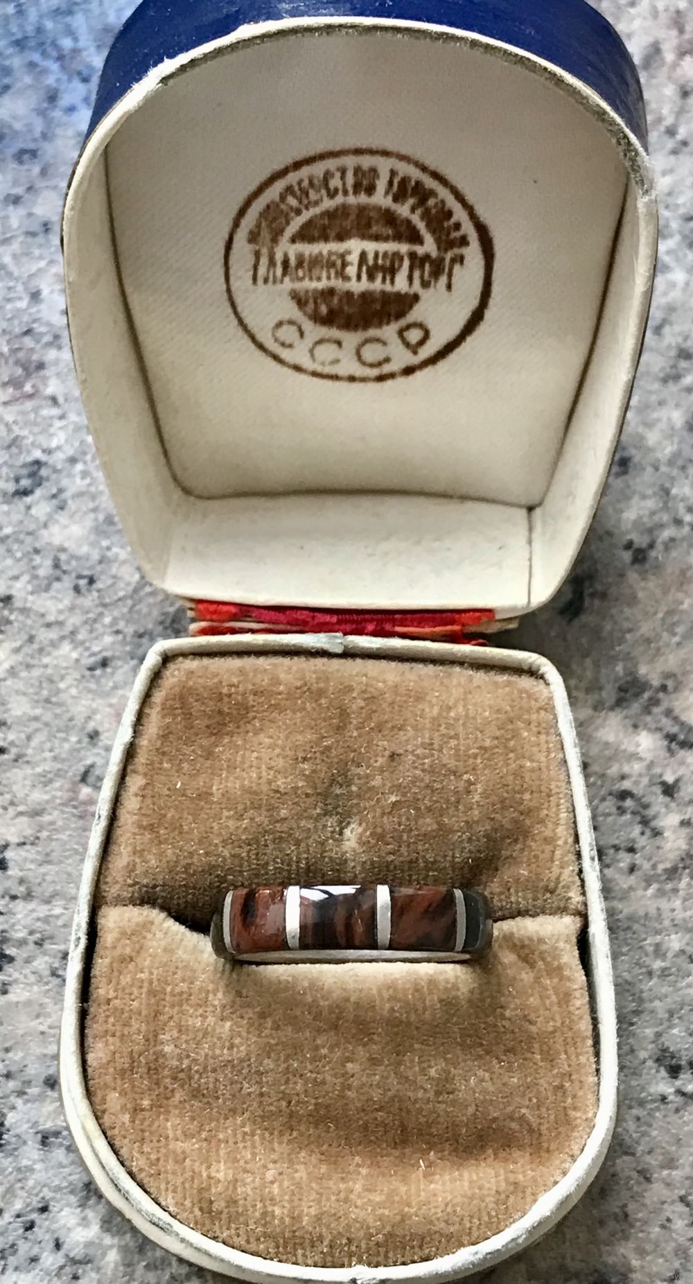 Винтажное кольцо с основой из мельхиора и вставками из камня (яшма). Высота кольца 0,4см.,размер 16. Состояние хорошее.