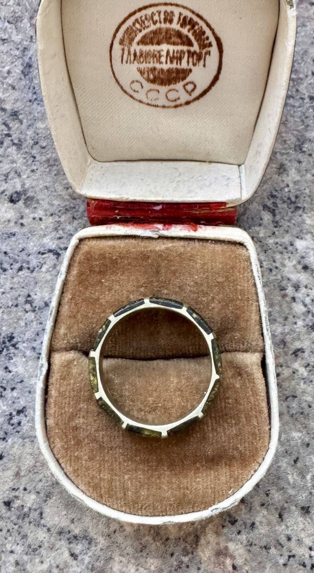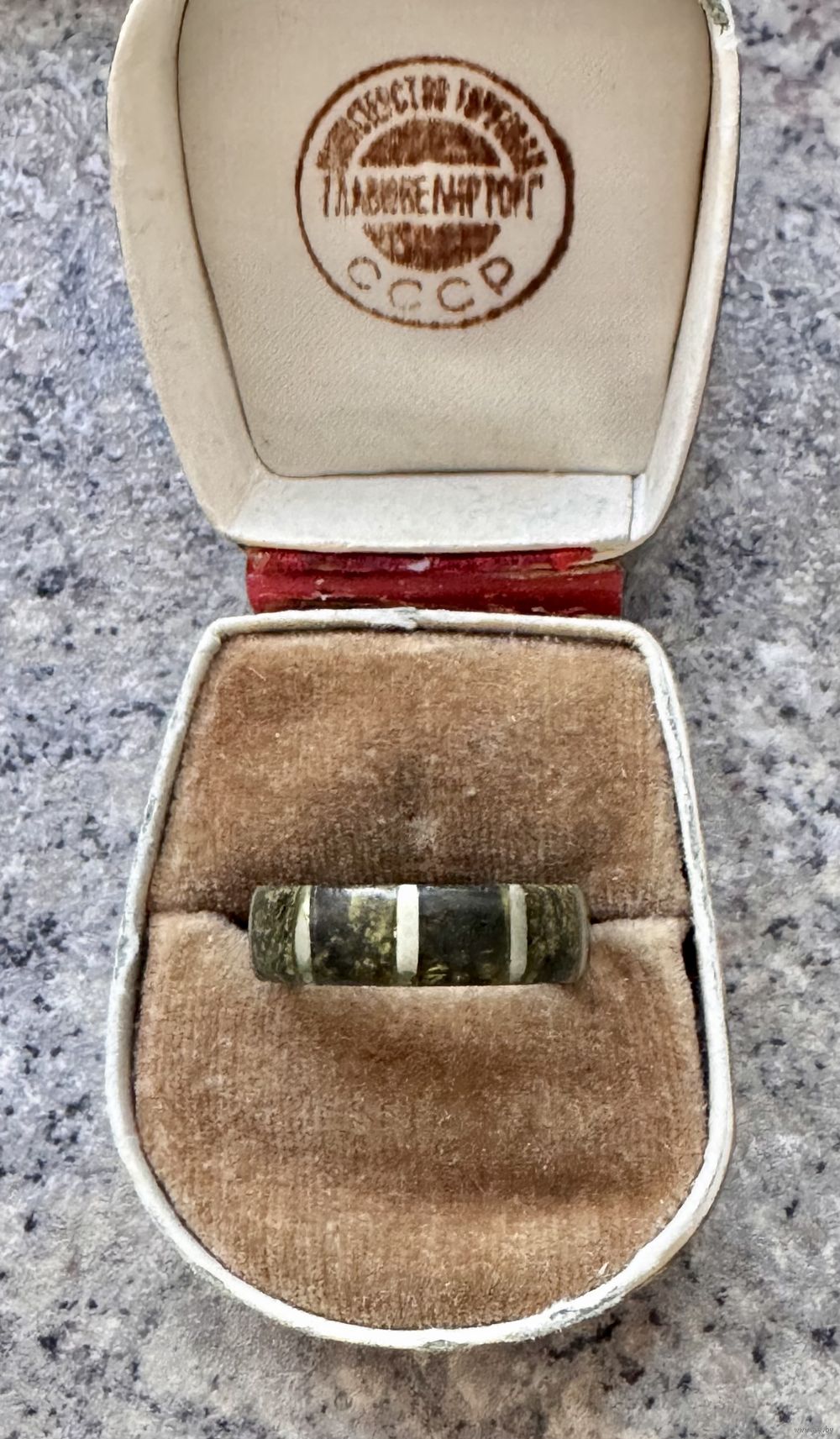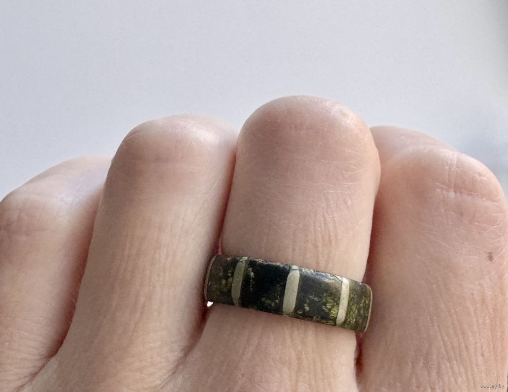 Винтажное кольцо с основой из мельхиора, вставки из камня змеевик. Высота кольца 0,6см., размер 17-17,5. Состояние хорошее.