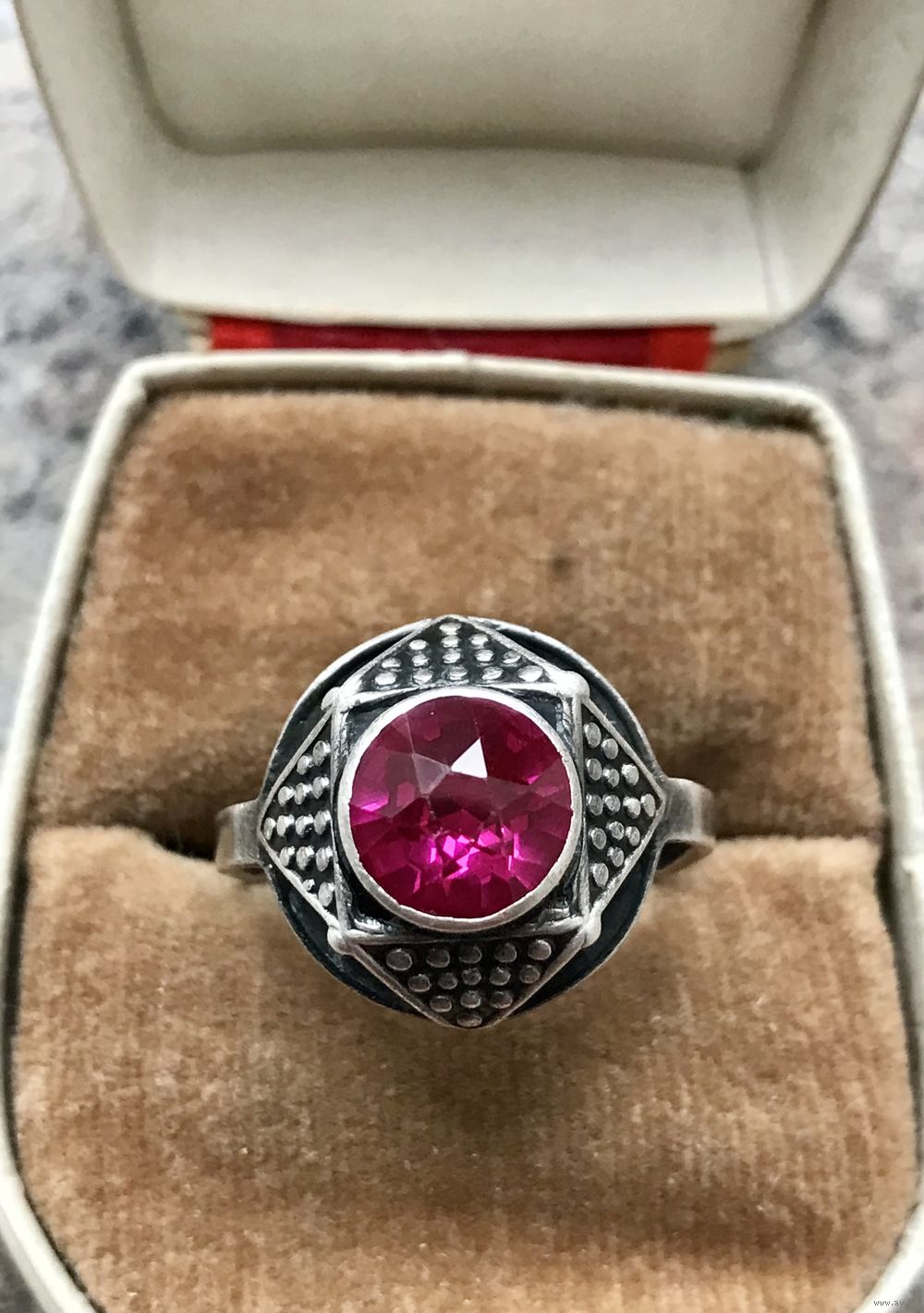 Кольцо редкой модели из серебра 875пр.(клеймо не сохранилось, т.к. был изменён размер). Изготовлено в 1971г. на ювелирной фабрике в с.Красное (сохранился именник 1ФК). Вставка синт.корунд (на одной грани есть незначительный скол). Высота каста 1,5см., диаметр вставки 0,8см. Размер кольца 19. Все нюансы учтены в цене.