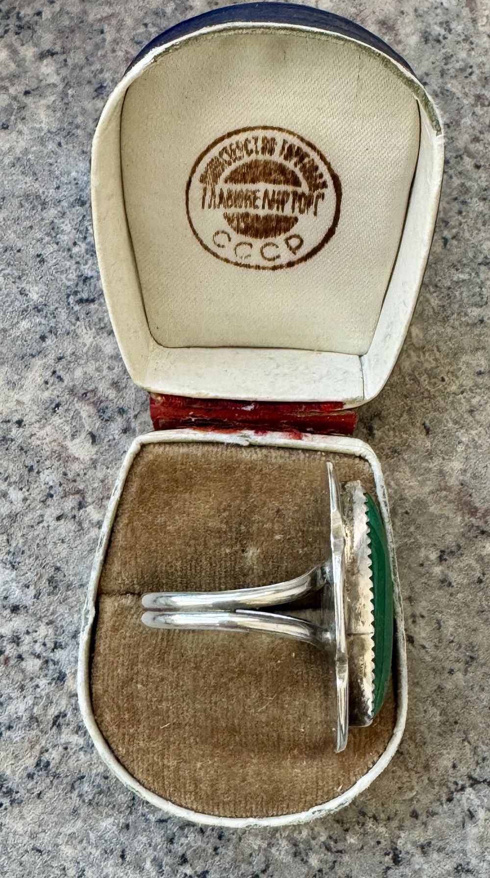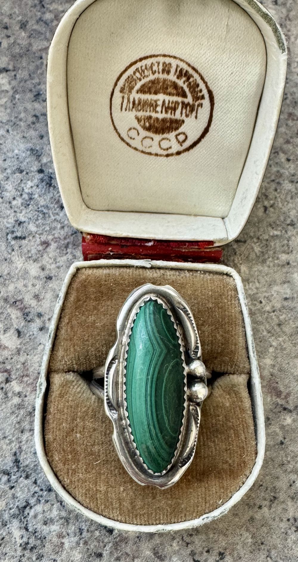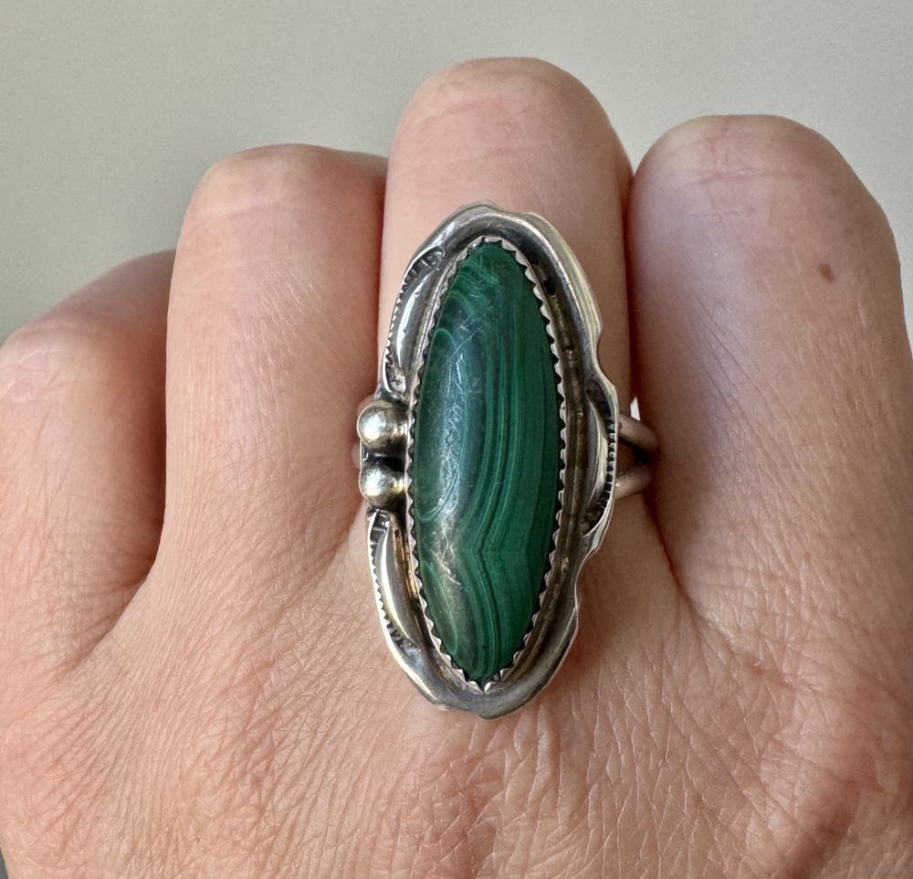 Винтажное кольцо из серебра и вставки из малахита. Кольцо сделано мастером племени Navajo (внутри стоят инициалы CT). Высота каста 3,4см., размер вставки 2,5х1см., вес кольца 9,14гр., размер 20. Состояние хорошее.