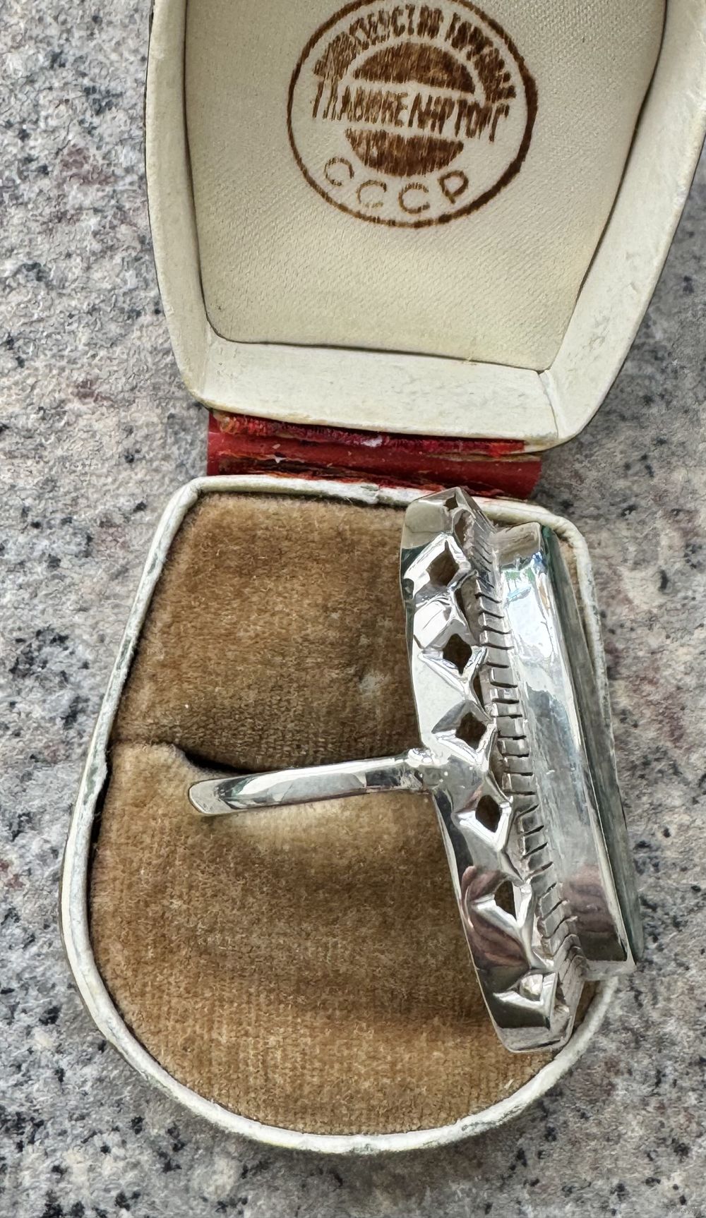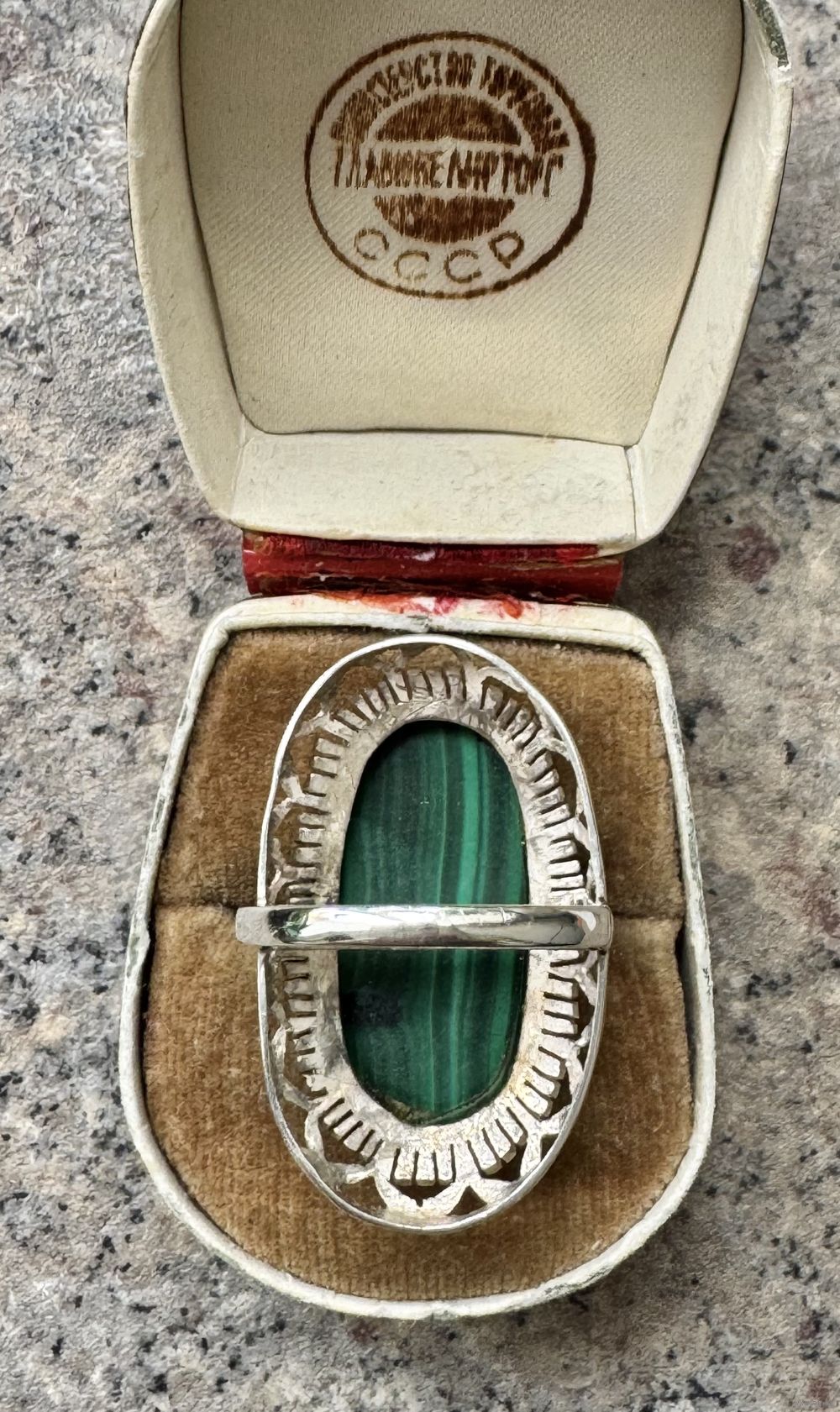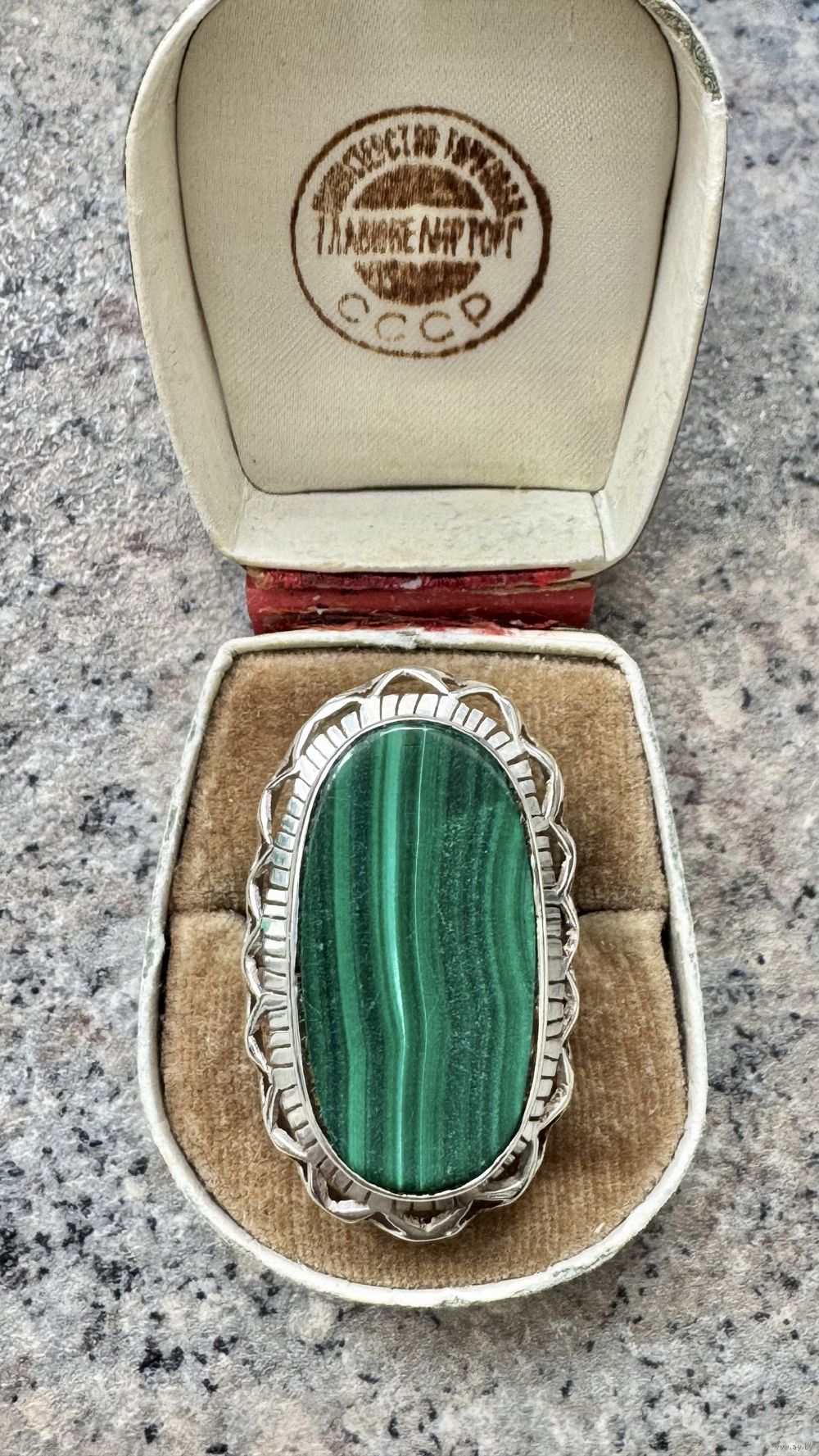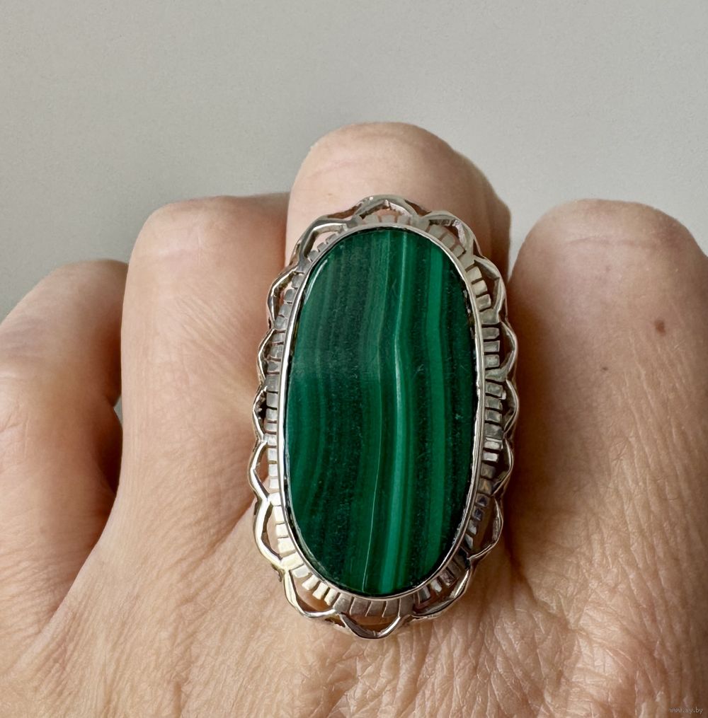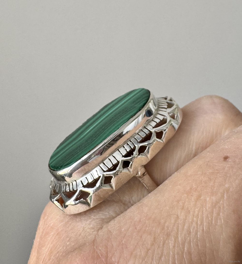 Крупное кольцо из серебра (отметок нет, металл проверен в юв.мастерской) и вставки из малахита. Размер каста 3,8х2,3см., размер вставки 2,8х1,5см., размер 19-20, вес 11,3гр. Состояние хорошее.