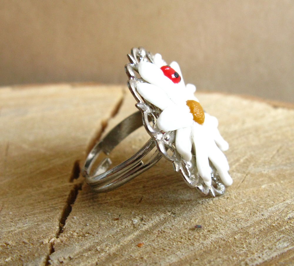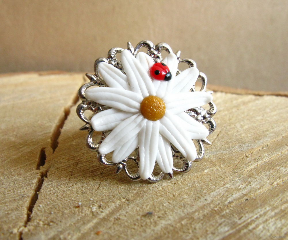 Полимерная глина. Диаметр ромашки -2,5 см. Размер кольца регулируется.