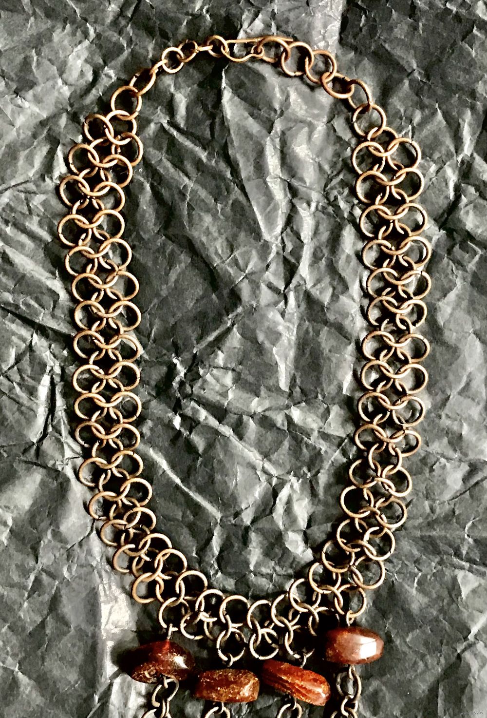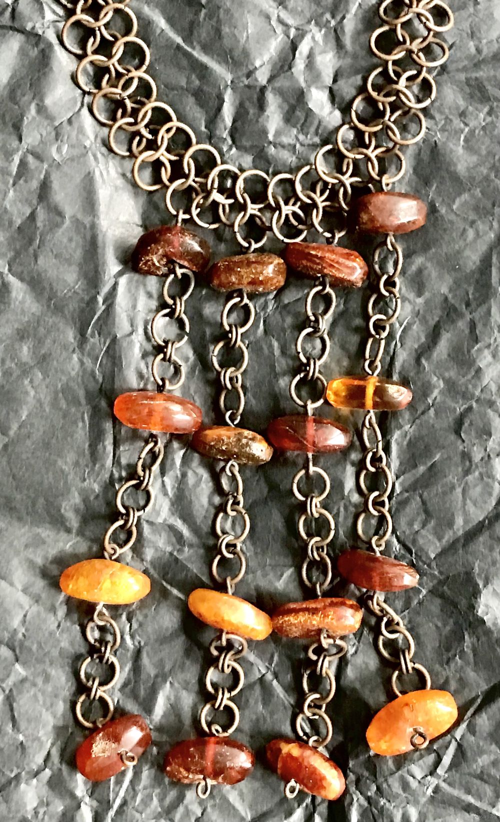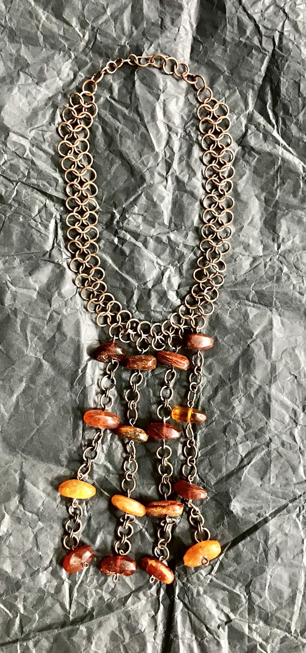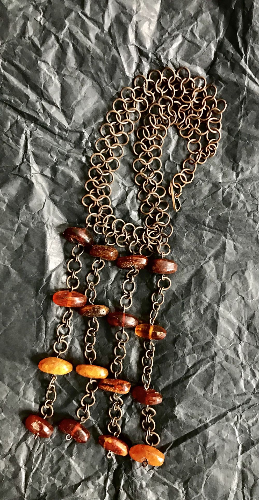 Винтажное колье-чокер из меди и кусочков янтаря. Максимальная длина украшения 36,5см., длина висюлек 12см. Состояние хорошее.