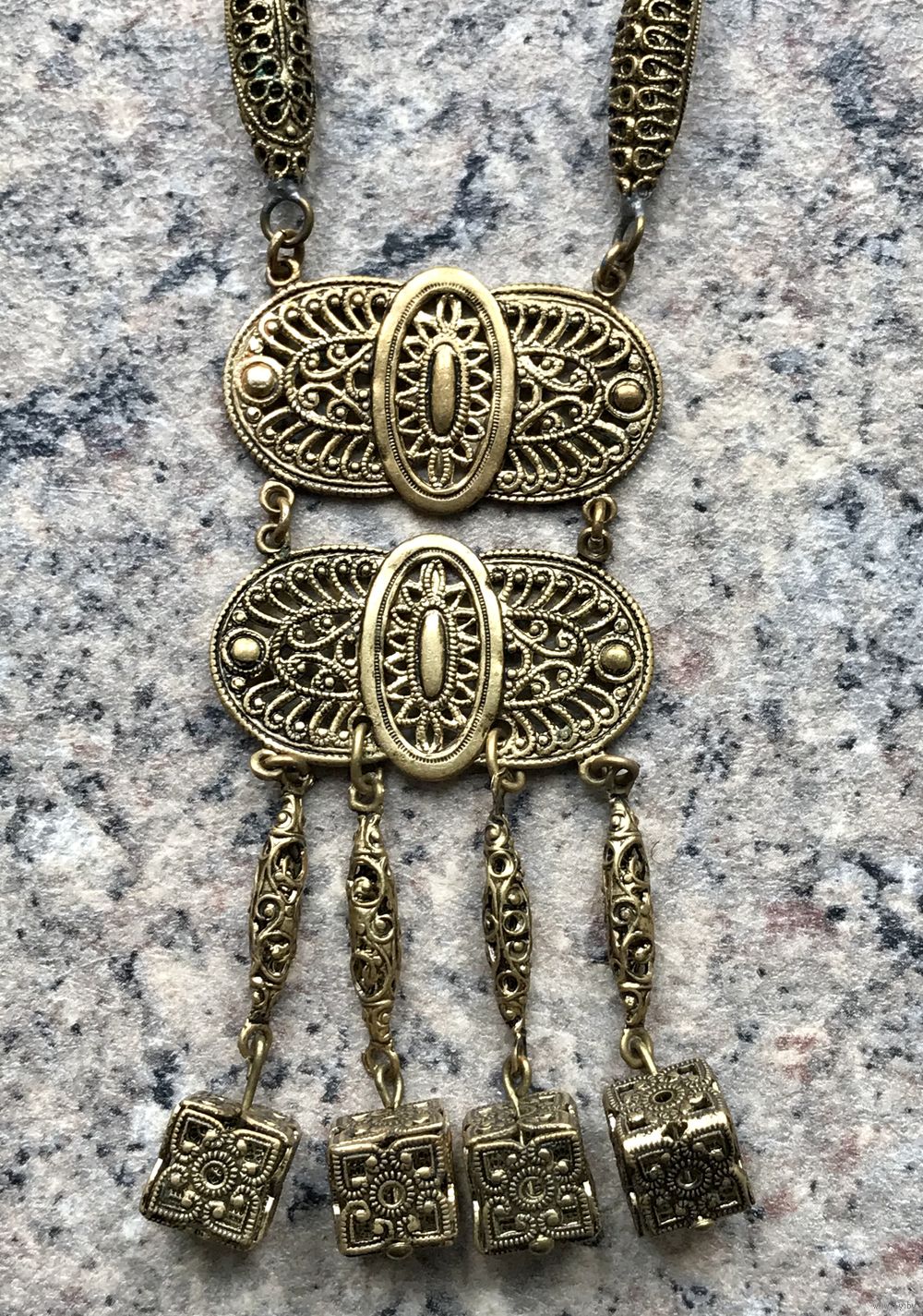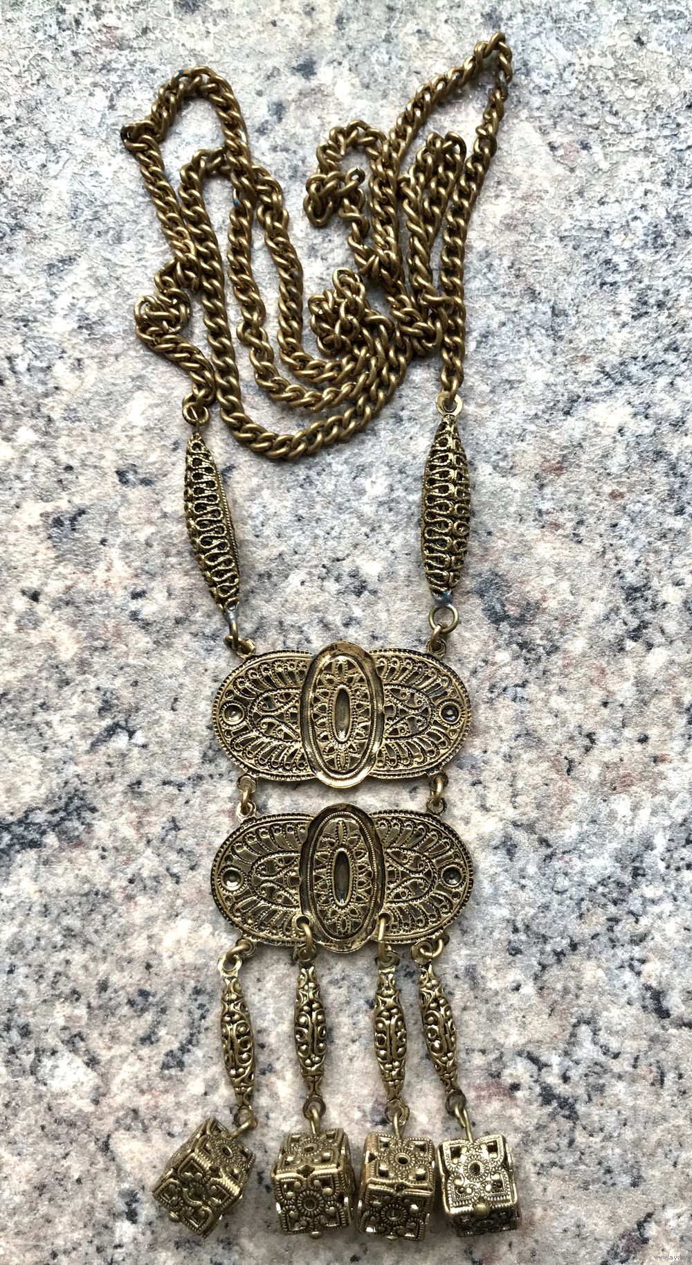 Винтажное редкое чешское украшение выполнено из латуни методом штампования под филигрань. Длина цепочки 56 см., подвеска в высоту 11 см., ширина 3,5см. Состояние хорошее.