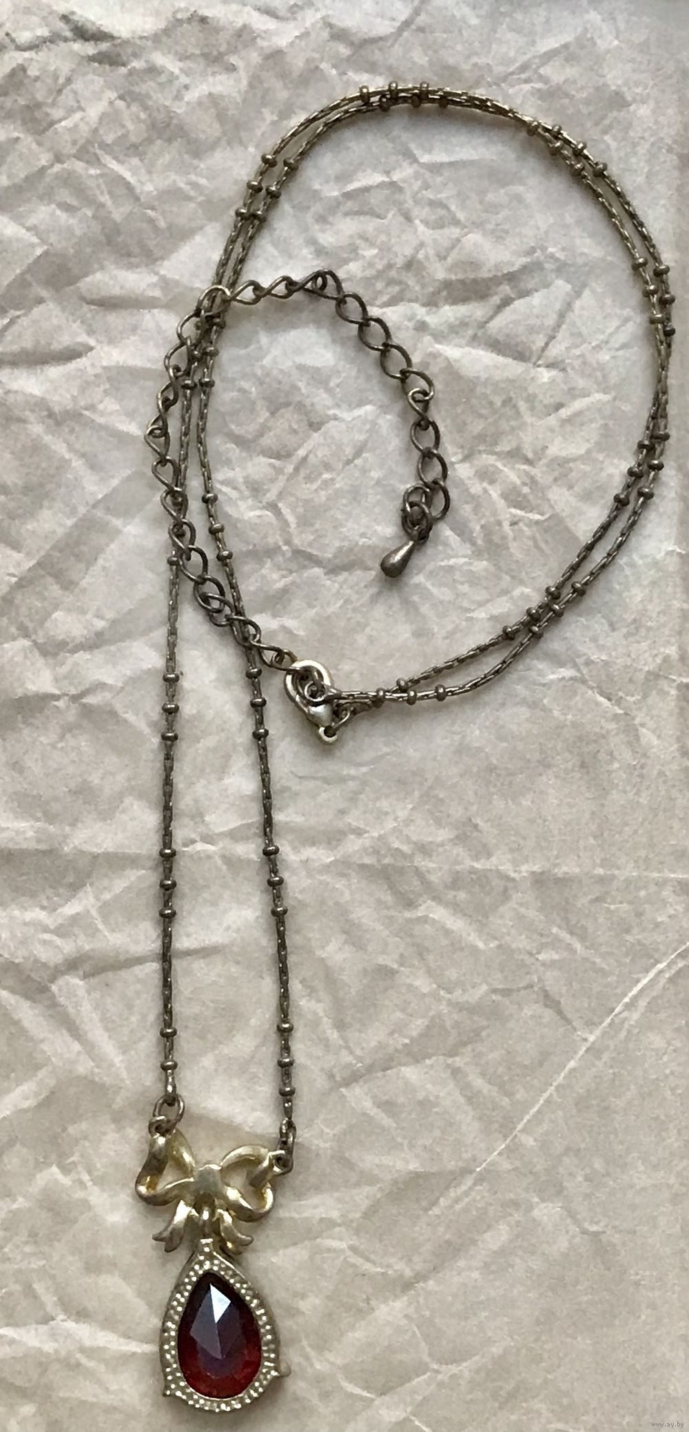 Винтажное колье из металла золотого тона, в подвеске кристалл рубинового цвета. Длина украшения 48см.+10см.доп.цепочка, высота подвески 3см., размер вставки 1,5х1,3см. На металле есть местами незначительные потемнения. Общее состояние украшения хорошее.