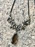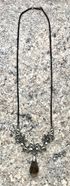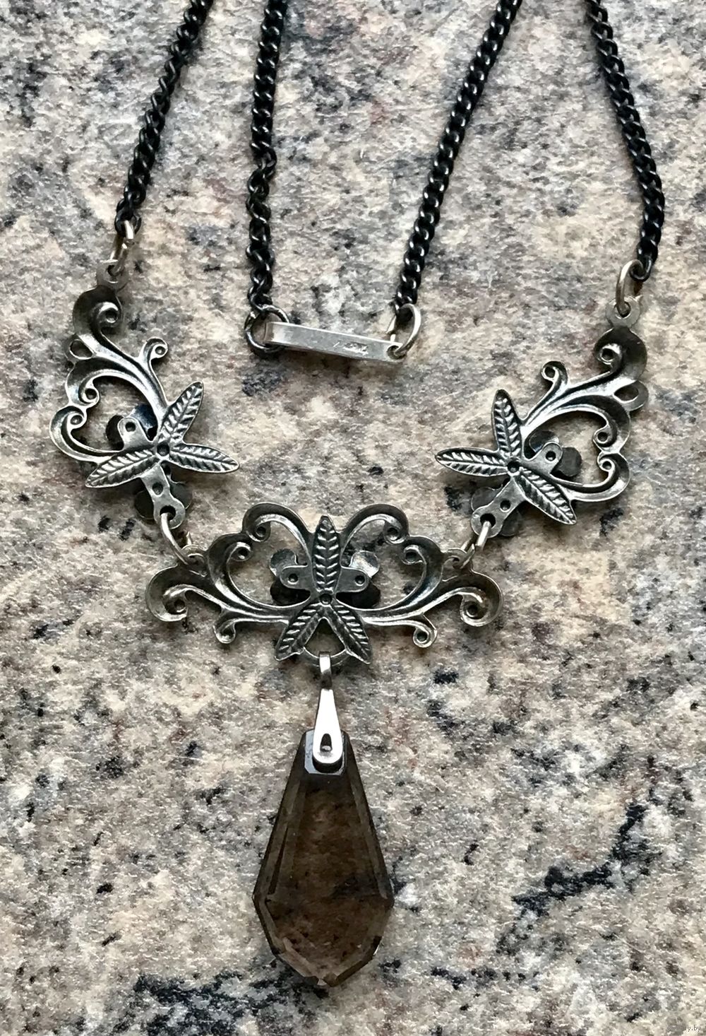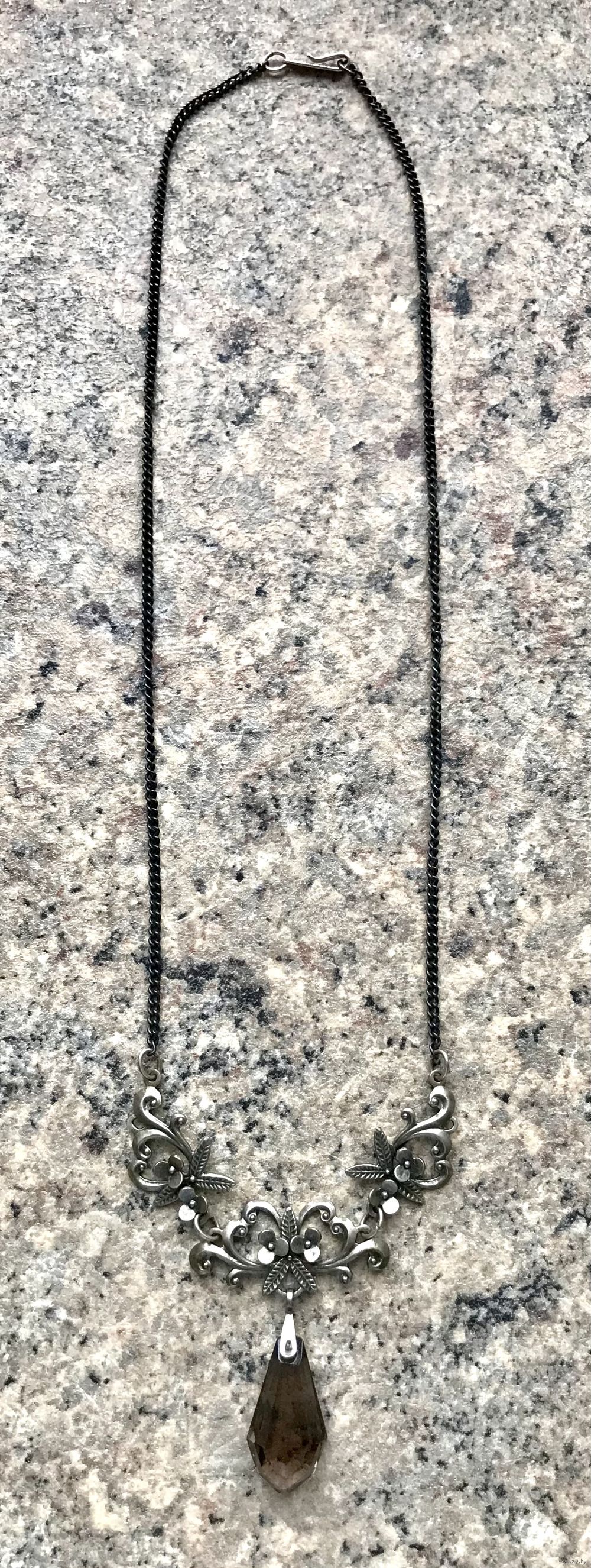 Редкое колье (60-70-е гг. СССР завод Красная Пресня) из мельхиора, подвеска в виде граненой капли из ювелирного стекла под дымчатый кварц. Длина цепочки 40см., декоративная часть с кулоном 7 см., высота капли из стекла 2см. Клеймо. Состояние хорошее.