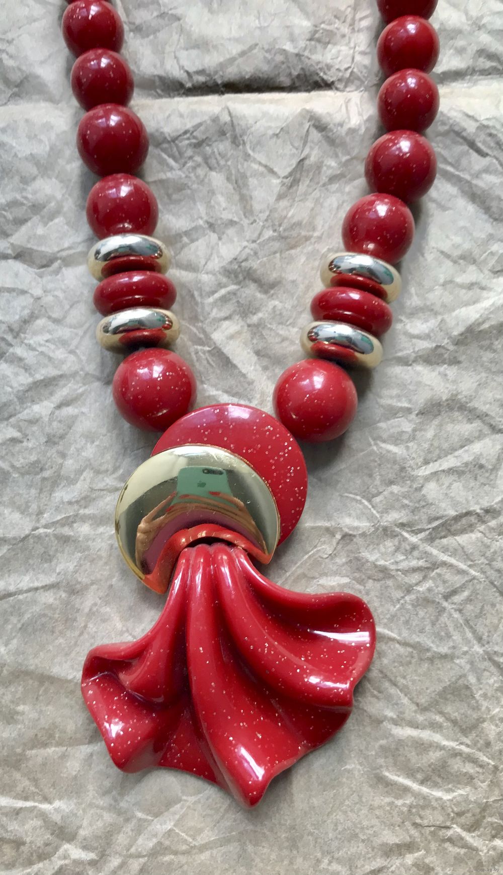 Крупное винтажное колье из пластика. Длина 46см., диаметр бусин от 1,2 до 1,7см., размер подвески 8х6см. Состояние хорошее.