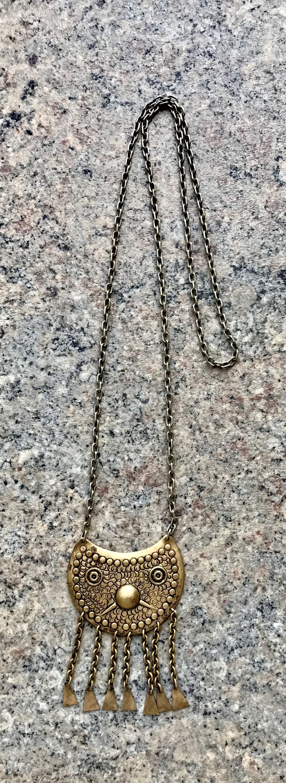 Винтажное колье из латуни с чернением. Длина цепочки 70см., высота подвески с висюльками 7,8см., ширина 5см. Состояние хорошее.