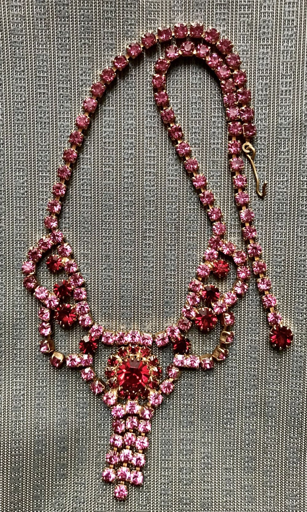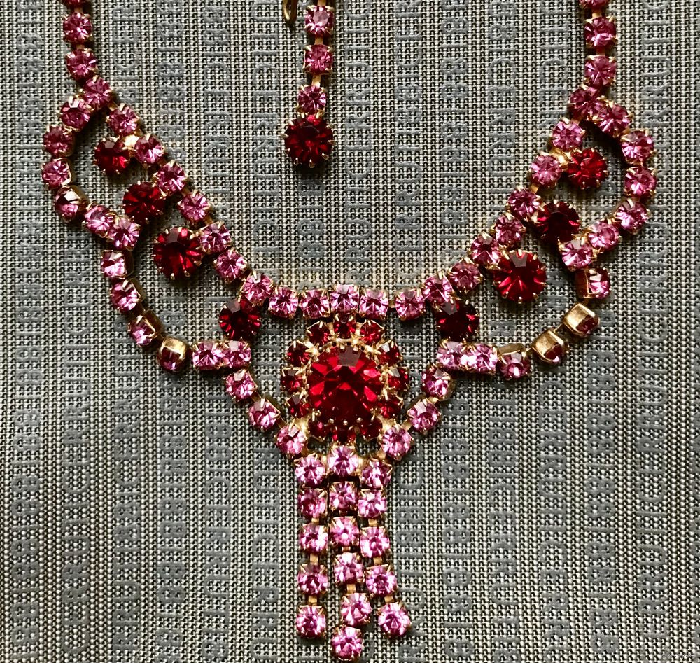 Винтажное чешское колье с основой из латуни с позолотой, лицевая сторона украшена кристаллами из цветного стекла. Максимальная длина колье 47см., но из-за дизайна застёжки можно сделать короче. Состояние хорошее.