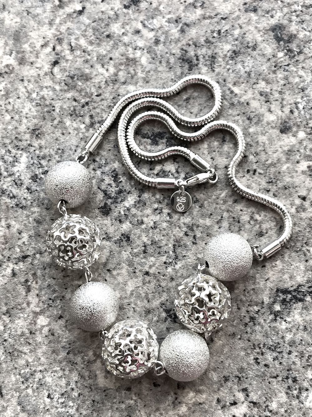 Эффектное колье состоящее из цепочки плетения снейк и бусин-шариков двух видов. Колье изготовлено из медицинской стали и покрыто серебром 925пр. Длина с застежкой 46см, сахарные шарики диаметром ~1,5см, резные~1,7см. Состояние хорошее.