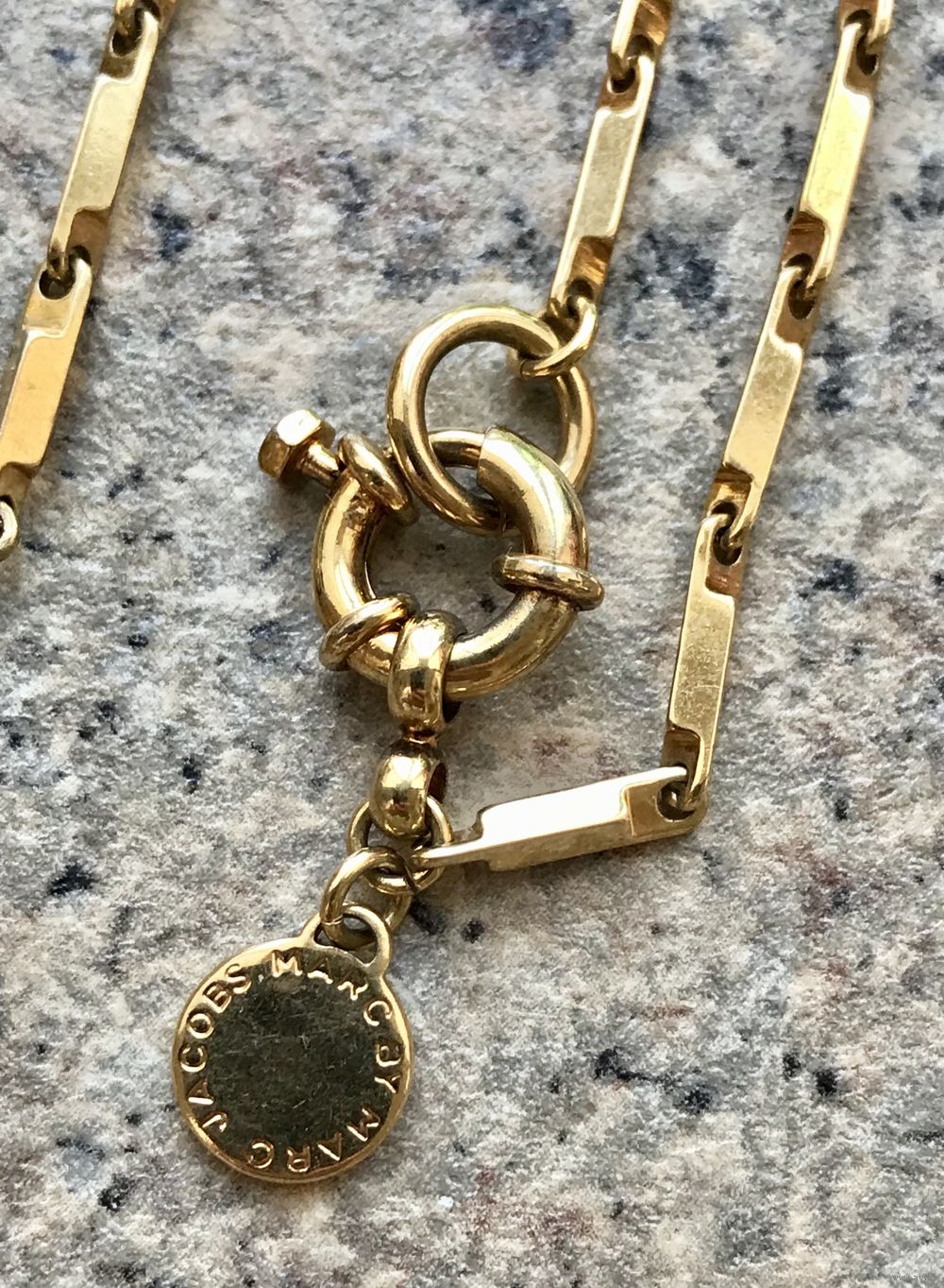Эффектное украшение от одного из самых влиятельных американских модельеров Марка Джейкобса (Marc Jacobs). Колье изготовлено из металла золотого тона, подвески с лицевой стороны украшены эмалью чёрного цвета и элементом из плотного пластика. Длина цепочки 84см., высота центральной подвески 6см., присутствуют незначительные следы бытования. Маркировано.
