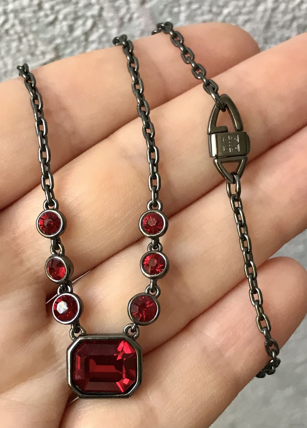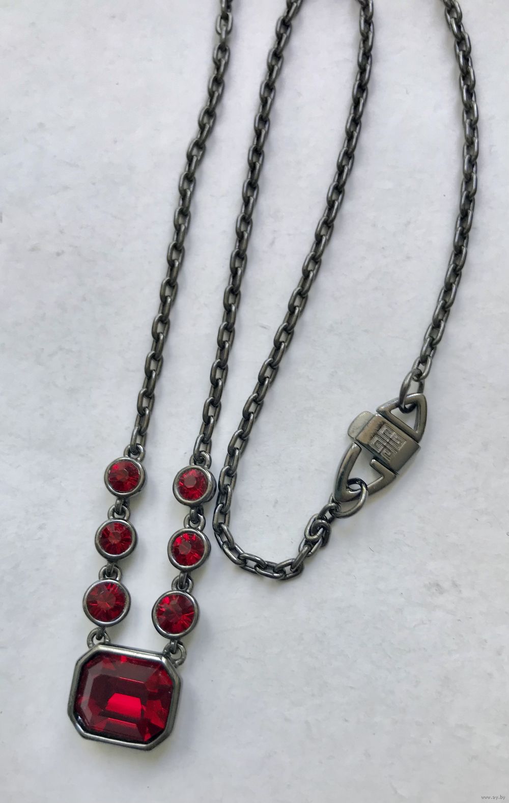 Винтажное колье Givenchy. Основа выполнена из бижутерного сплава с оксидированием, что придаёт металлу темный цвет, центральная часть украшена кристаллами насыщенного красного цвета. Длина украшения 40см. Маркировано на застёжке. Состояние хорошее.