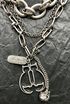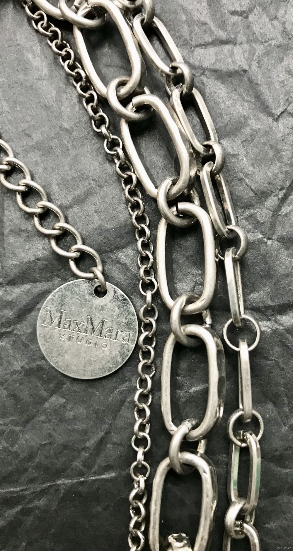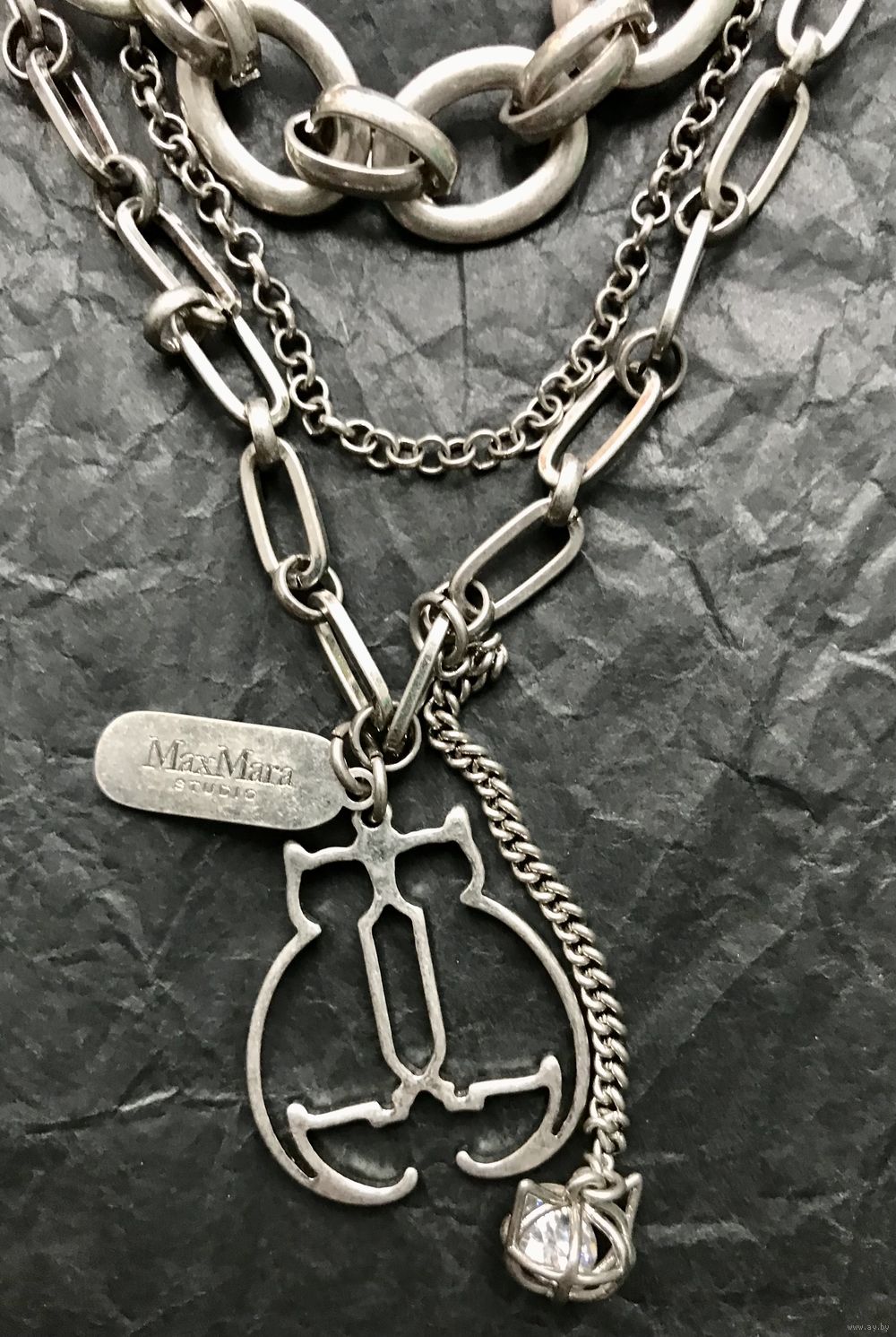 Трёхрядное колье Lacrima из коллекции MaxMara studio (линия бренда MaxMara). Изготовлено из металла цвета серебра. Длина верхней цепочки 46см., нижней 56см. Разъёмное. Состояние хорошее. Маркировано.