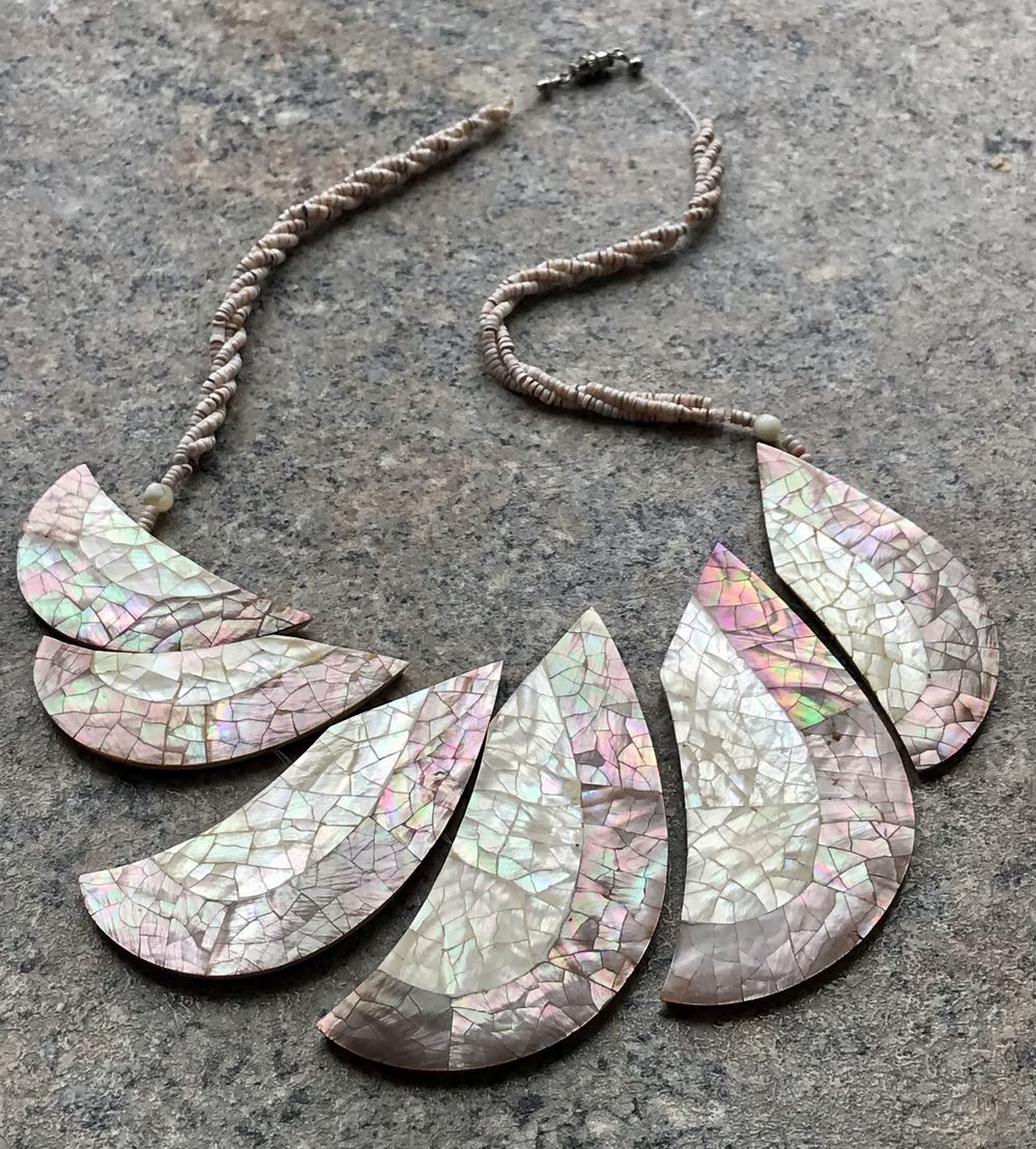 Винтажное крупное колье с основой из плотного пластик, лицевая сторона украшена кусочками перламутра. Длина украшения 54см. На обратной стороне имеется наклейка с надписью HANDCRAFTED, что означает, что украшение сделано вручную. Состояние хорошее.