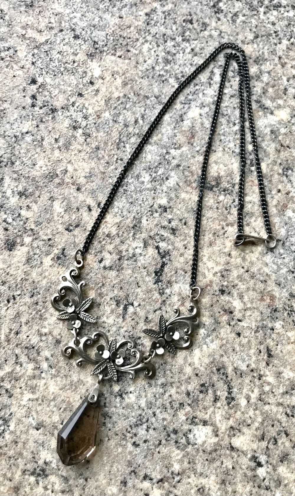 Редкое колье (60-70-е гг. СССР завод Красная Пресня) из мельхиора, подвеска в виде граненой капли из ювелирного стекла под дымчатый кварц. Длина цепочки 40см., декоративная часть с кулоном 7 см., высота капли из стекла 2см. Клеймо. Состояние хорошее.