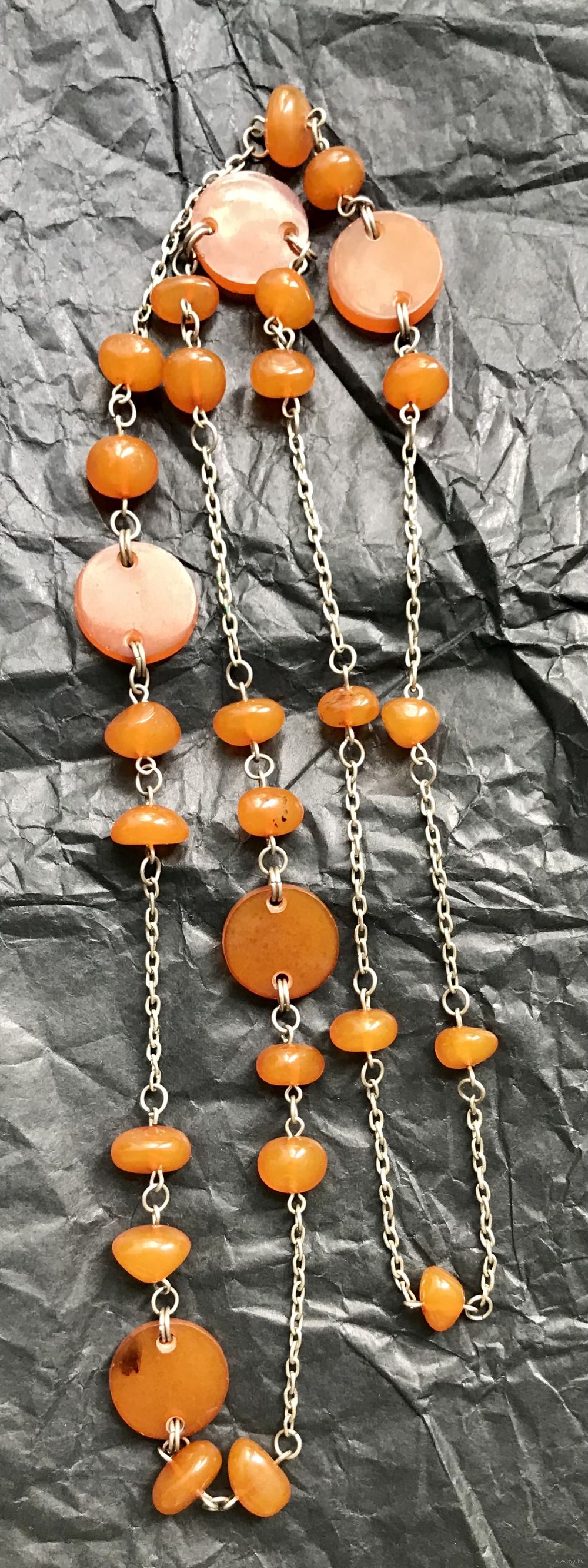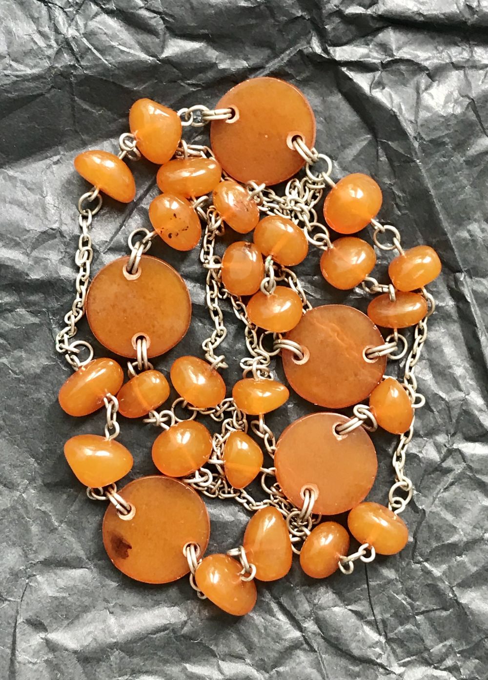 Винтажное колье из мельхиоровой цепочки, на которую нанизаны бусины из янтаря. Длина украшения 90см. Неразъемное. На нескольких бусинах есть небольшие скольчики.
