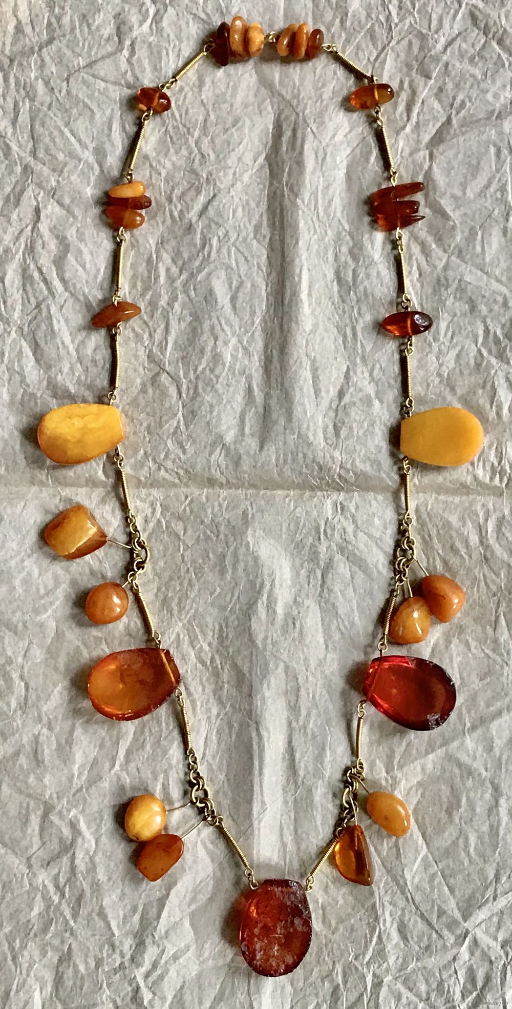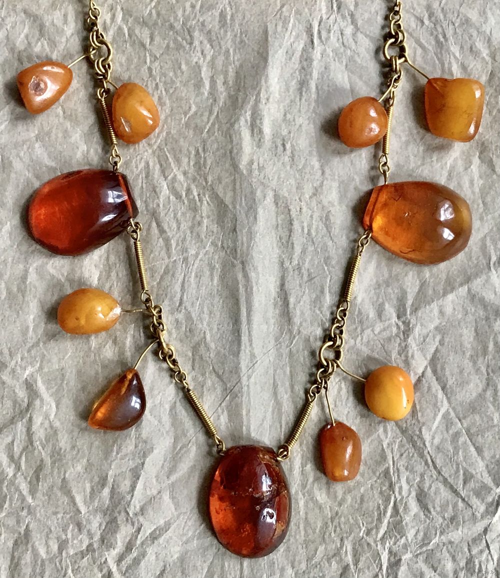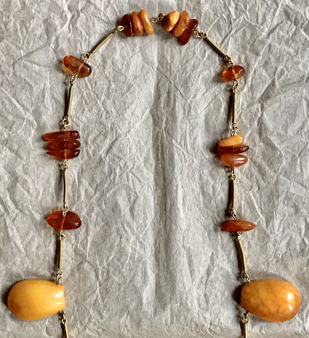 Колье «Золотая осень» авторства В.Шорохова с основой из латуни с позолотой и кусочков природного янтаря разных видов. Длина украшения 72см., неразъемное. Размер крупных прозрачных кусочков янтаря 3,2х2,4см., янтаря желток 2,8х2см. На вставках имеются незначительные следы времени и неровности и шероховатости естественного происхождения. Украшение изготовлено в 1964г. в Калининграде (на одном колечке стоит именник ЯК4).