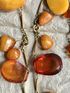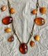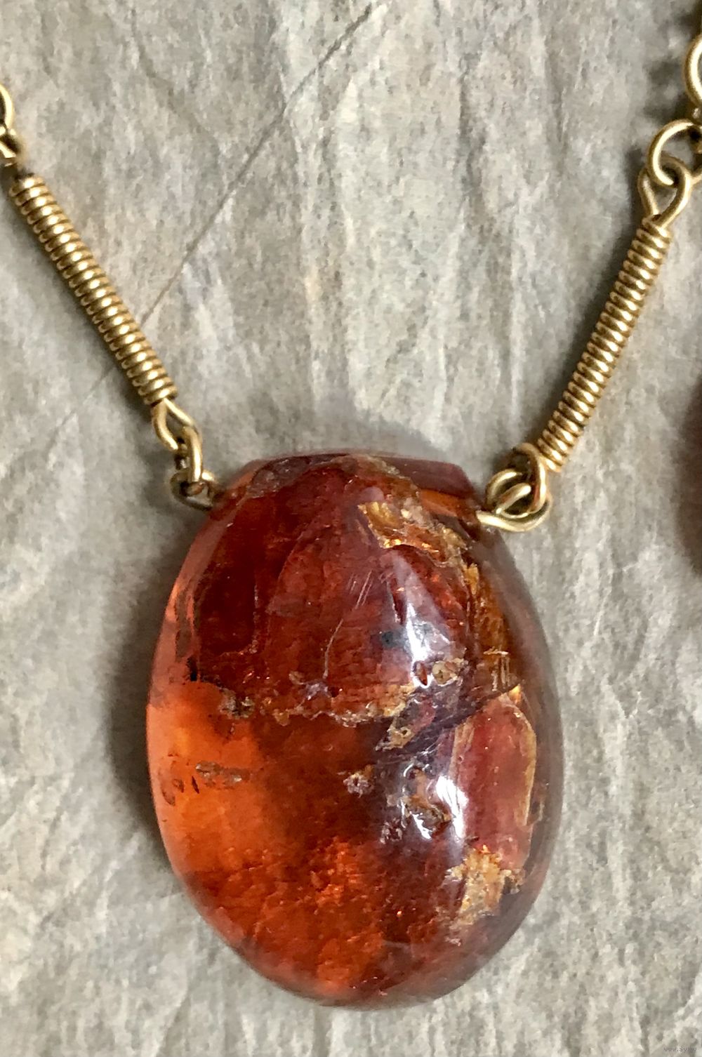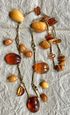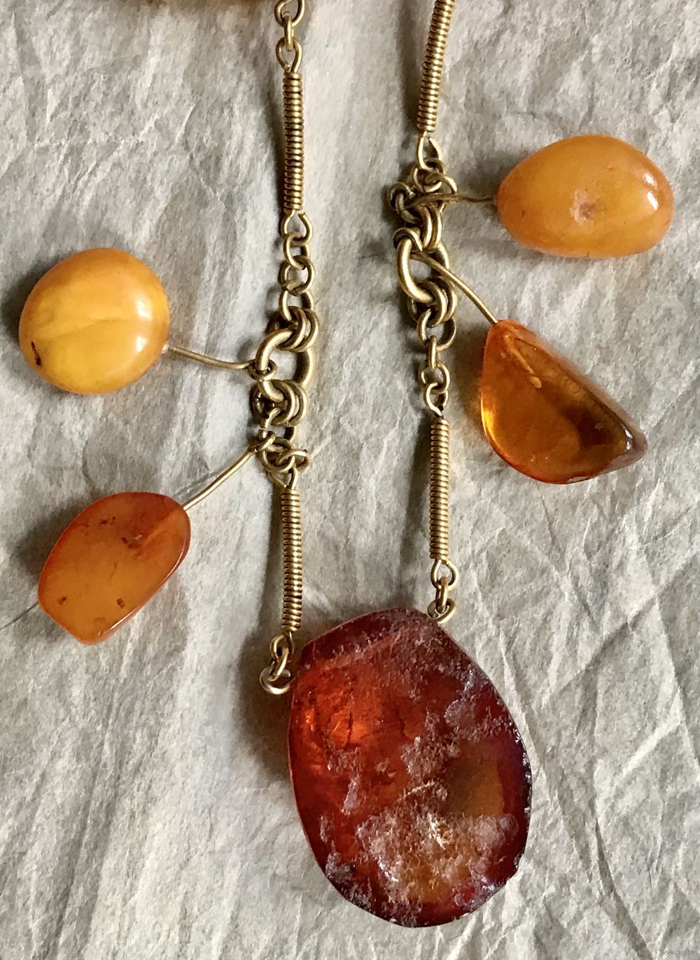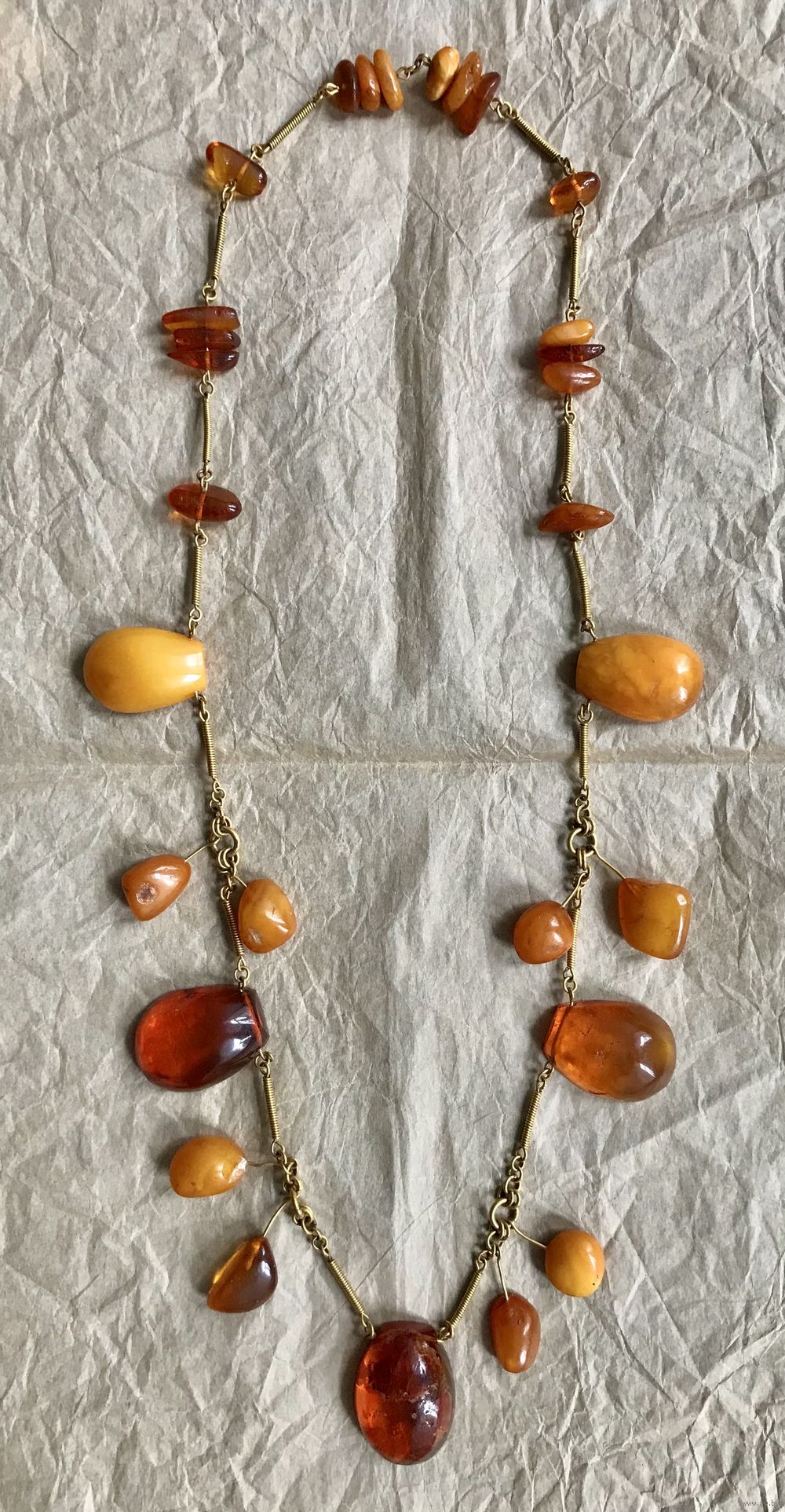 Колье «Золотая осень» авторства В.Шорохова с основой из латуни с позолотой и кусочков природного янтаря разных видов. Длина украшения 72см., неразъемное. Размер крупных прозрачных кусочков янтаря 3,2х2,4см., янтаря желток 2,8х2см. На вставках имеются незначительные следы времени и неровности и шероховатости естественного происхождения. Украшение изготовлено в 1964г. в Калининграде (на одном колечке стоит именник ЯК4).