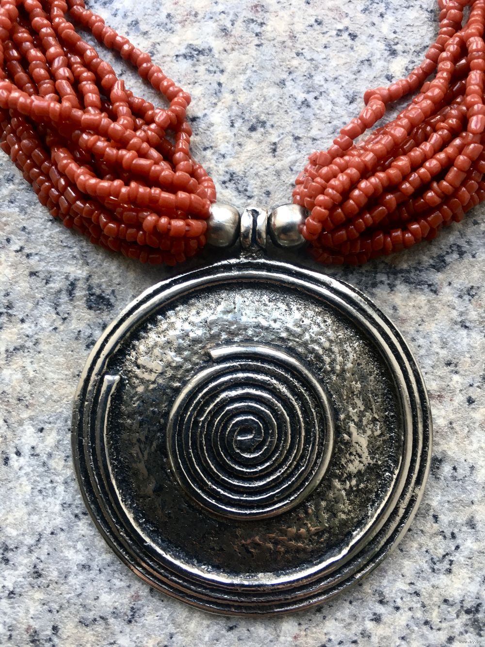 Колье винтажное из бисера кораллового цвета с кулоном. Колье состоит из 18 нитей бисера, диаметр кулона 5 см., длина бус 44 см. (без учета кулона), состояние хорошее.