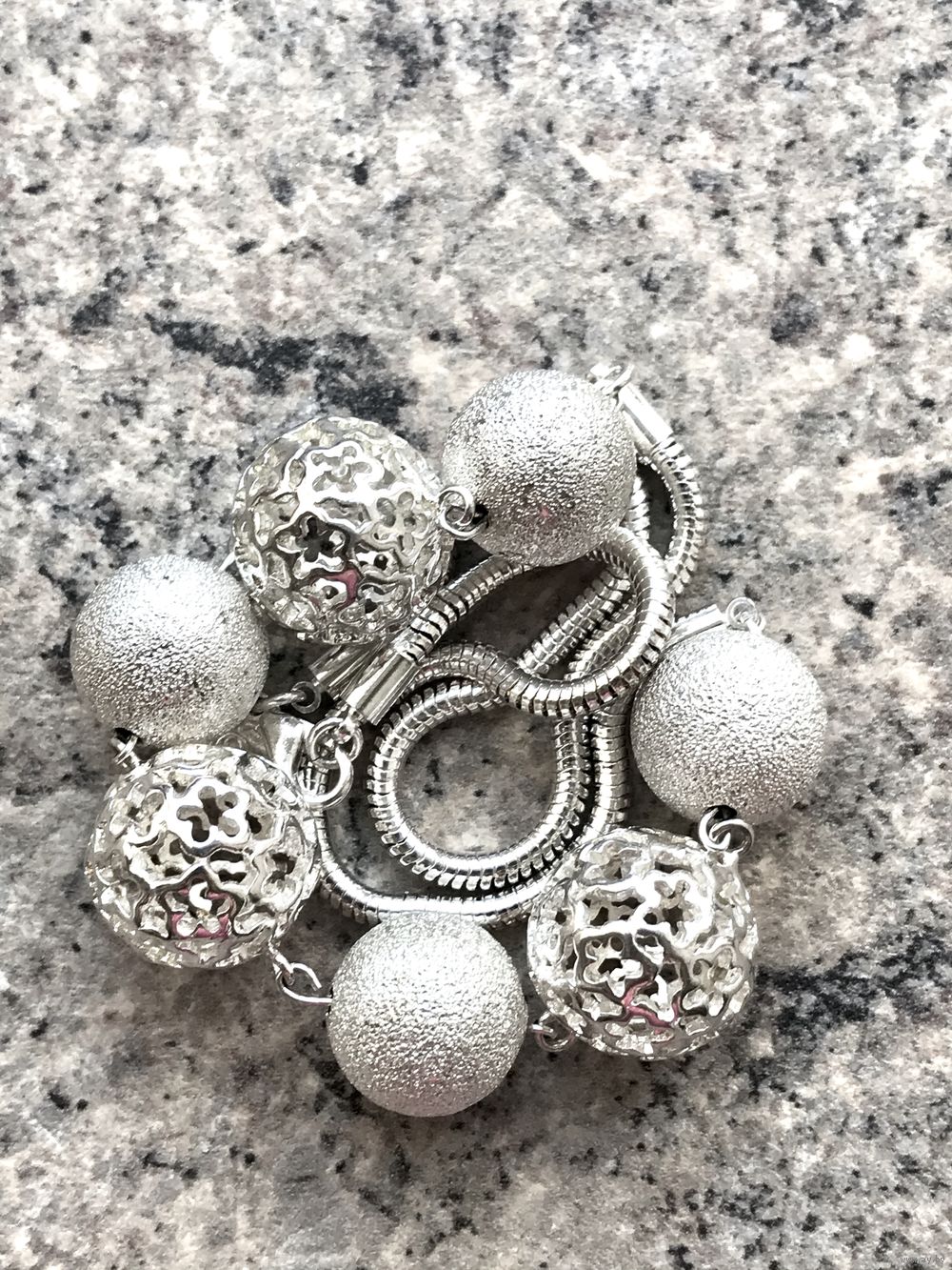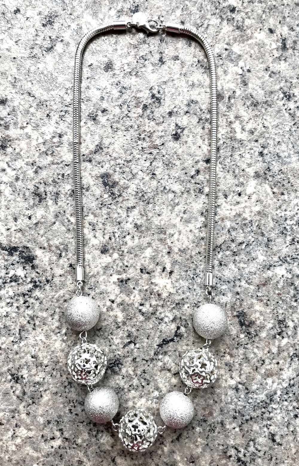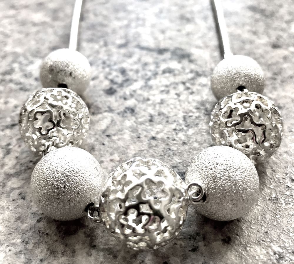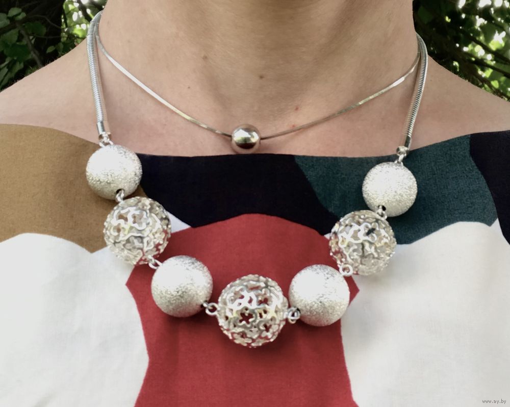 Эффектное колье состоящее из цепочки плетения снейк и бусин-шариков двух видов. Колье изготовлено из медицинской стали и покрыто серебром 925пр. Длина с застежкой 46см, сахарные шарики диаметром ~1,5см, резные~1,7см. Состояние хорошее.