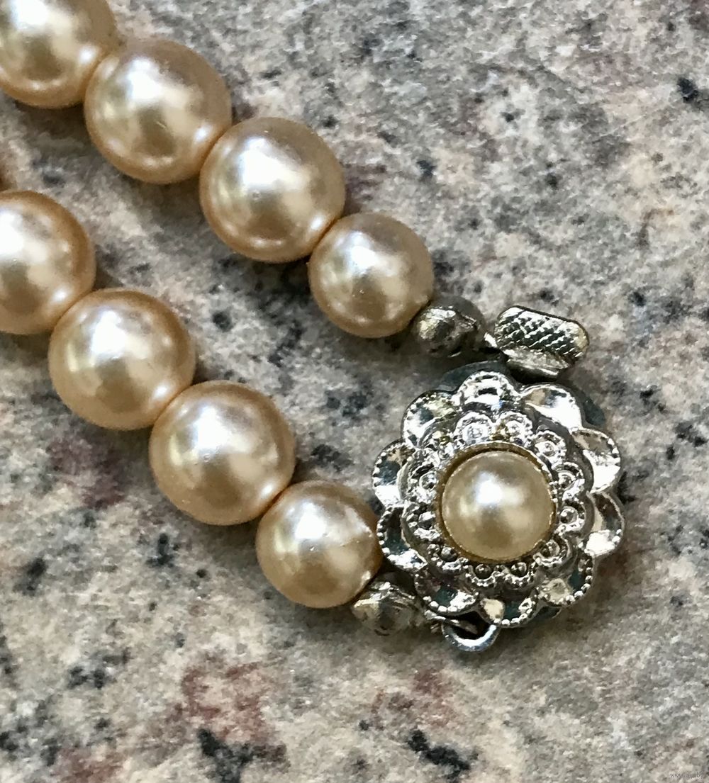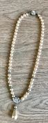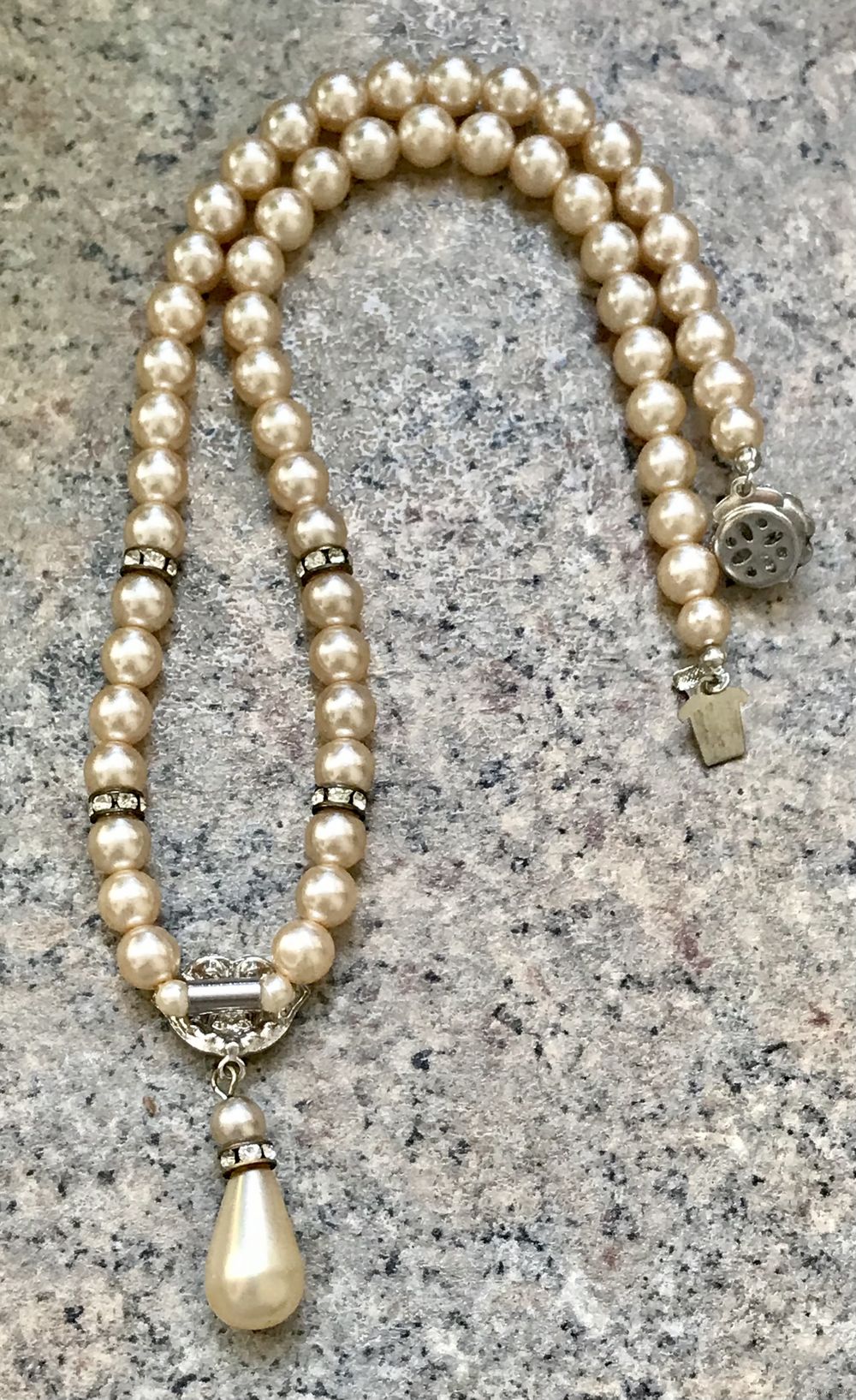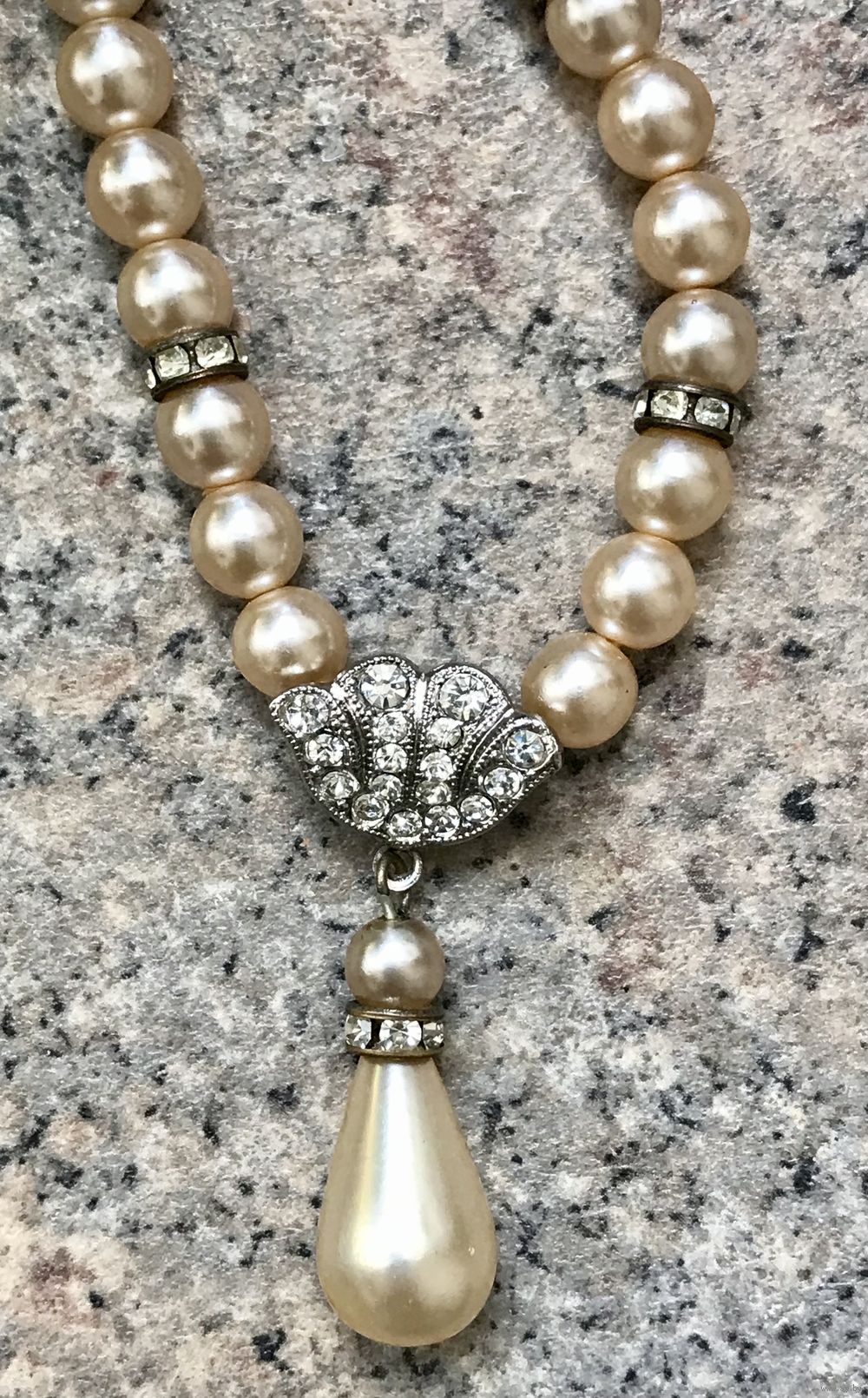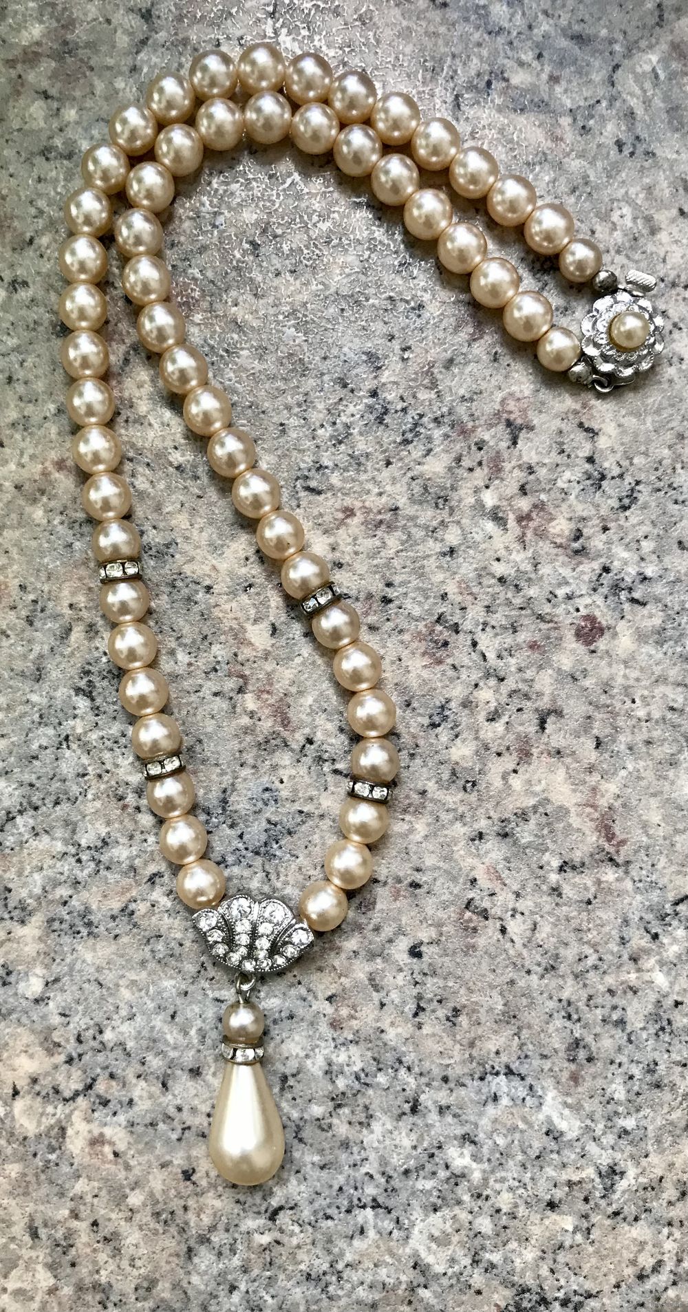 Винтажное чешское колье из жемчужных бусин (имитация из стекла с покрытием под жемчуг). Длина 42см., высота подвески 4см. Состояние хорошее.