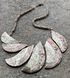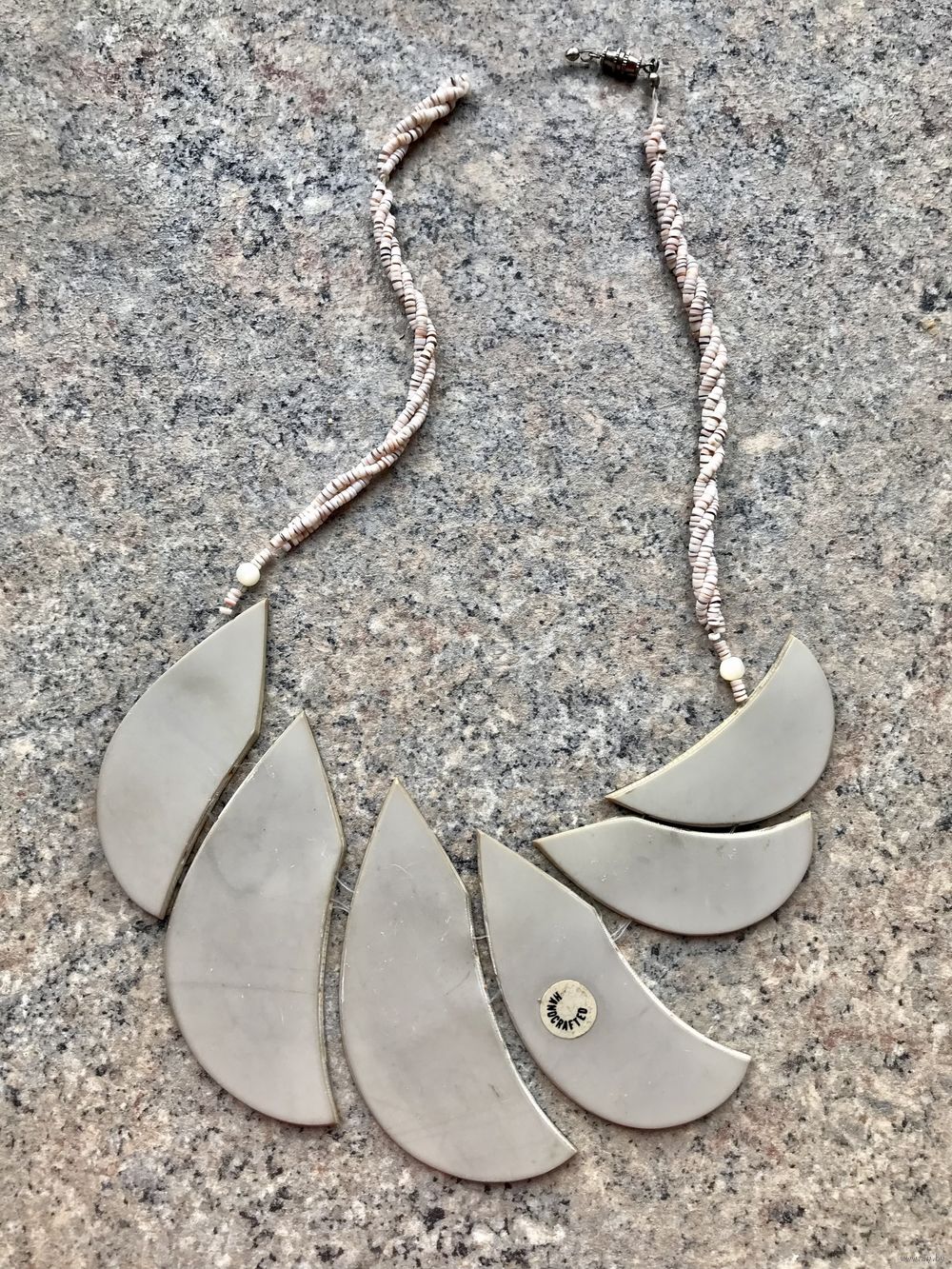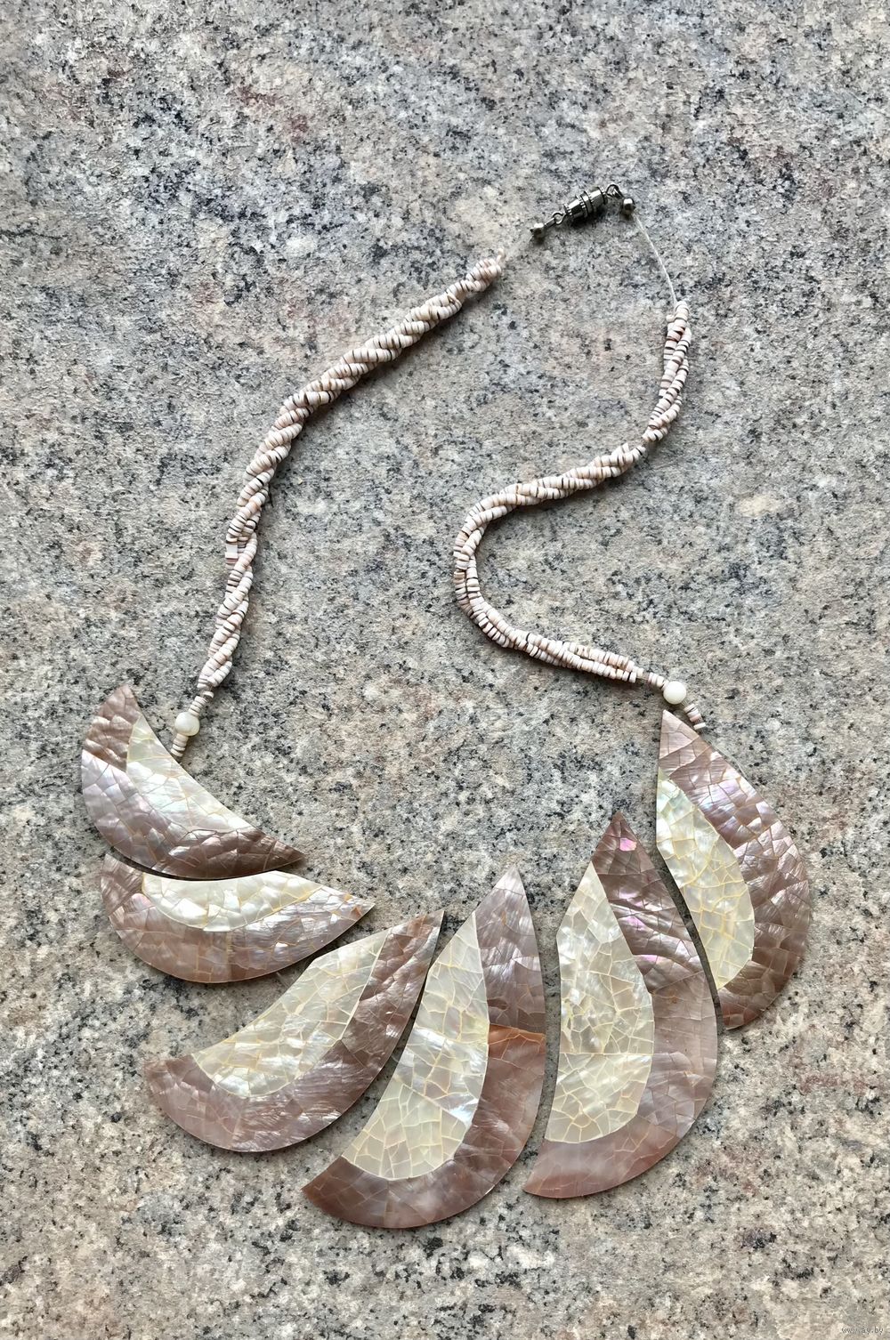 Винтажное крупное колье с основой из плотного пластик, лицевая сторона украшена кусочками перламутра. Длина украшения 54см. На обратной стороне имеется наклейка с надписью HANDCRAFTED, что означает, что украшение сделано вручную. Состояние хорошее.