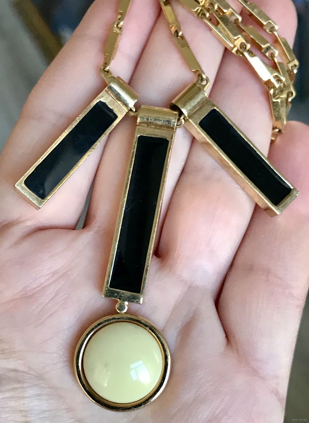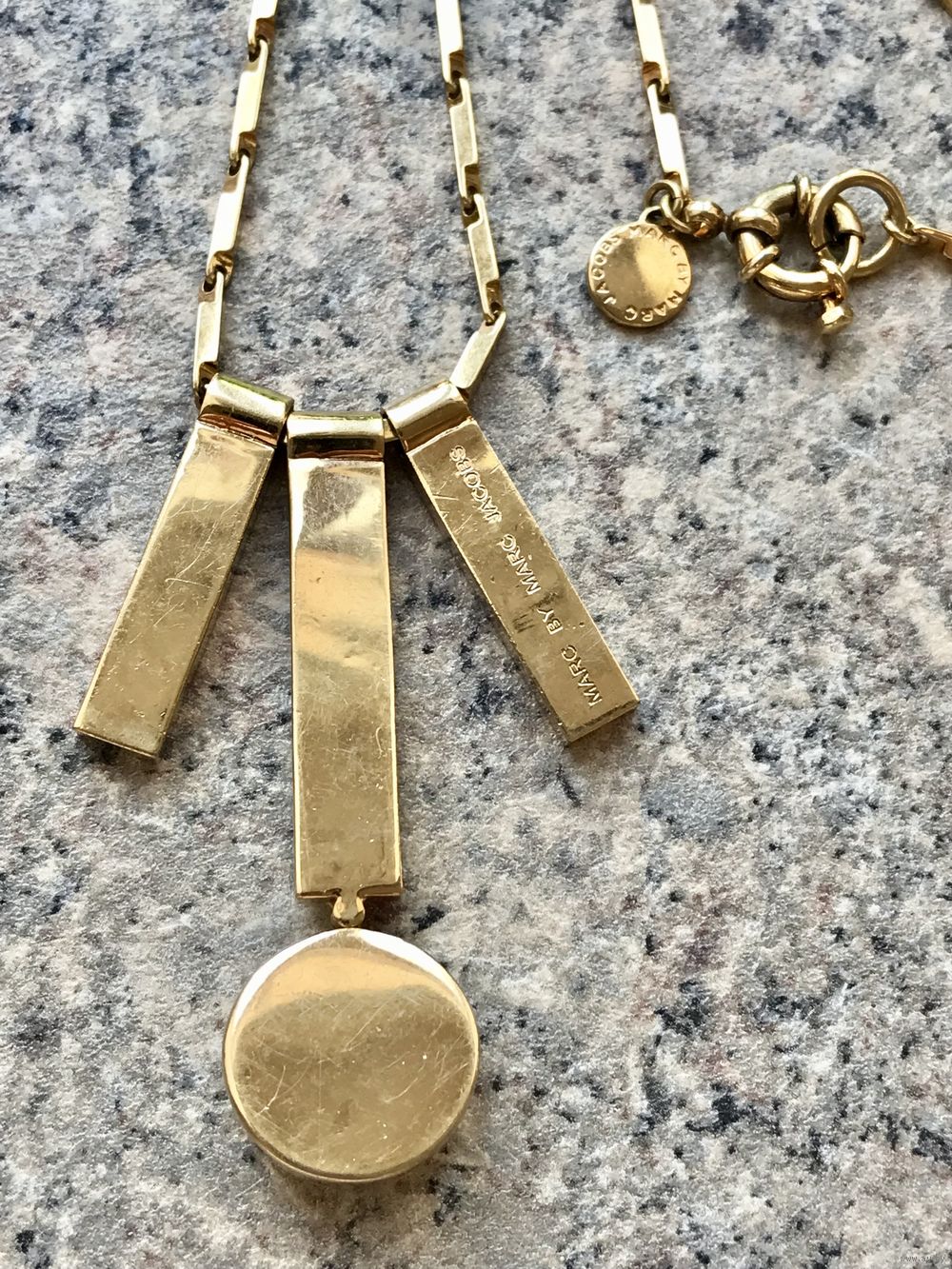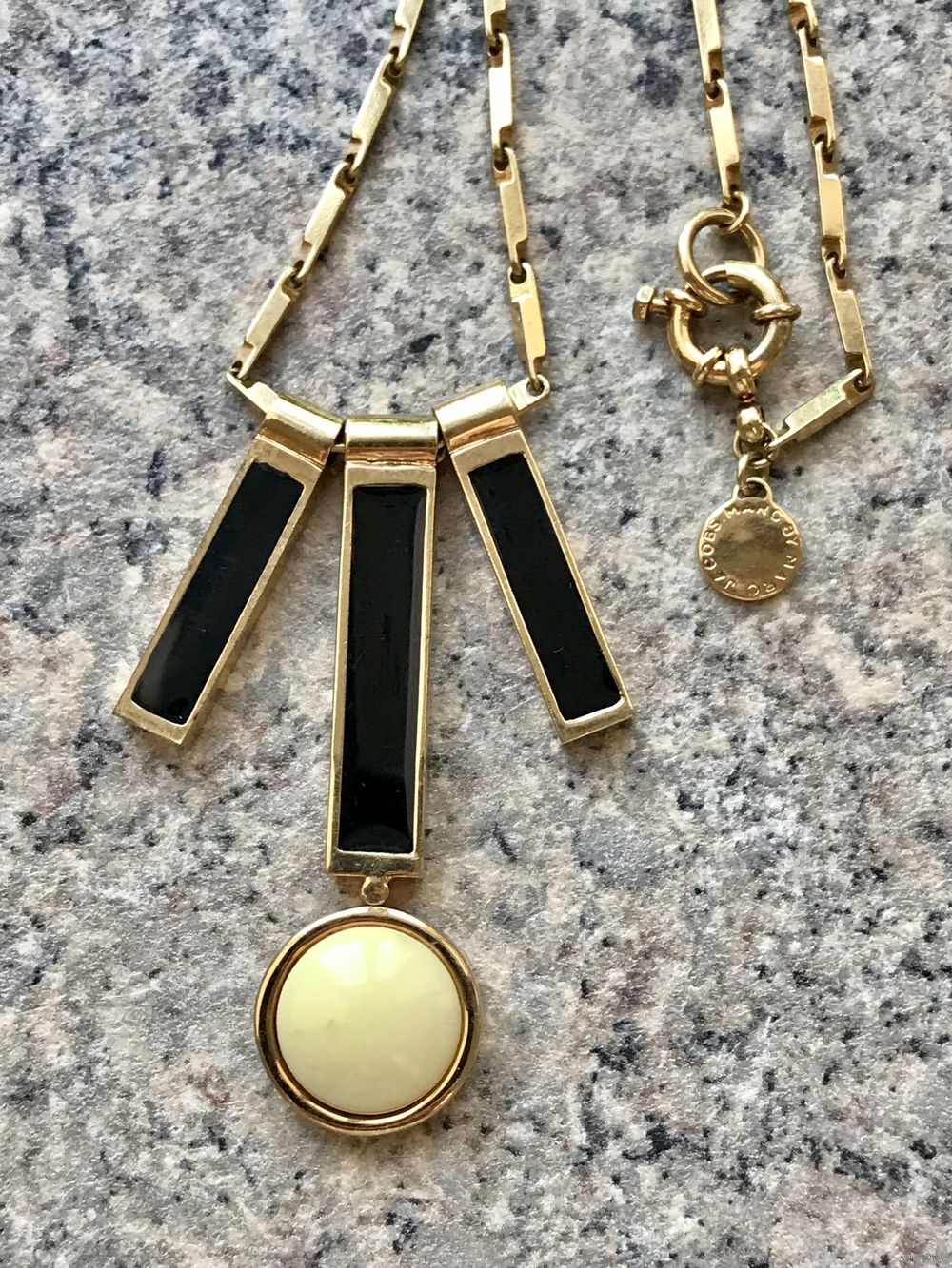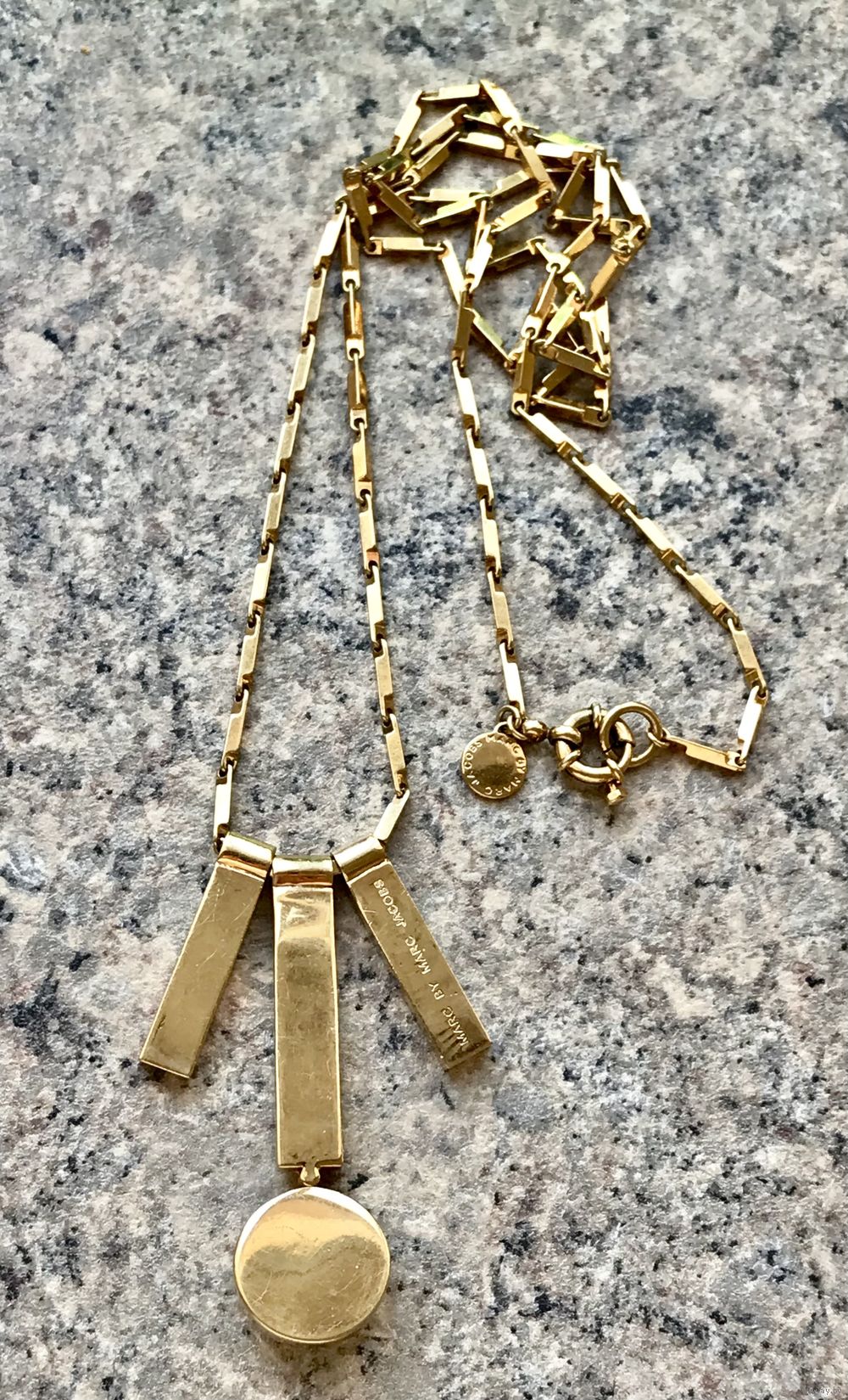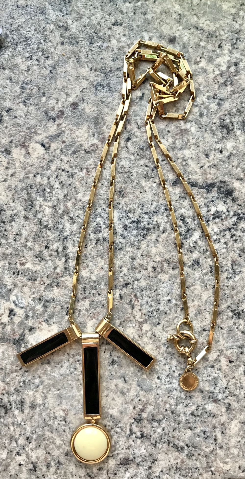 Эффектное украшение от одного из самых влиятельных американских модельеров Марка Джейкобса (Marc Jacobs). Колье изготовлено из металла золотого тона, подвески с лицевой стороны украшены эмалью чёрного цвета и элементом из плотного пластика. Длина цепочки 84см., высота центральной подвески 6см., присутствуют незначительные следы бытования. Маркировано.