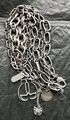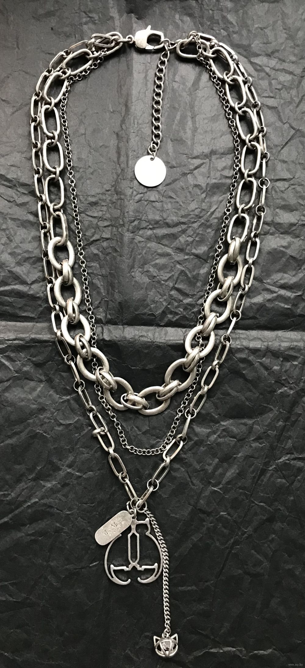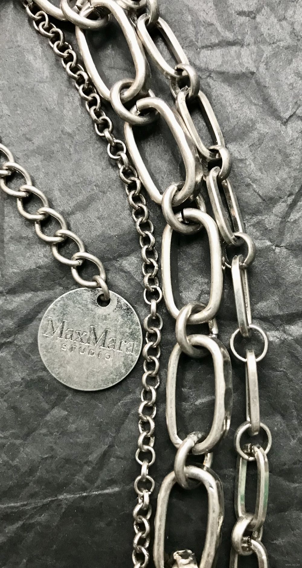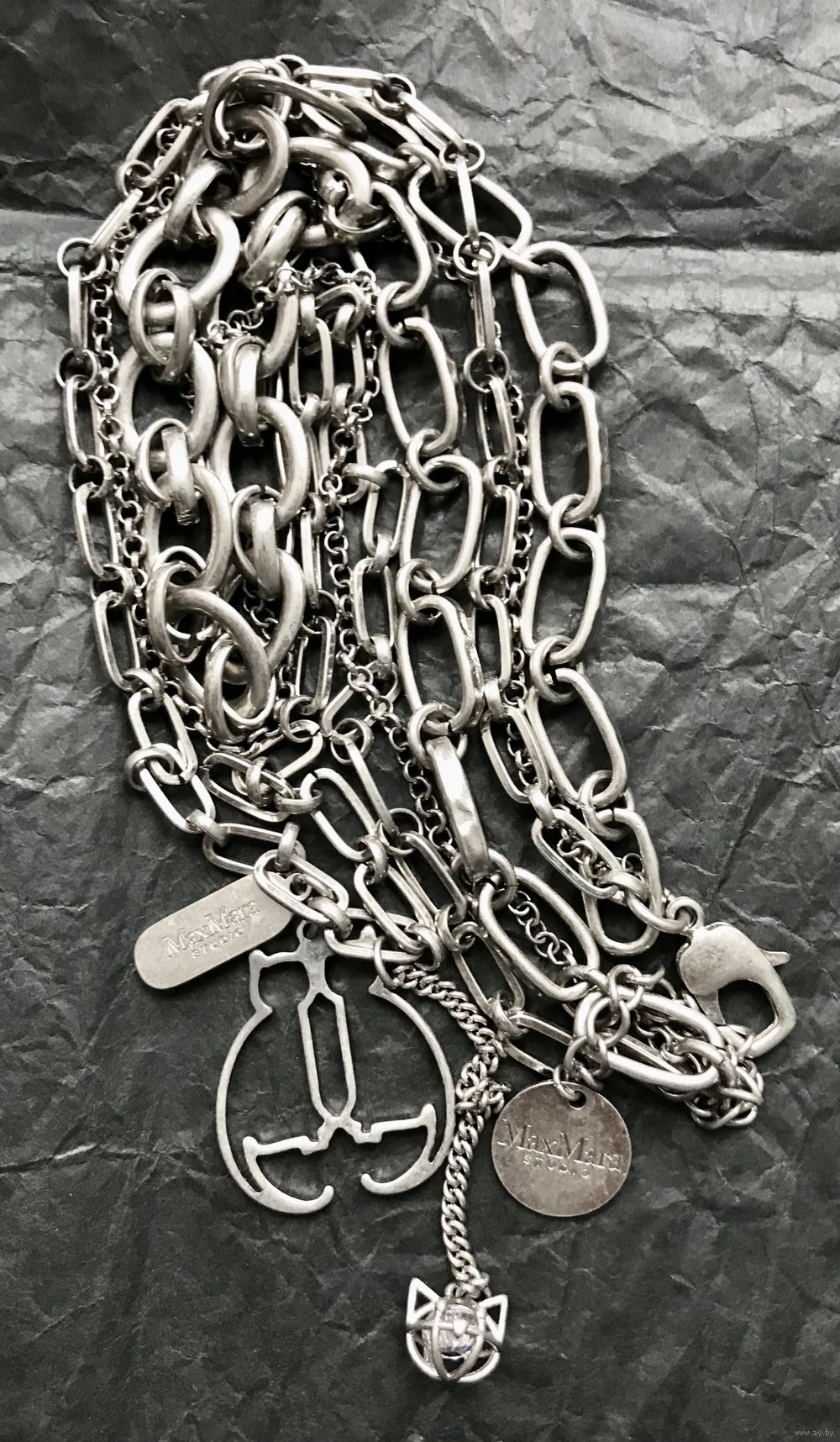 Трёхрядное колье Lacrima из коллекции MaxMara studio (линия бренда MaxMara). Изготовлено из металла цвета серебра. Длина верхней цепочки 46см., нижней 56см. Разъёмное. Состояние хорошее. Маркировано.